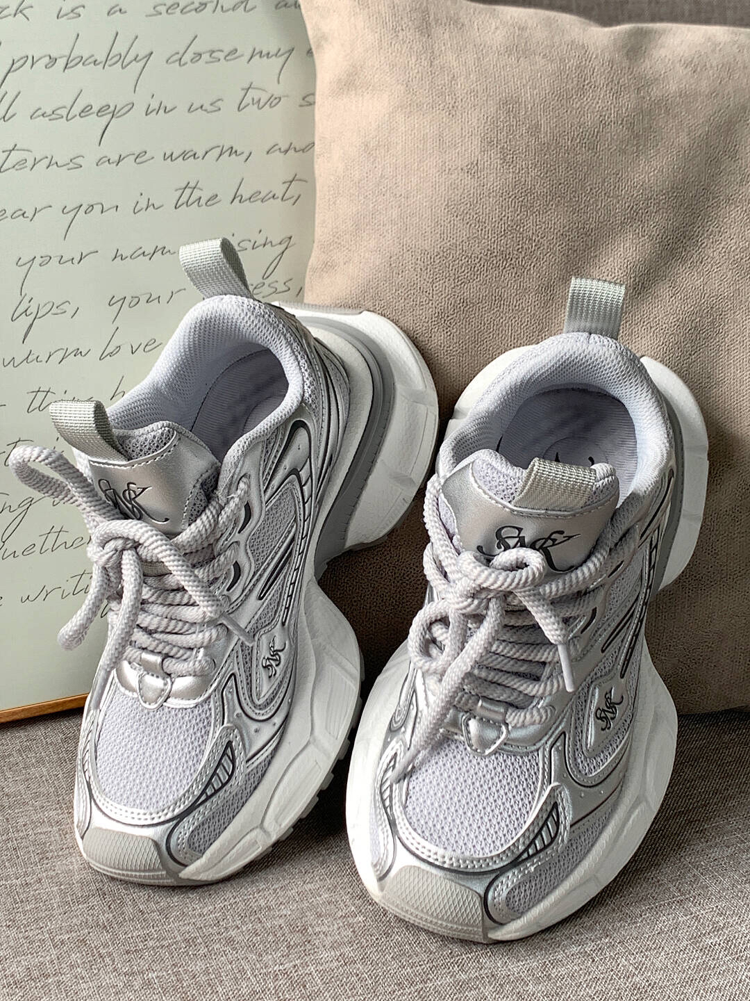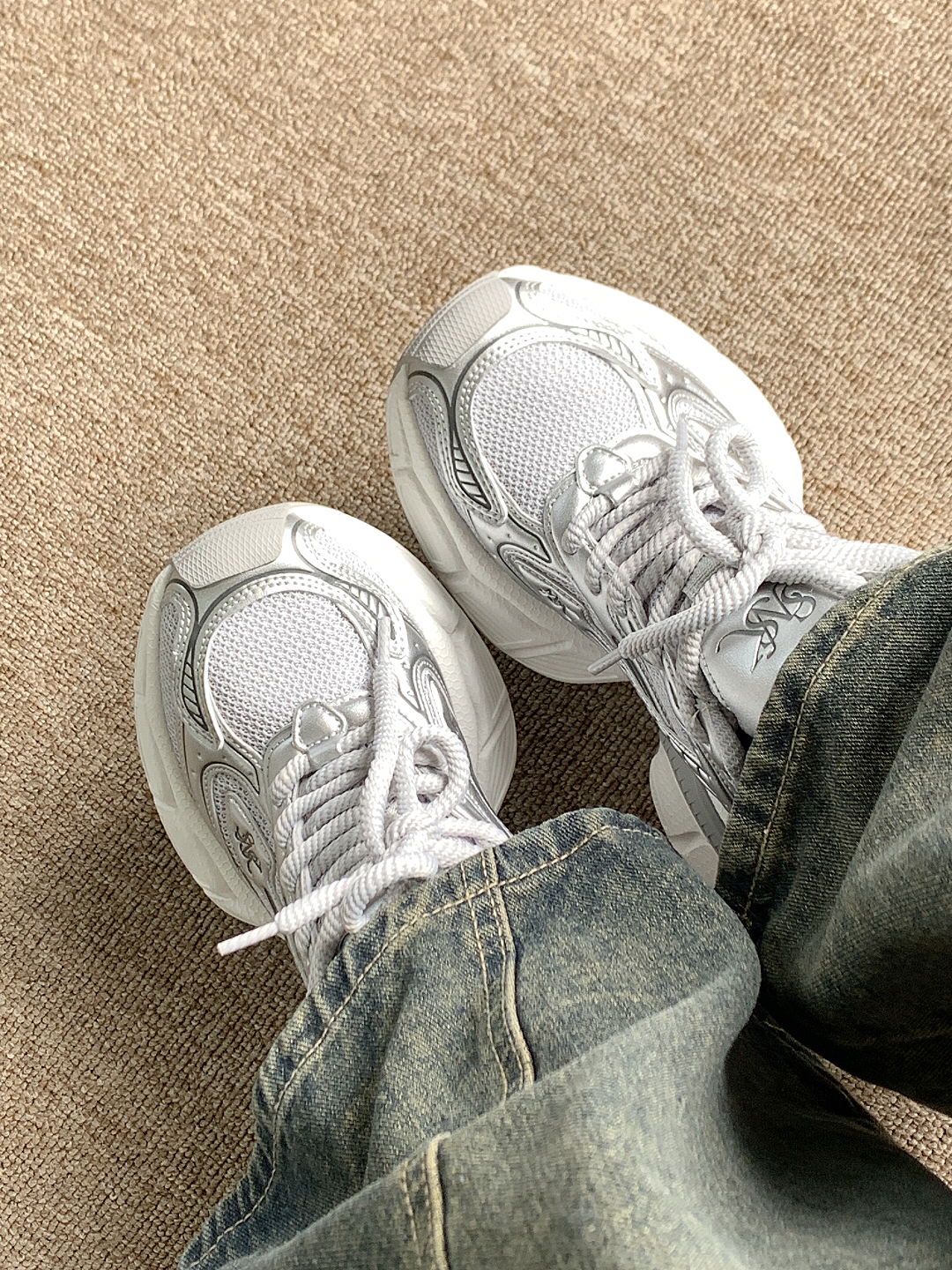 这对鞋银灰配色好好看呀! 是那种复古又高级的感觉 圆月弯刀的设计吼特别 怪不得被同事夸! 穿起来那是一个轻便舒适 逛街一整天不累 蹦哒追公交都带劲 厚厚的底瞬间把腿的比例拉长了 休闲或者运动风格穿搭就ok 高级感满满~ 🌟鞋底防滑设计 所以下雨天☔️也可以闭眼穿 不偏码不偏码 喜欢老爹鞋的bb不要错过呀