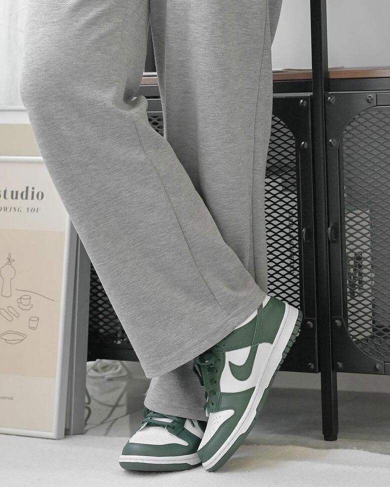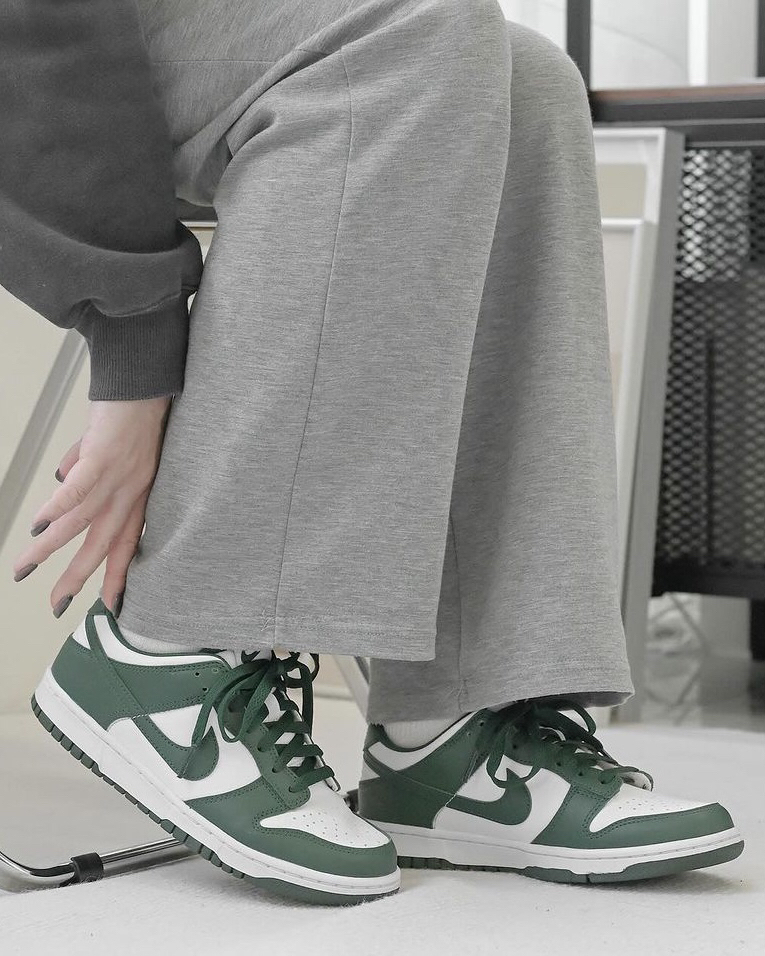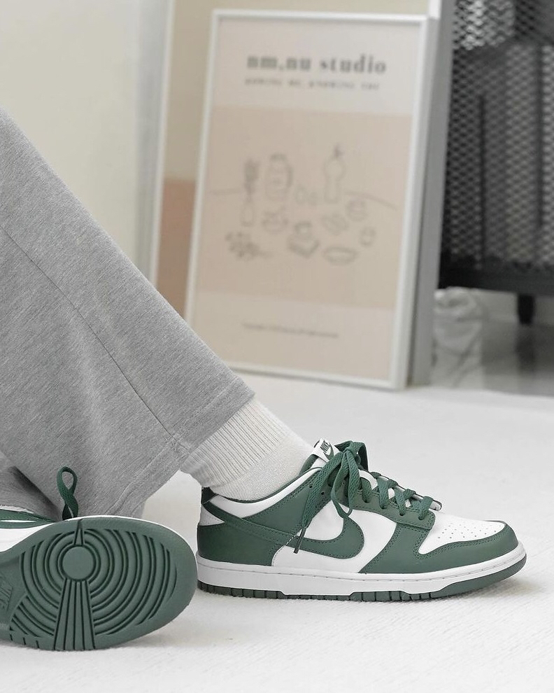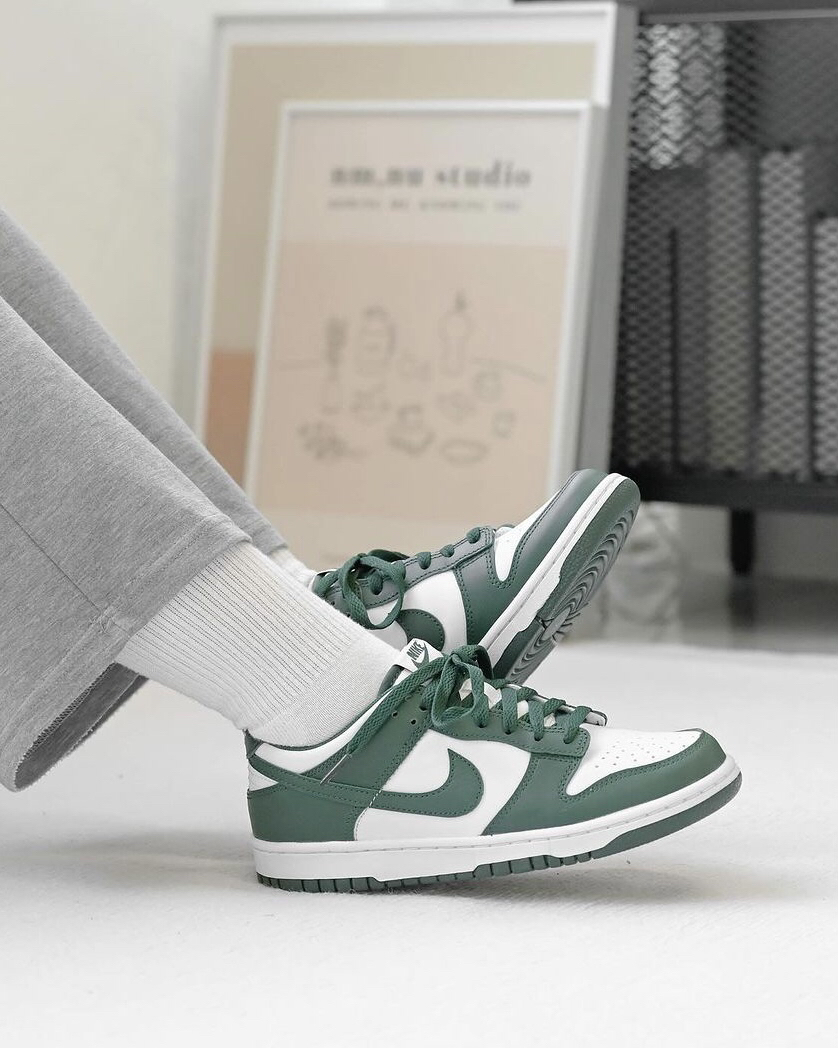 这双白绿配色的低帮Dunk确实上脚有一种莫名的好看,白绿色的皮革鞋面,穿起来还是蛮舒服的,很适合春夏季的穿搭,但整体的脚感也是偏硬了一些,刚开始上脚会有点不习惯。需要时间磨合。