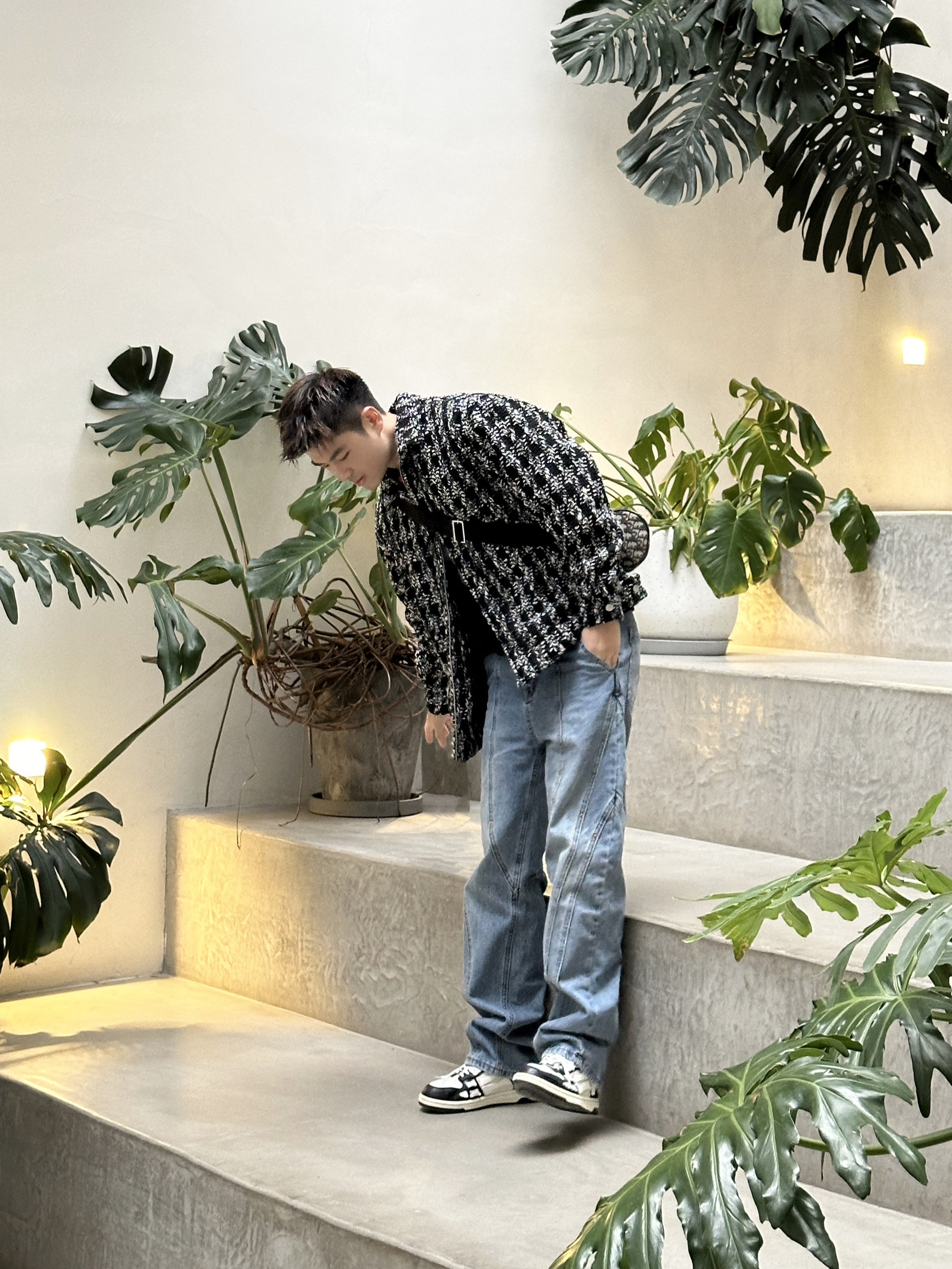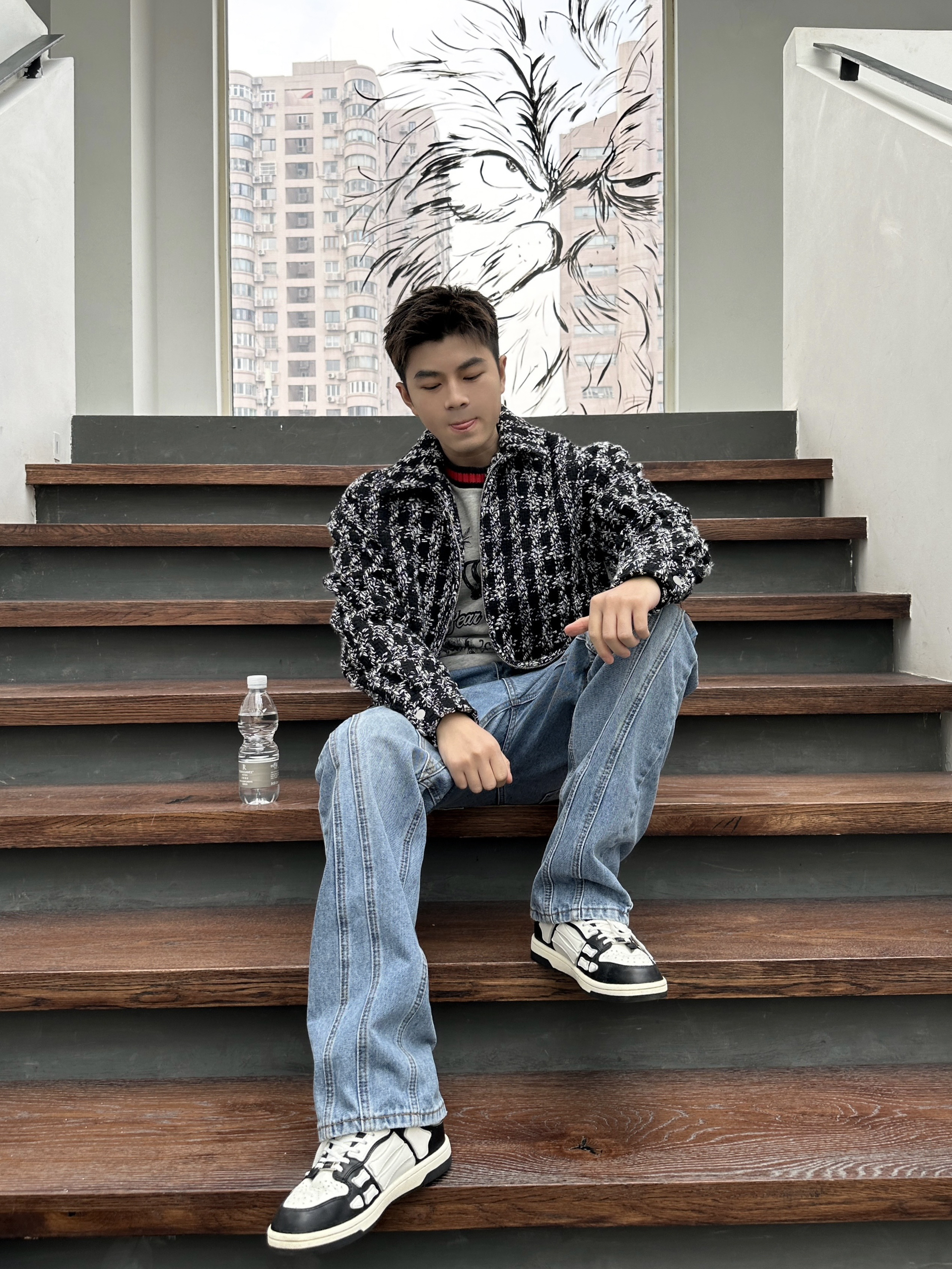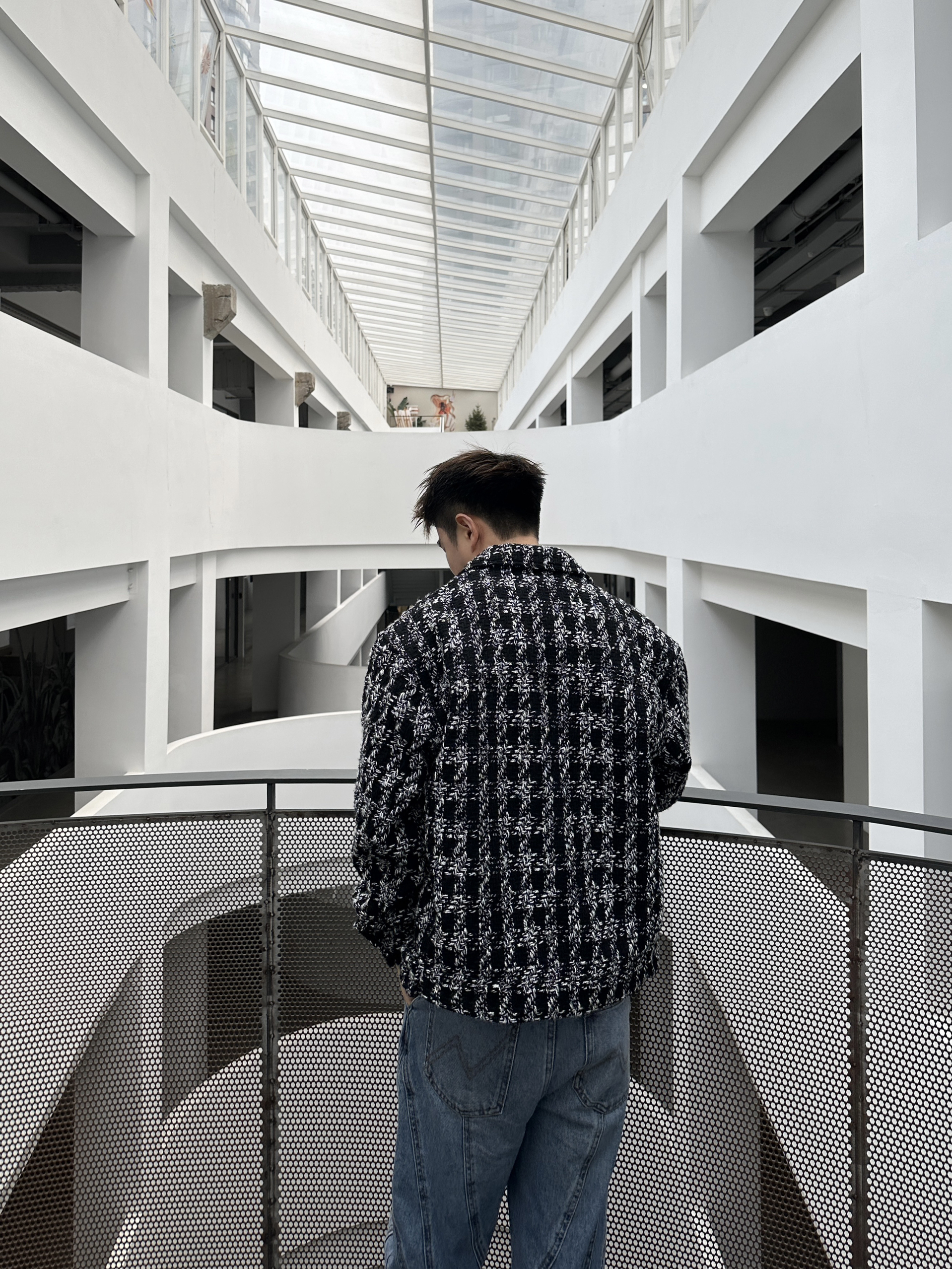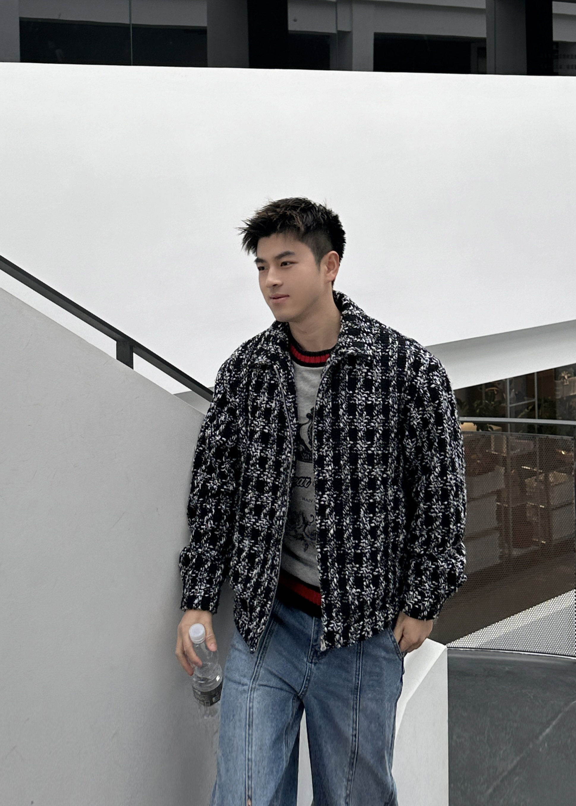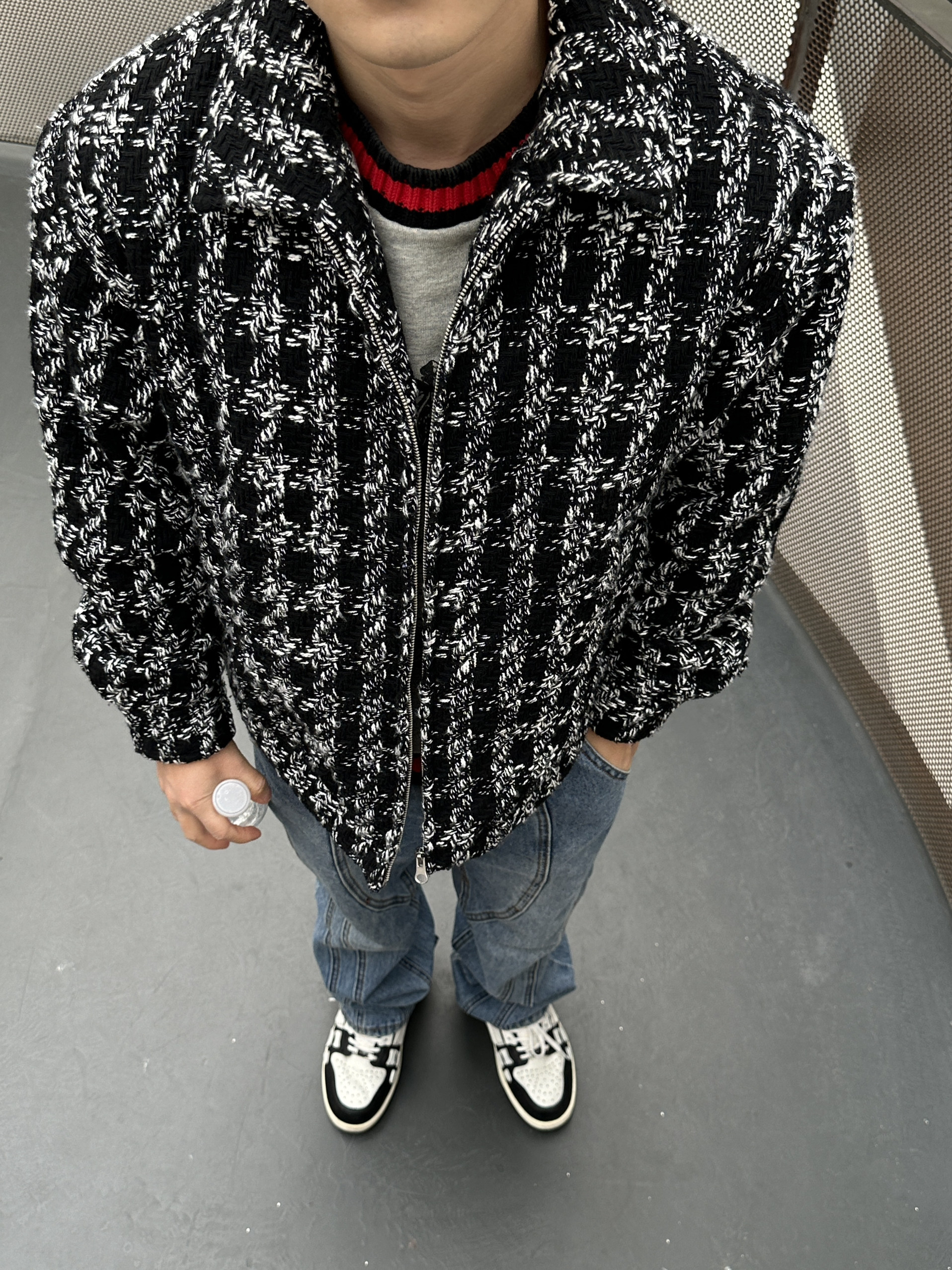 第一次尝试小香风外套。小香风真的很潮很好看! - 外观没有太多的设计元素,简约利落的短款廓形就足够让它上身好看。柔软亲肤的黑白色毛衫质感。 我的内搭灰色毛衣,下身浅色牛仔裤,再搭配上我最喜爱的一双骨头鞋。休闲、简约的同时,不缺乏时尚洋气。