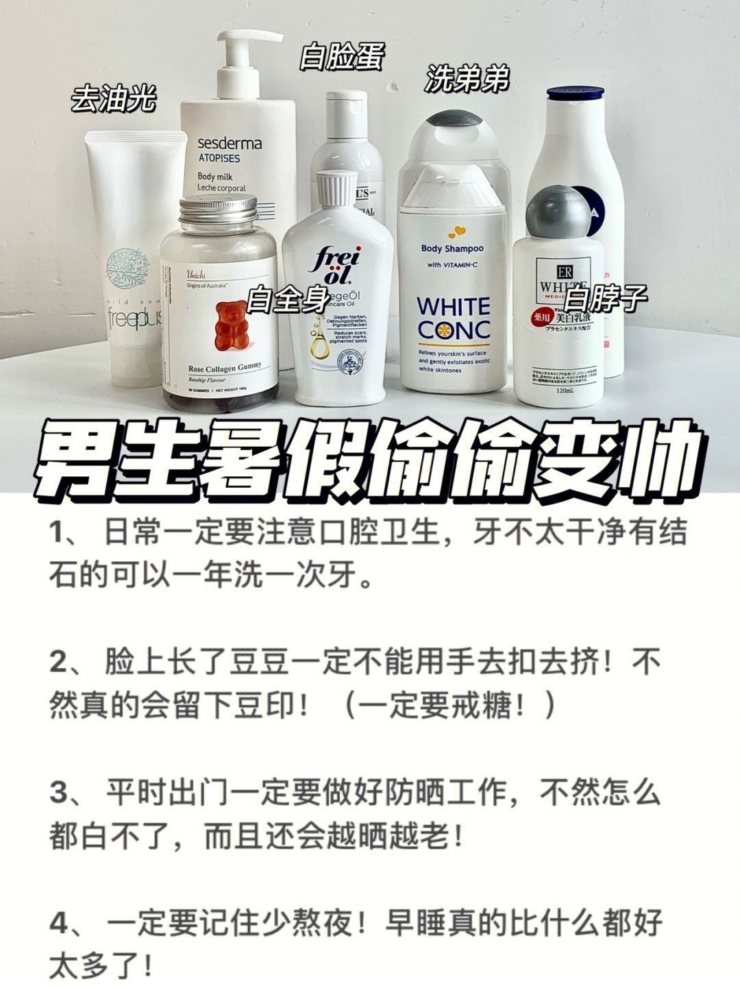 作为一个资深的油痘肌,在护肤这条路上踩了太多雷了 后面跟着博主学早c晚a护肤,坚持下来皮肤变化真的很大 几乎不怎么出油冒痘了,皮肤还很清爽白净! 把我自己在用的护肤品和使用感受都分享出来了 有需要的兄弟可以码住,亲测好用无雷! - 💥乐敦cc+露得清a醇 网上超火的入门级早c晚a组合,逆袭妈生好皮全靠它! 早上用cc精华减少皮肤暗沉,晚上用a醇嫩肤细毛孔 一段时间下来皮肤嫩滑细腻不要太多! - 💥...