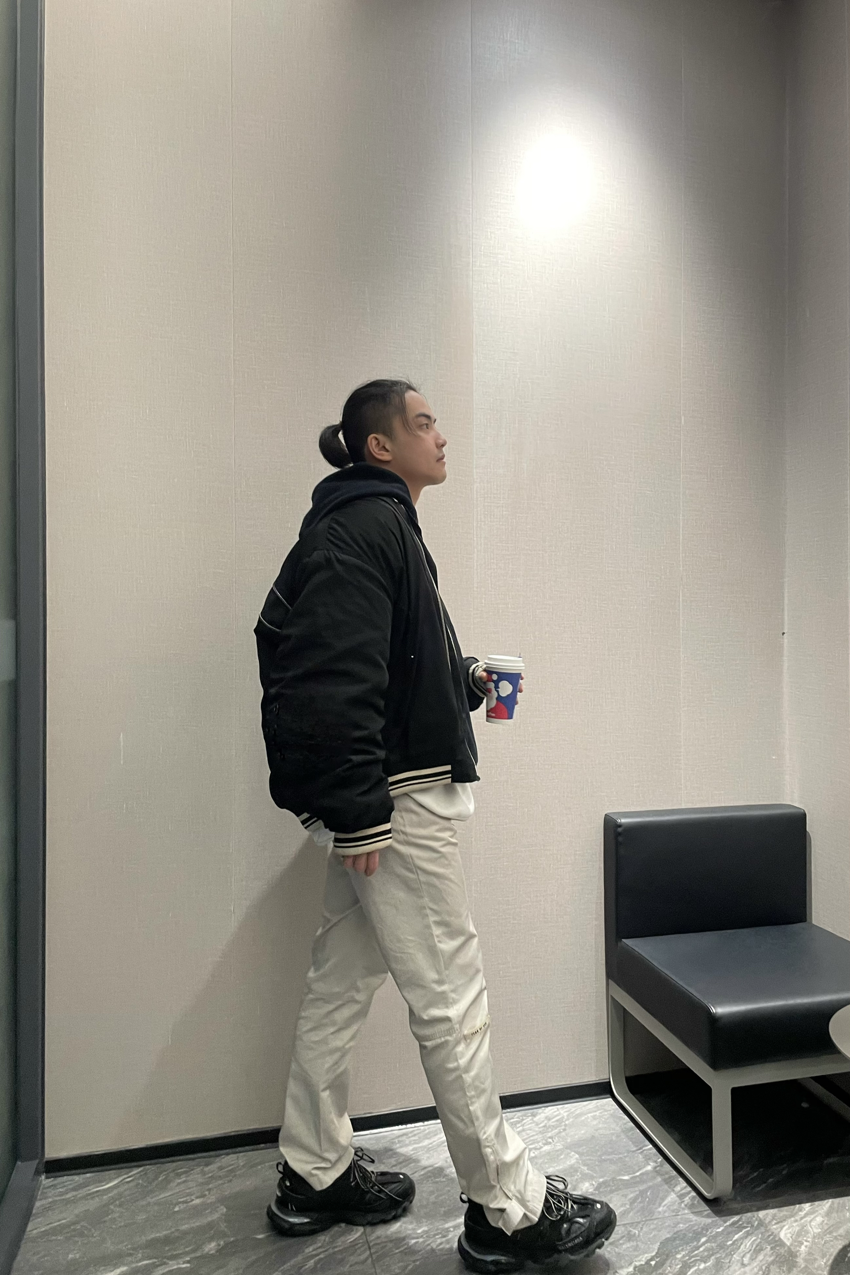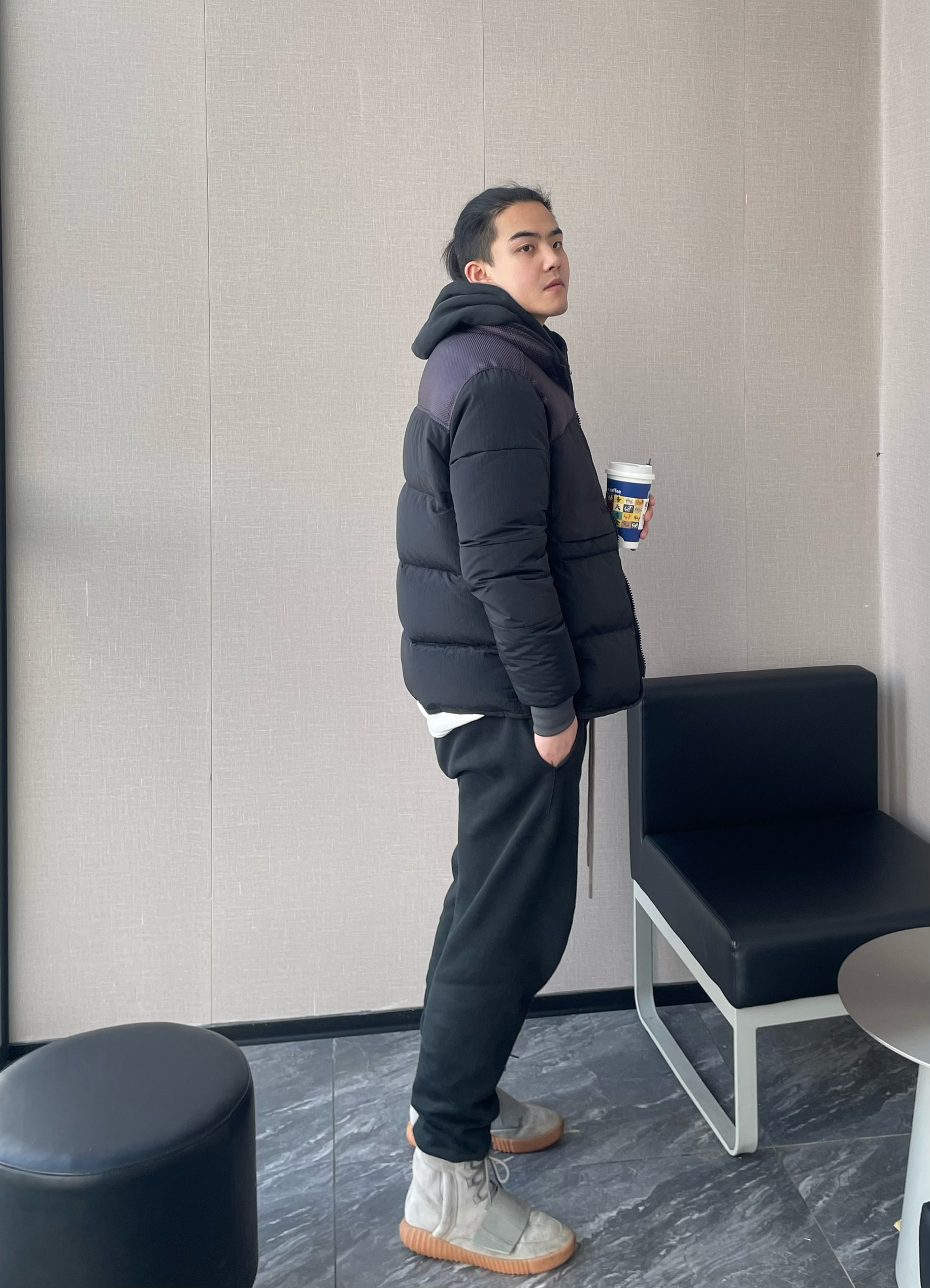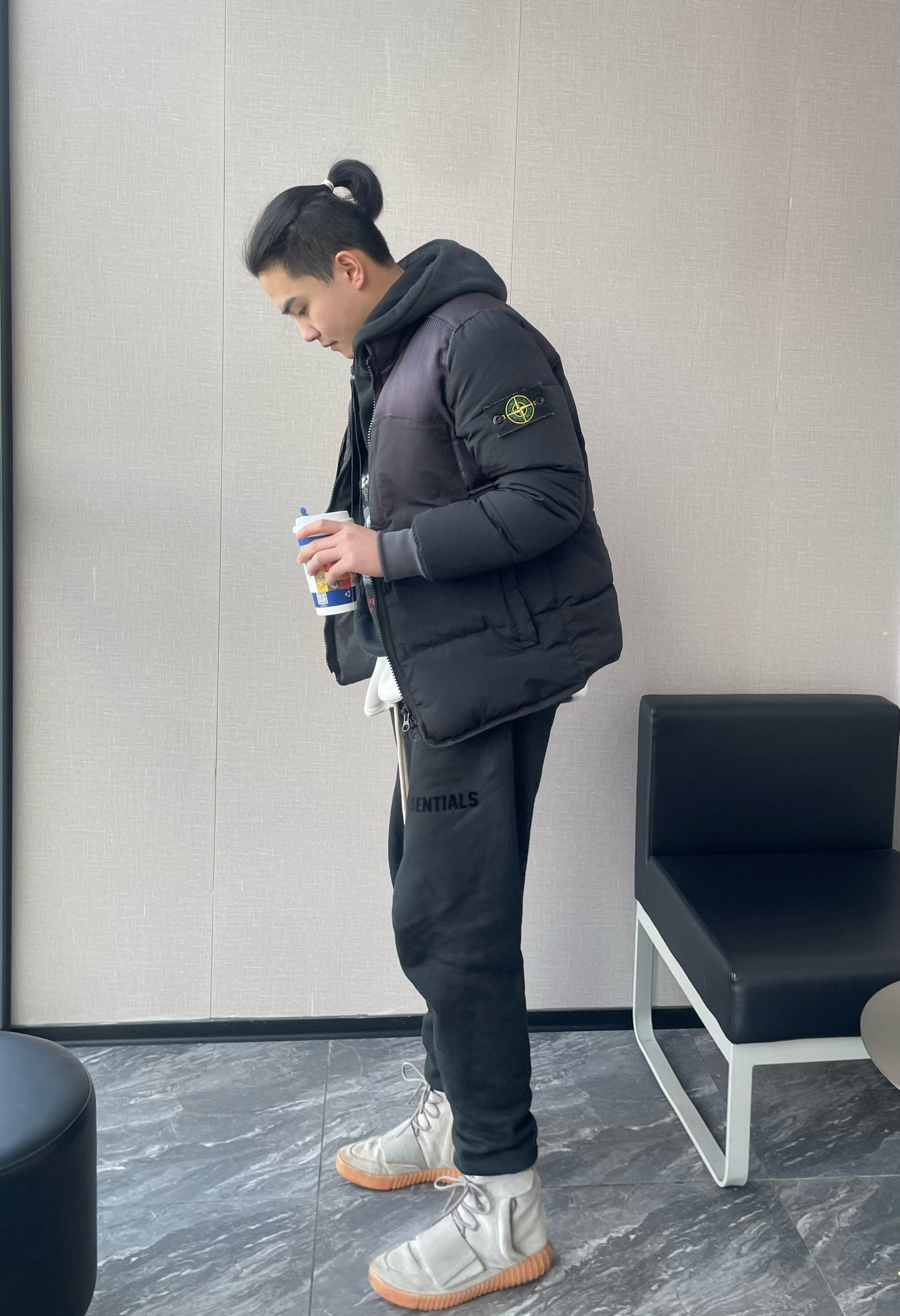 👔:卫衣Represent鲨鱼卫衣🦈 外套Stone Island尼龙拼接羽绒服 👖:FEAR OF GOD Essentials SS23暗黑系列抽身长裤 👟:Adidas Yeezy 750 (FOG的裤子基本都是是加绒的 冬季搭750这种高帮鞋简直绝配 对我这种粗腿boy讲实话很友好 裤脚有堆积感 保暖又靓仔!)