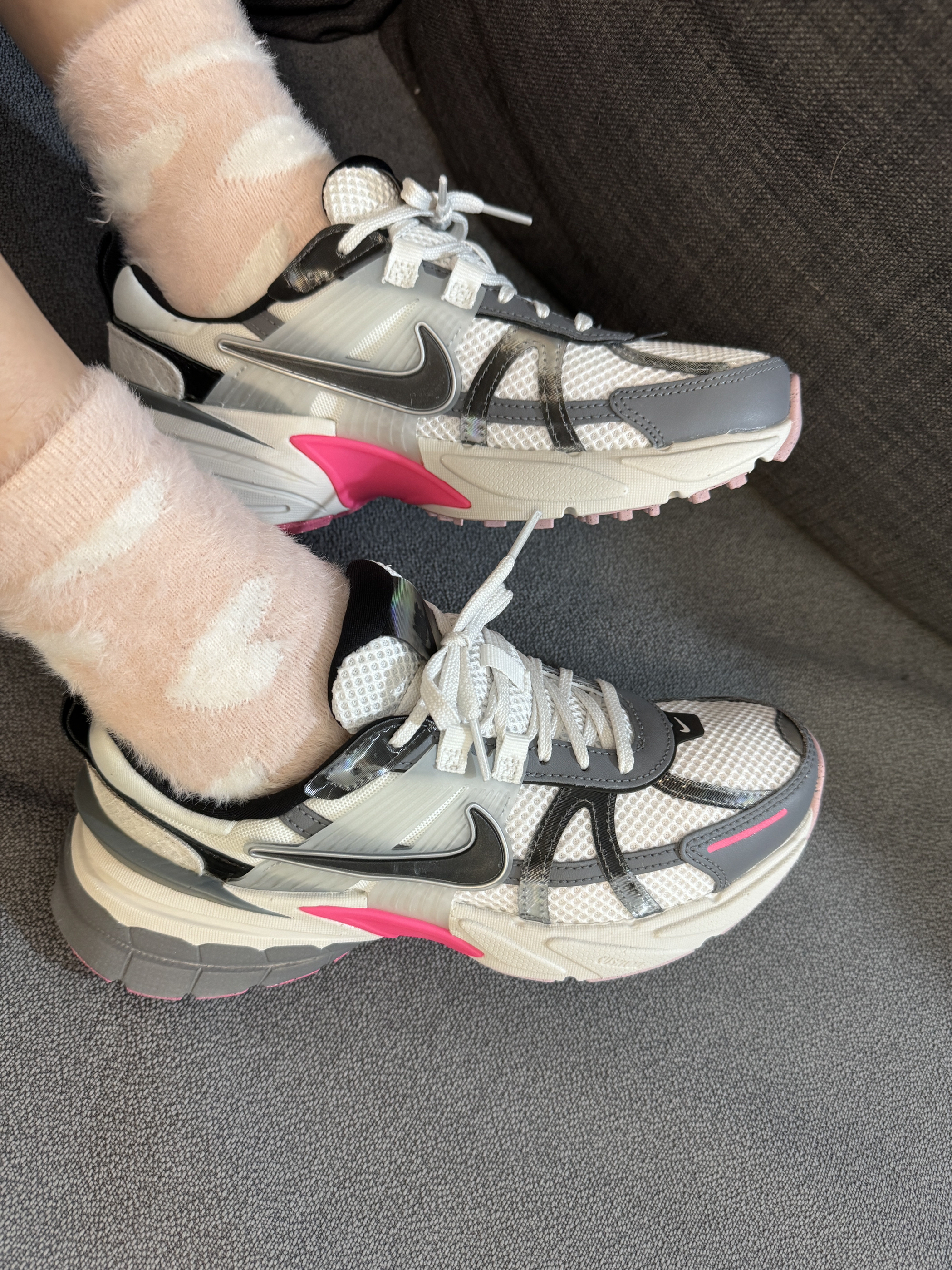 回忆一下,真的好久没有买鞋了 这双鞋子一眼相中,分享一下 作为一双龙年新配色,相对大红大紫他还是比较低调的 颜色白灰粉为主,很适合日常穿搭 鞋底的粉色也是很戳我心 鞋子很轻,继承了部份老爹鞋元素 鞋底有增高,后跟有点突出,更前卫 鞋面比较低,如果你是脚背高或者比较肉的脚可以买大一号 性价比还是很高的,学生党也很适合