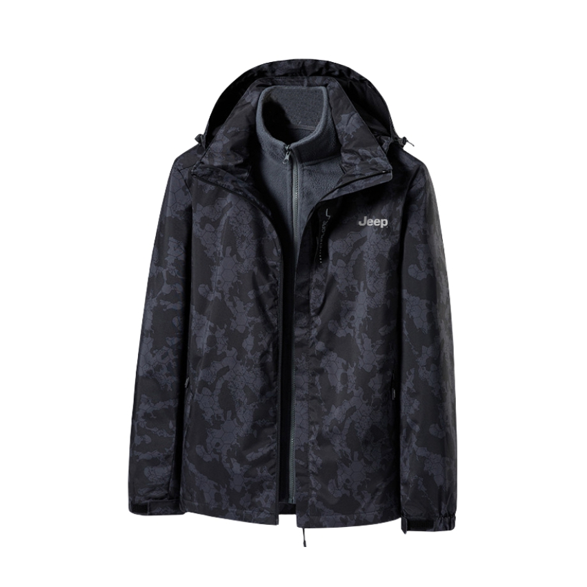 本篇笔记关联了Jeep/吉普 机能风满印防风防水透气可拆卸内胆抓绒内胆三合一连帽冲锋衣 男女同款 P834MWF123 纯黑等商品,为用户提供真实的使用体验和购买参考。
