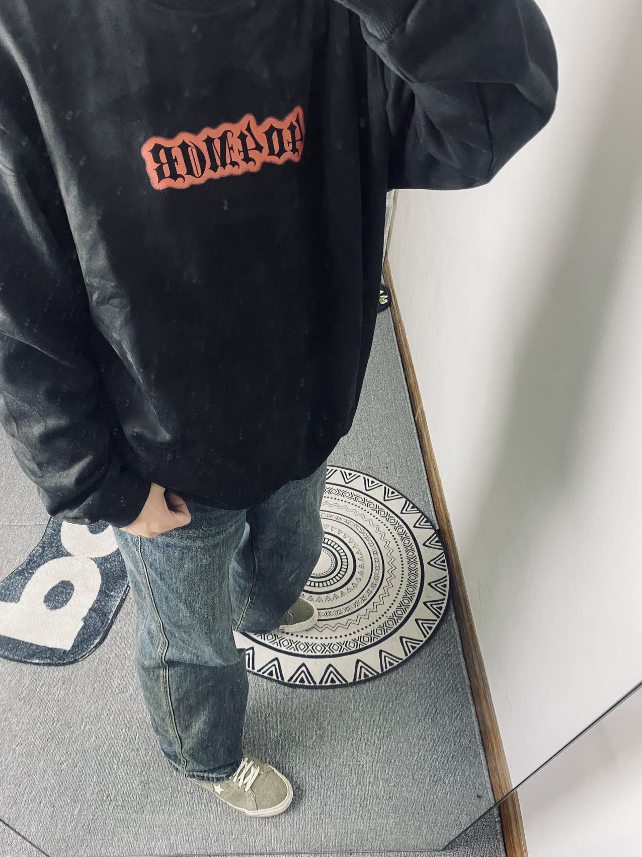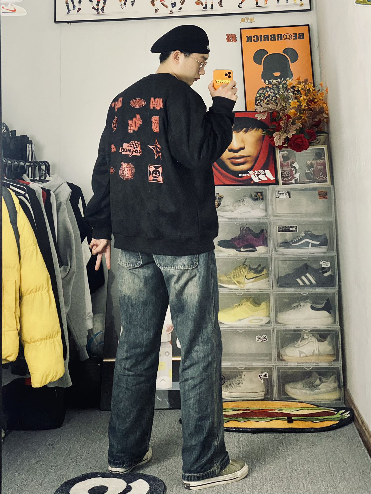 ‼️冰美式今日穿搭 👔衣服是一件404美式撞色logo圆领卫衣 黑红配色的卫衣个性十足 麂皮绒的面料上身舒适 版型偏宽松💥 — 👖衣服穿了一条水洗复古蓝牛仔裤 宽松直筒的百搭版型 — 👟匡威板鞋 上脚舒适 鞋底软 青苔绿的配色低调不容易出错 身高/体重:178/130 👔xl