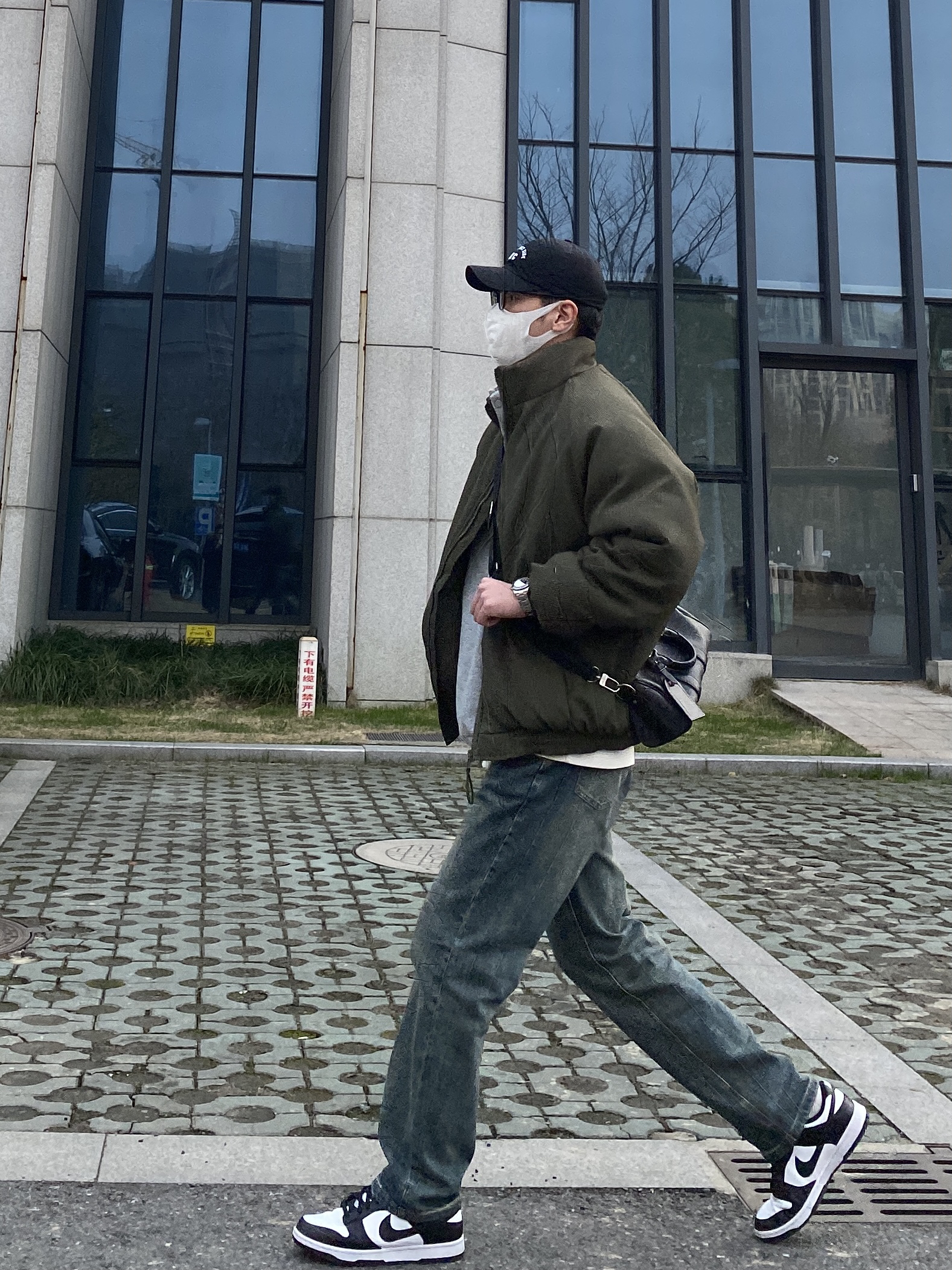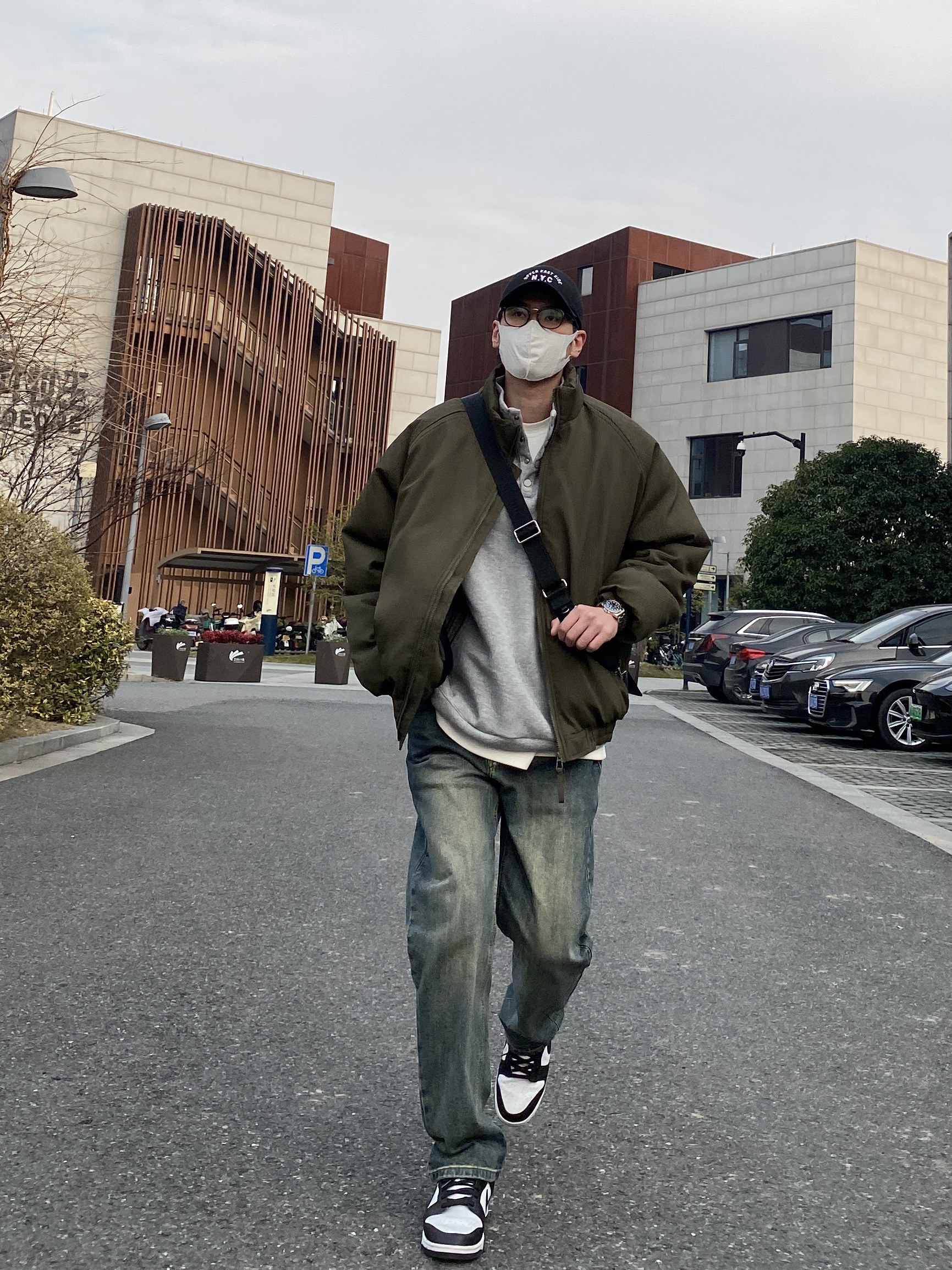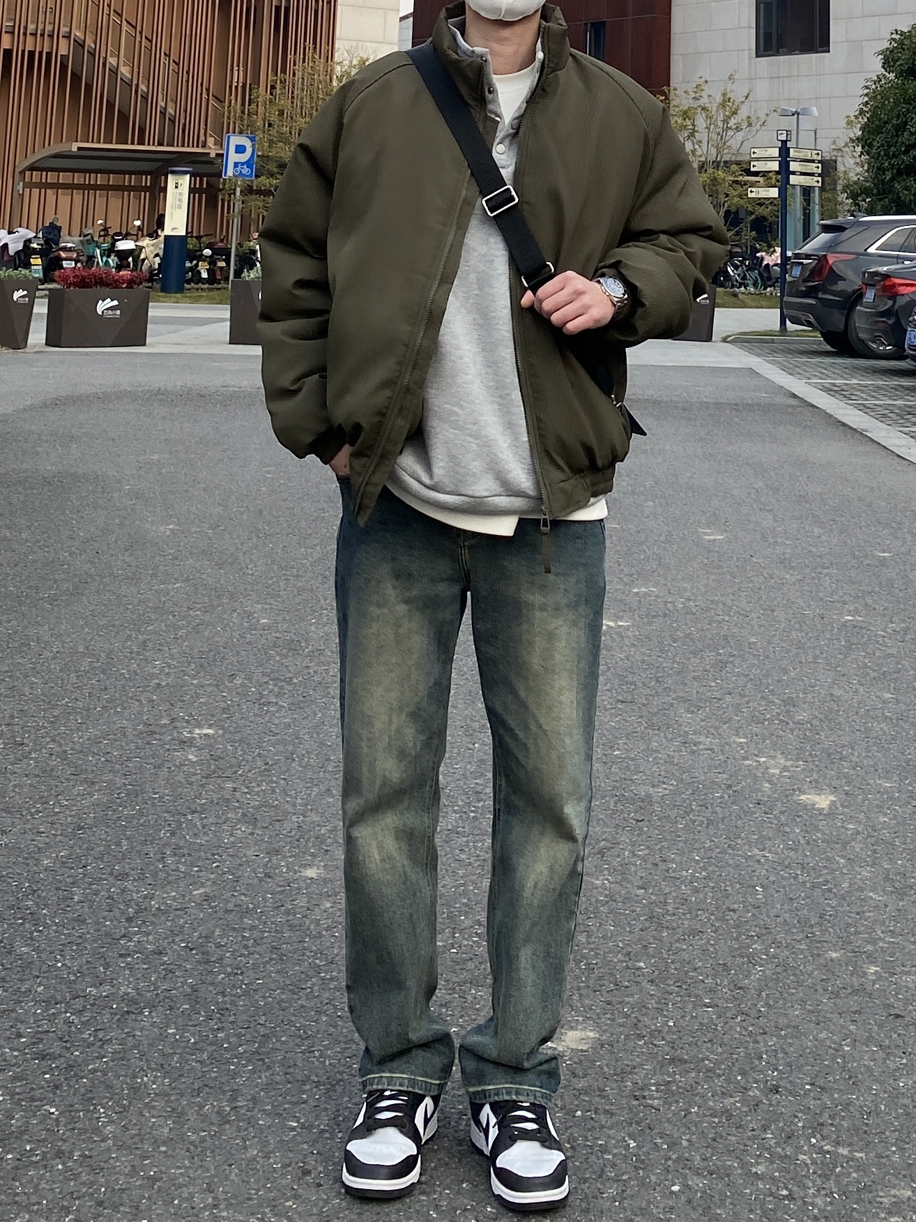 今天这套先用浅灰色刺绣立领卫衣做内搭,裤子选择不挑腿型的水洗直筒牛仔裤,鞋子上脚经典百搭的黑白熊猫dunk,接着套上军绿色宽松阔版插肩袖立领棉服夹克,最后背一个精致的皮质斜挎包,OK,出门看看搭配效果吧! - 今日穿搭 衣服裤子:NICE LILI 鞋子:timberland