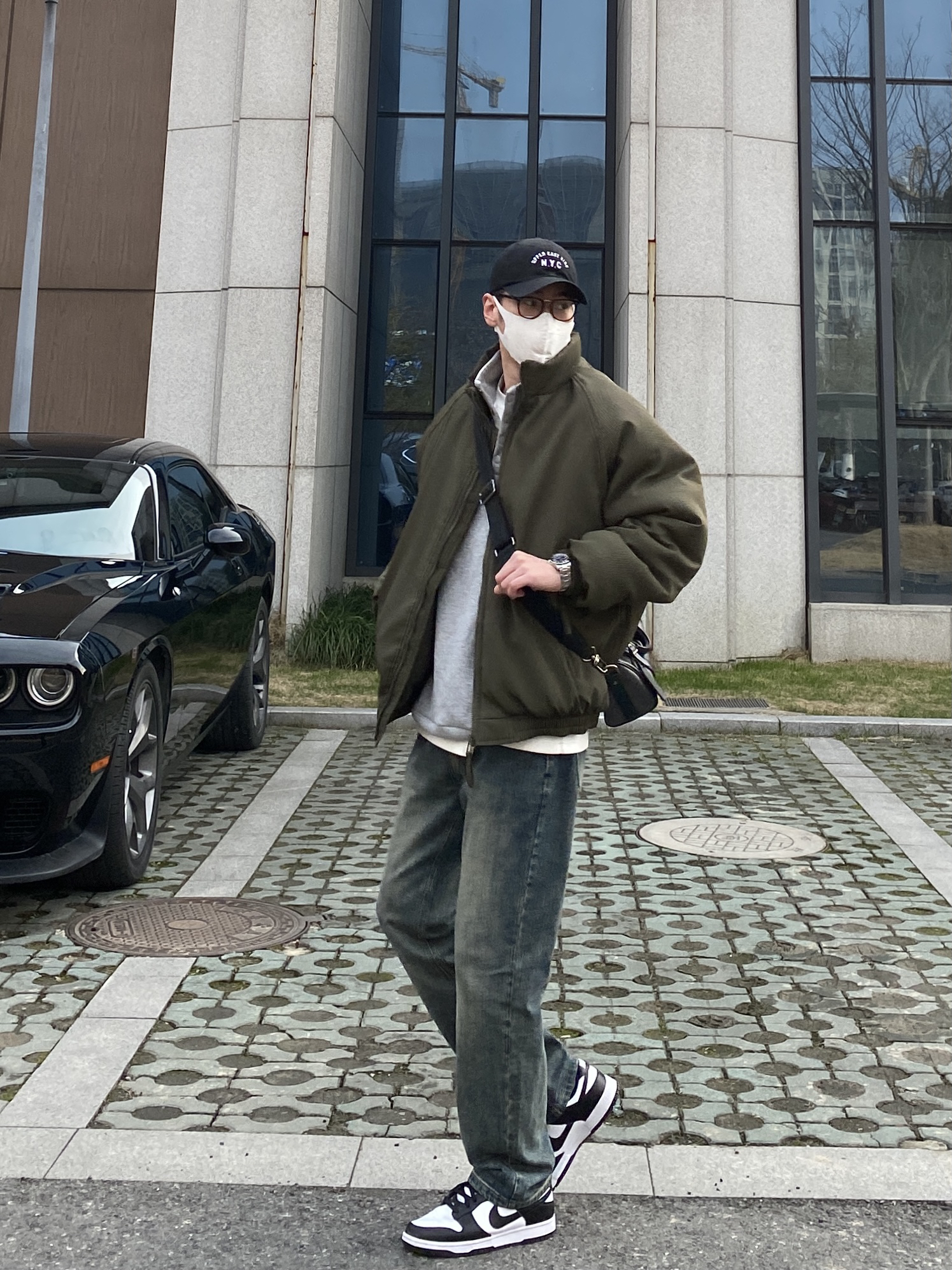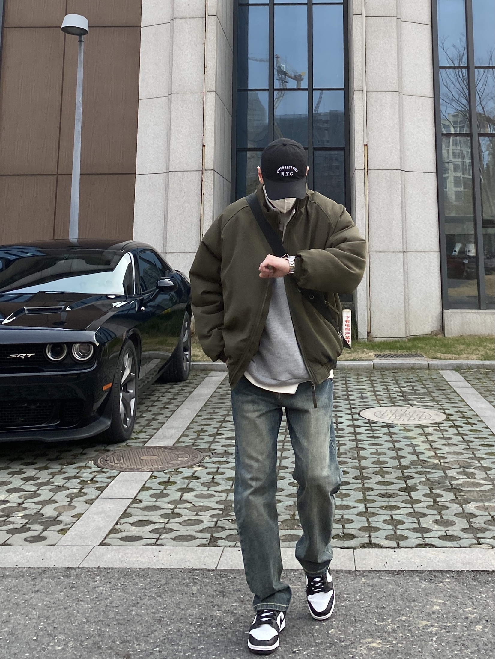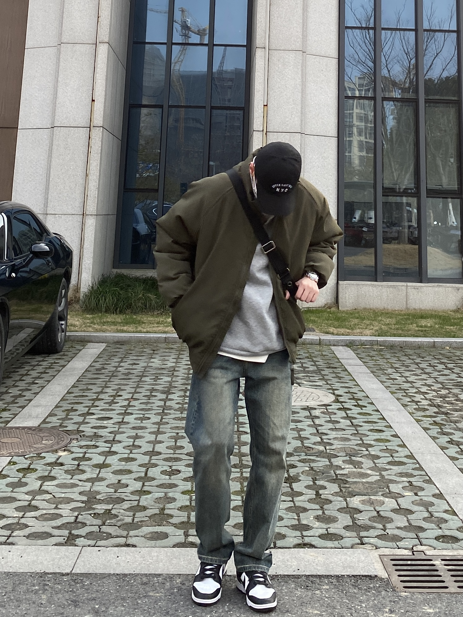 今天这套先用浅灰色刺绣立领卫衣做内搭,裤子选择不挑腿型的水洗直筒牛仔裤,鞋子上脚经典百搭的黑白熊猫dunk,接着套上军绿色宽松阔版插肩袖立领棉服夹克,最后背一个精致的皮质斜挎包,OK,出门看看搭配效果吧! - 今日穿搭 衣服裤子:NICE LILI 鞋子:timberland