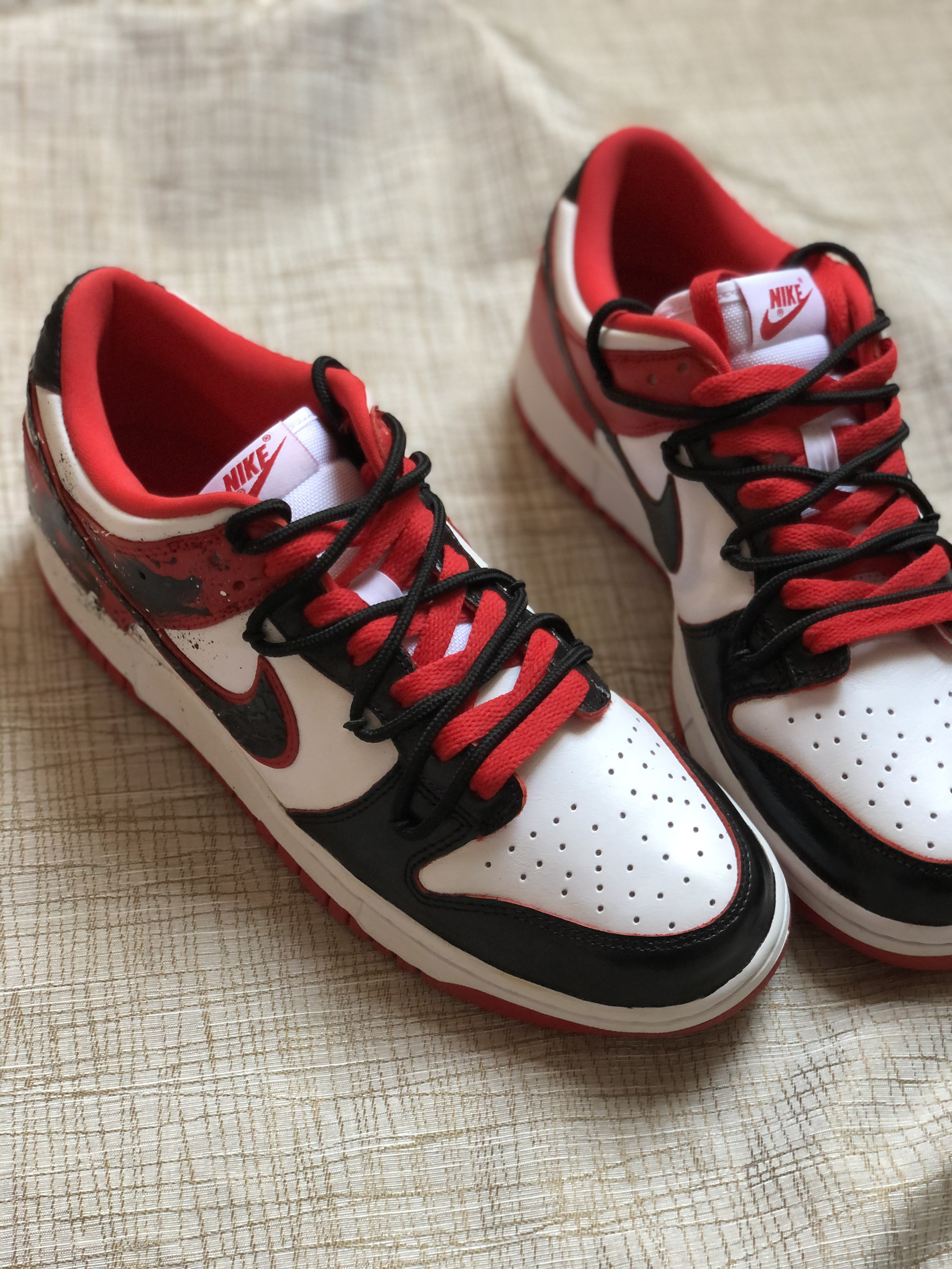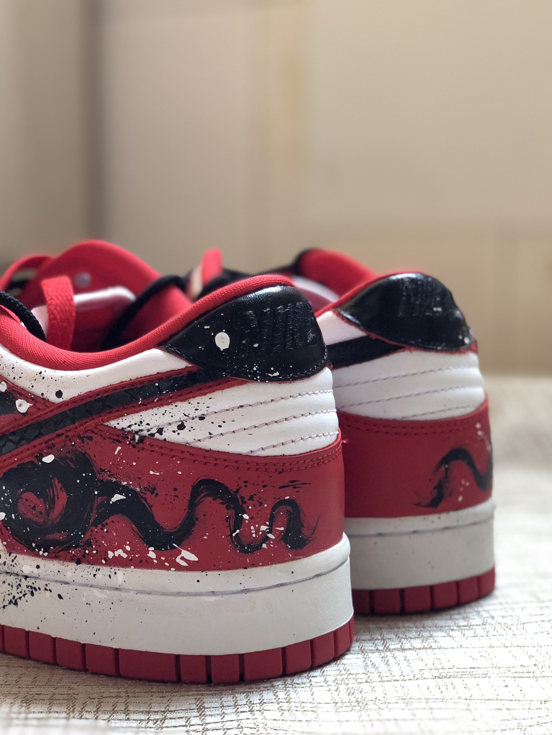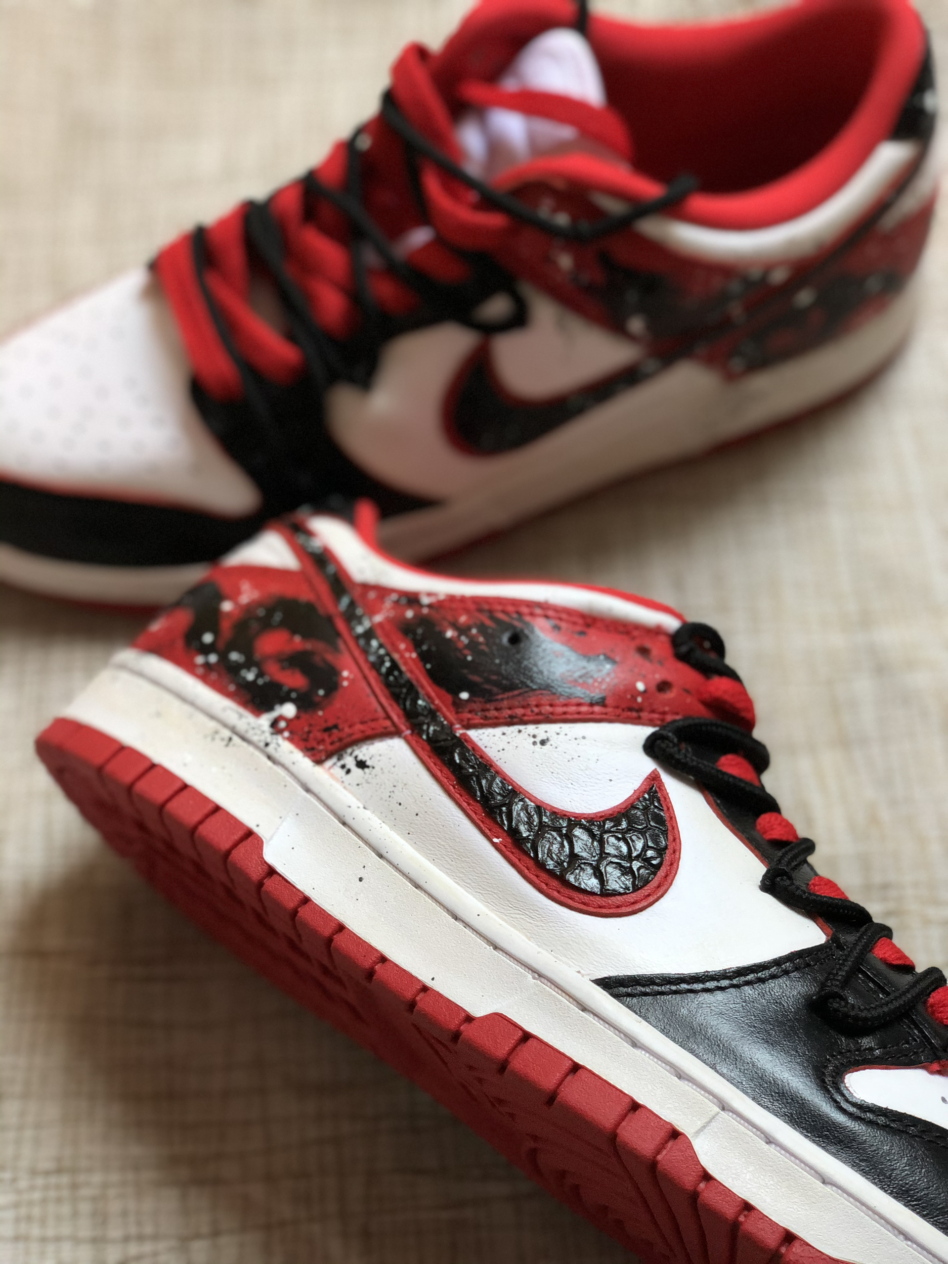 💫这双定制的Dunk 好有中国风的那种美 上脚是好看的 鞋型显脚小还蛮秀气的 👟码数刚好 如果脚宽的可以拍大半码 鞋尾面有中国龙的手绘 而钩子上是立体的龙鳞图案 🥰配色还是黑白+中国红的颜色 就还蛮契合今年龙年春节的主题