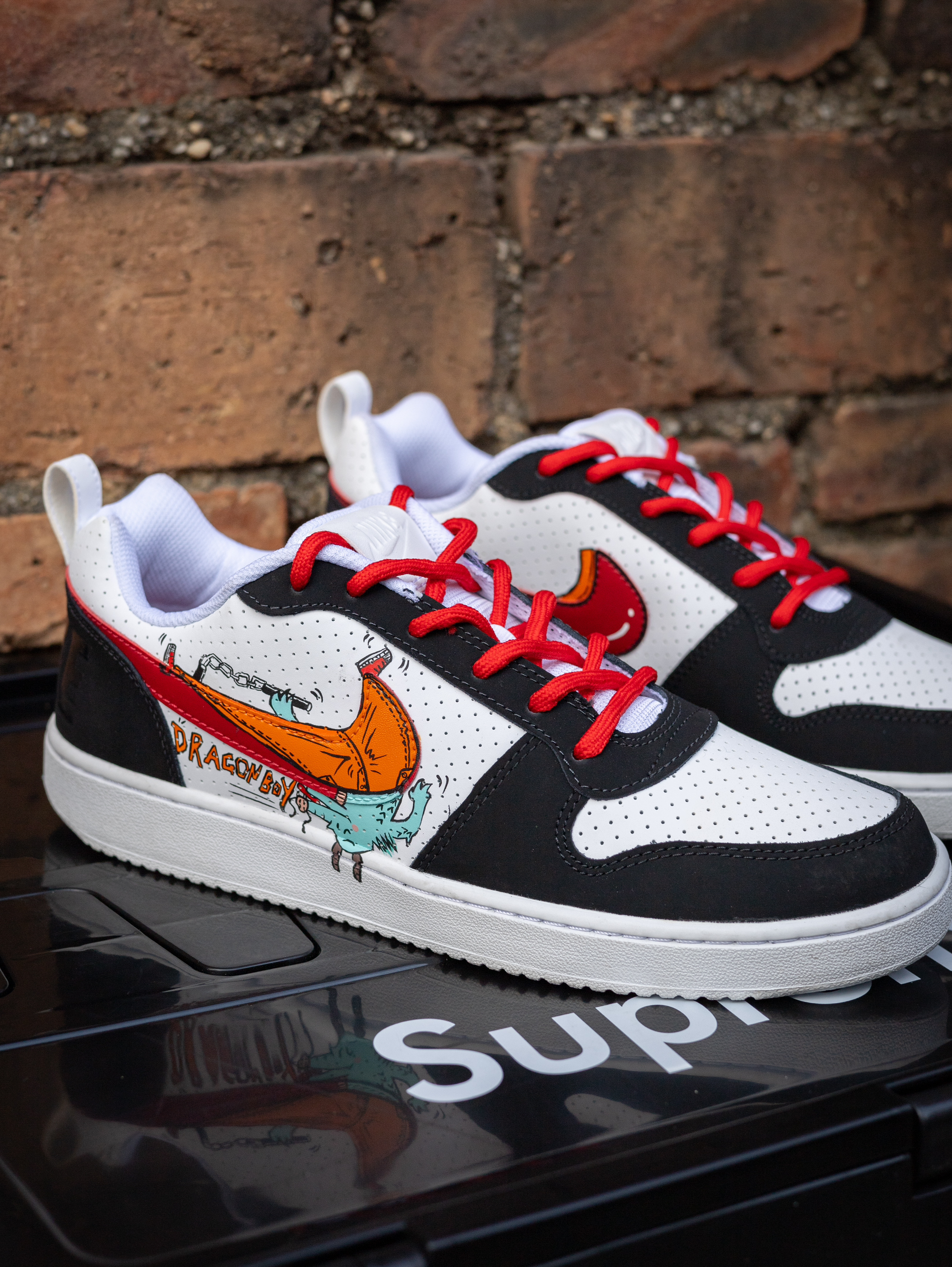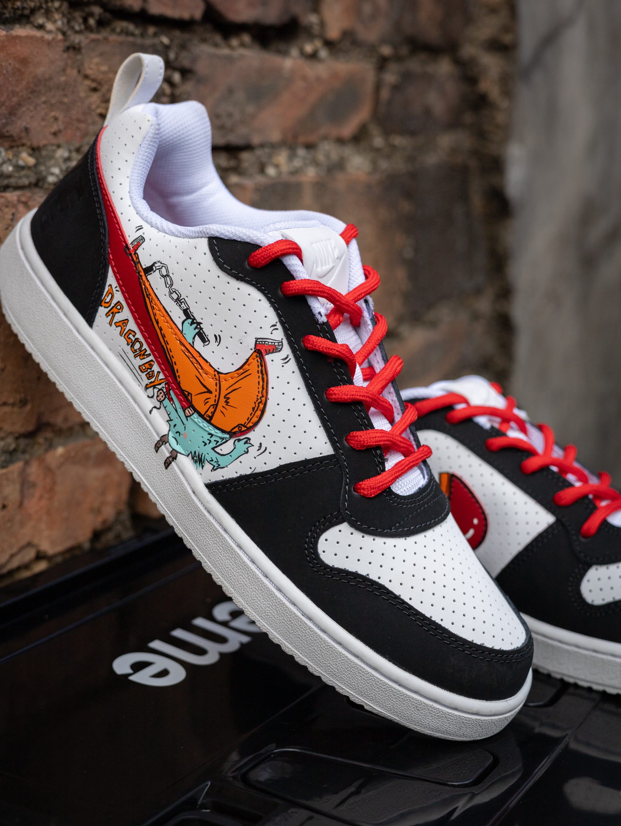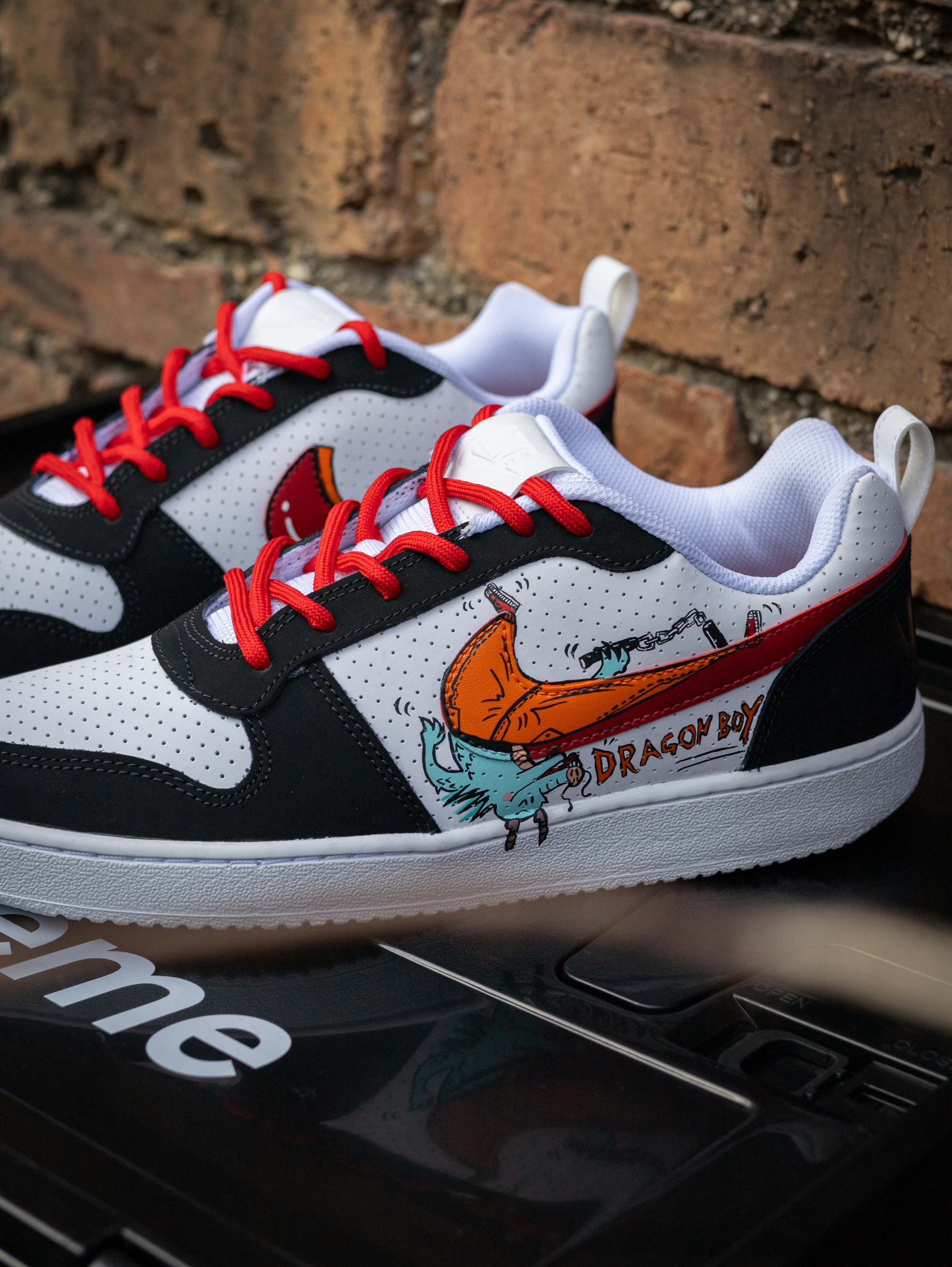 今天给大家分享一双很适合新年的小板鞋👟 Nike Court Borough『龙年🐉限定 』黑白红 整双鞋由白色/黑色/红色等为主色调 鞋面选用了光面皮革+绒面皮革拼接 鞋头和鞋侧的密集透气孔保证了较好的透气性 鞋侧Swoosh与卡通龙🐉的涂鸦设计颇为吸睛 鞋尾的白色织物提拉带方便日常穿脱调整 白色的中底和同色多纹路的橡胶大底收尾 整体来说这是一双很有个性的定制小板鞋👟 颜值在线 时尚潮流 非常适...