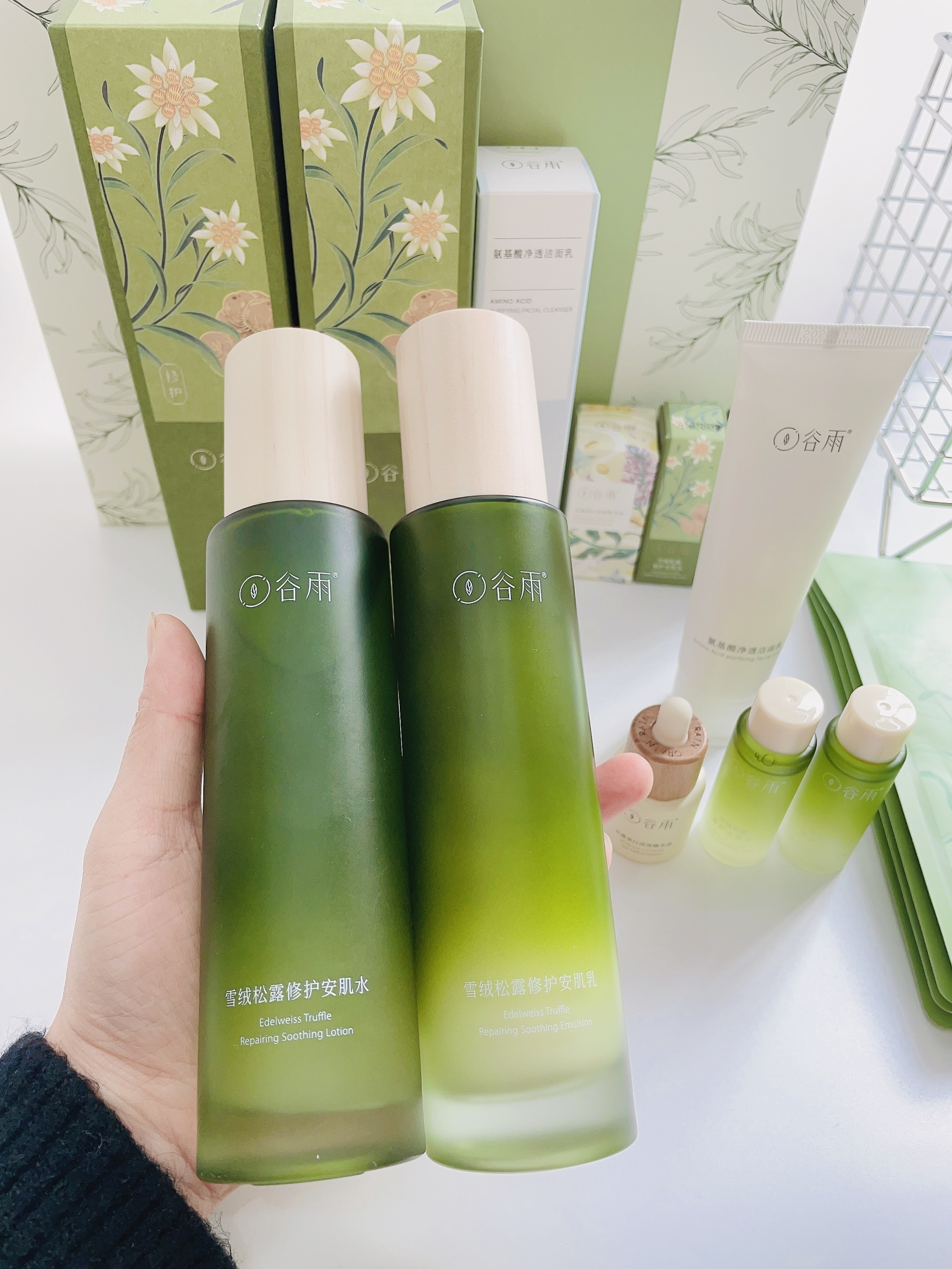 南方的冬天气候都比较干燥 皮肤敏感容易泛红痒痒 谷雨这套雪绒水乳礼盒 可以有效修护 屏障受损 缓解肌肤干燥敏感问题 水乳质地清新不黏腻 上脸吸收快 滋润保湿 坚持使用下来脸蛋透亮了 舒缓修复一步到位 礼盒包装精致 新年啦可用来送礼