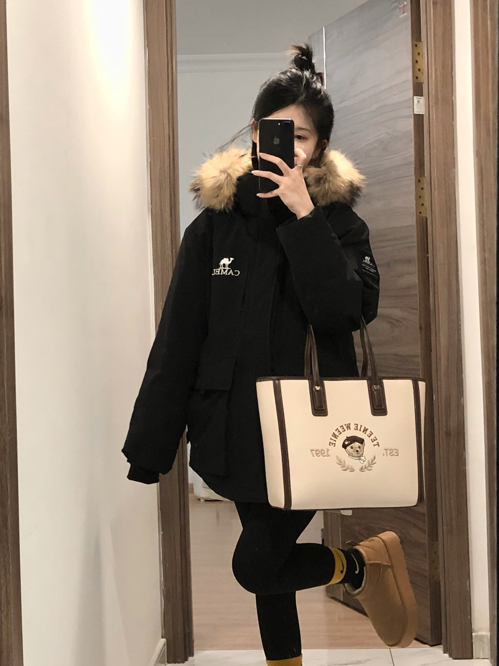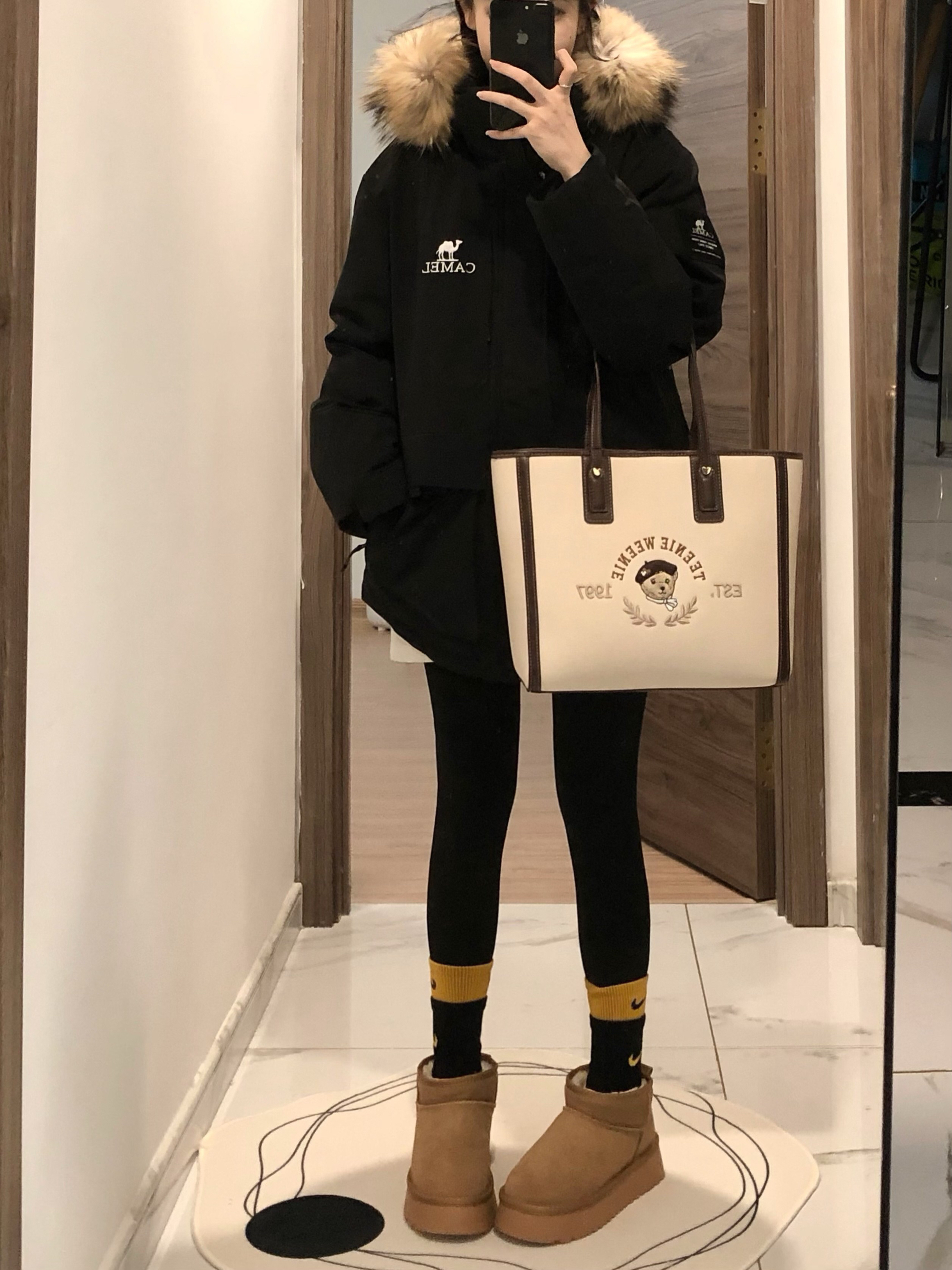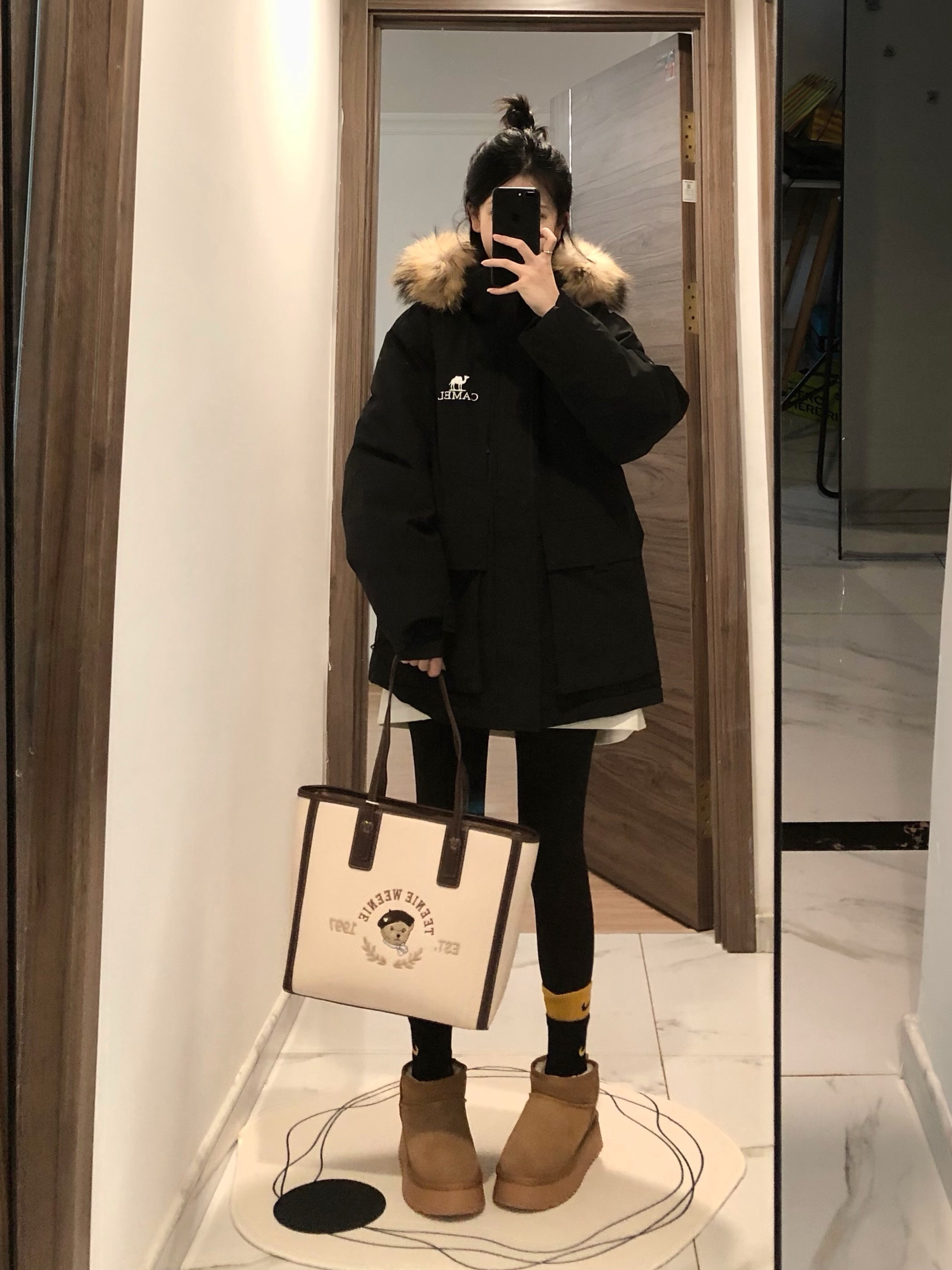 工装羽绒服真嘟怎么穿都好看 搭上鲨鱼裤雪地靴 一整个温暖住 ~