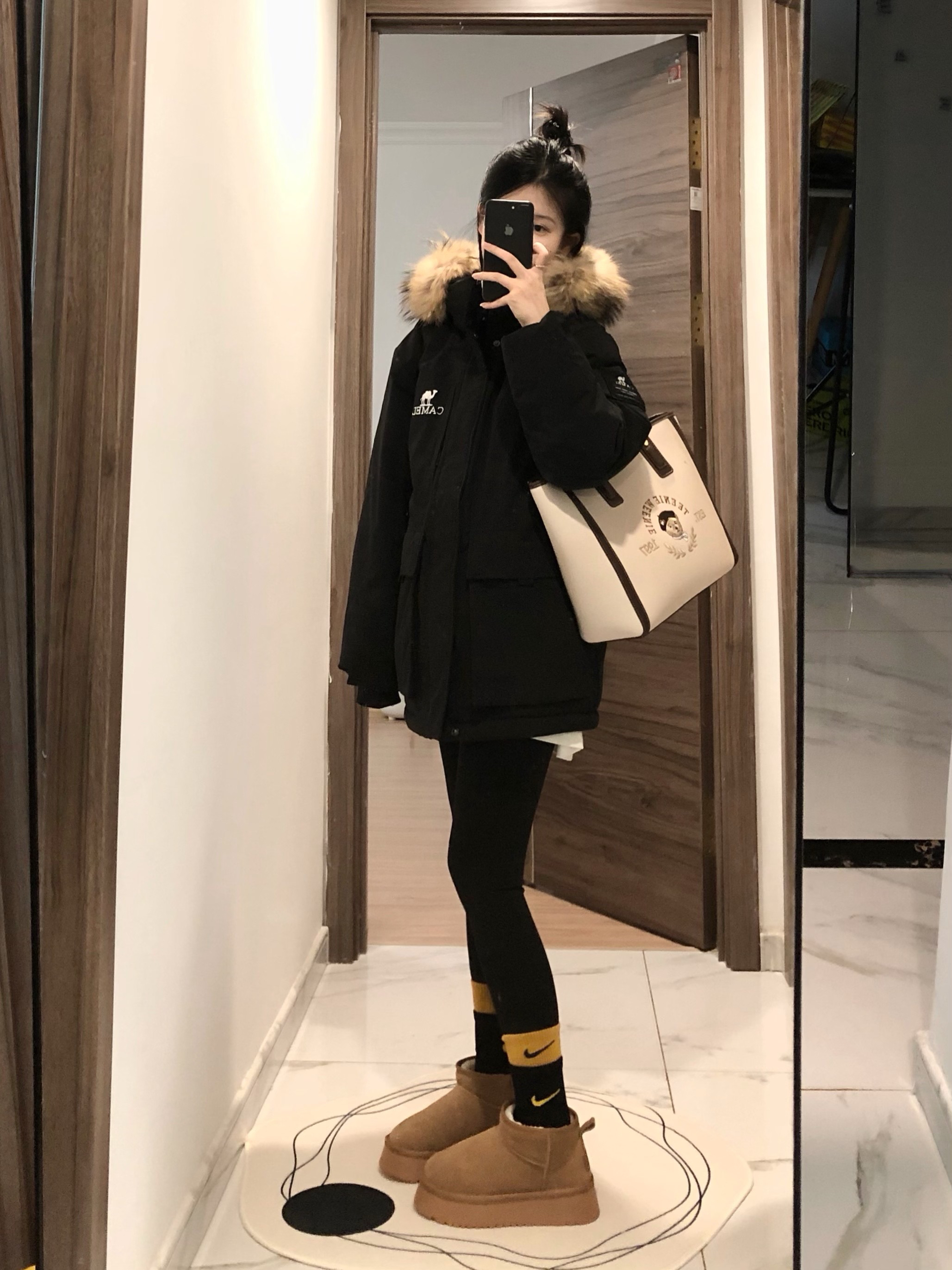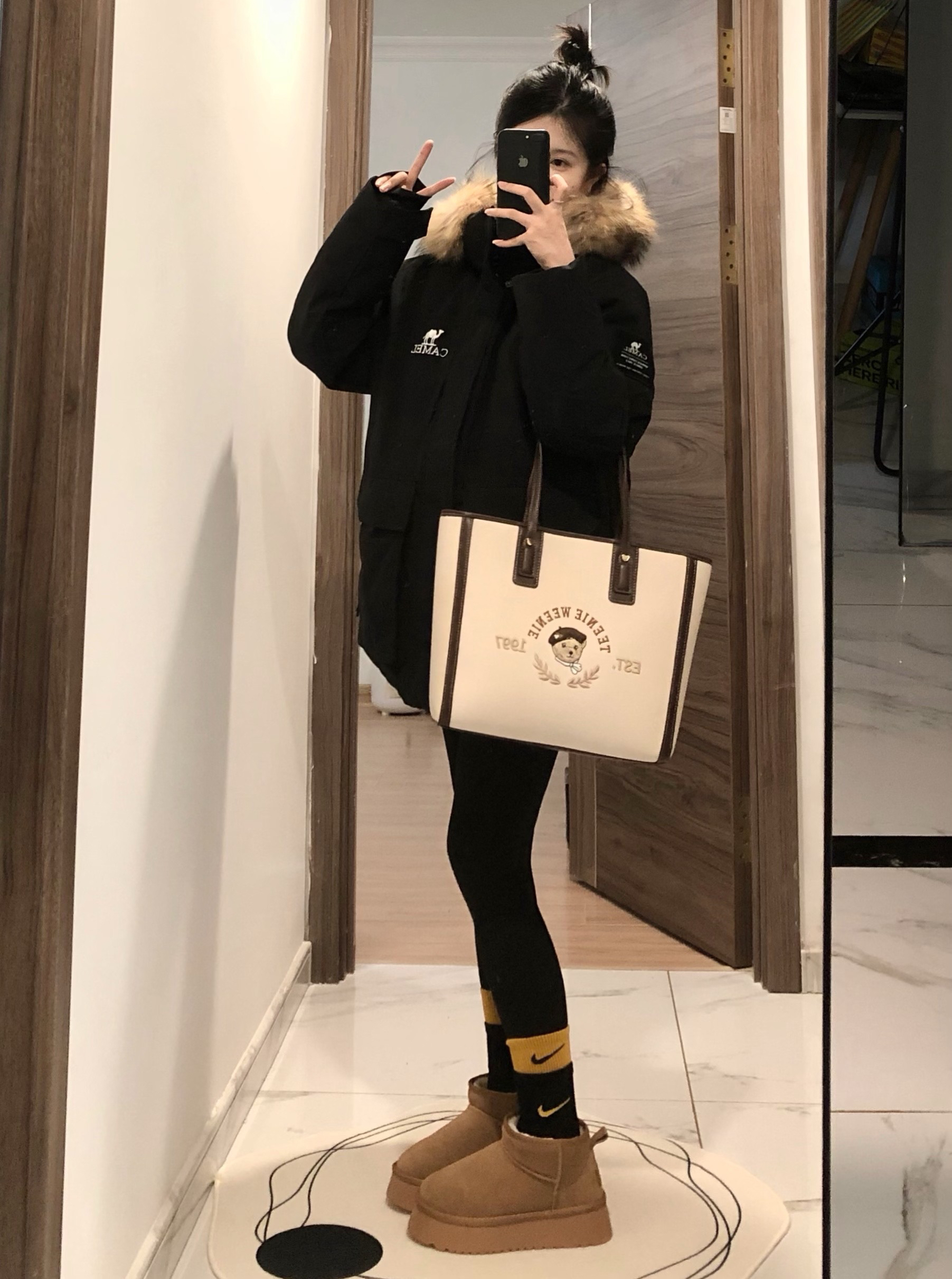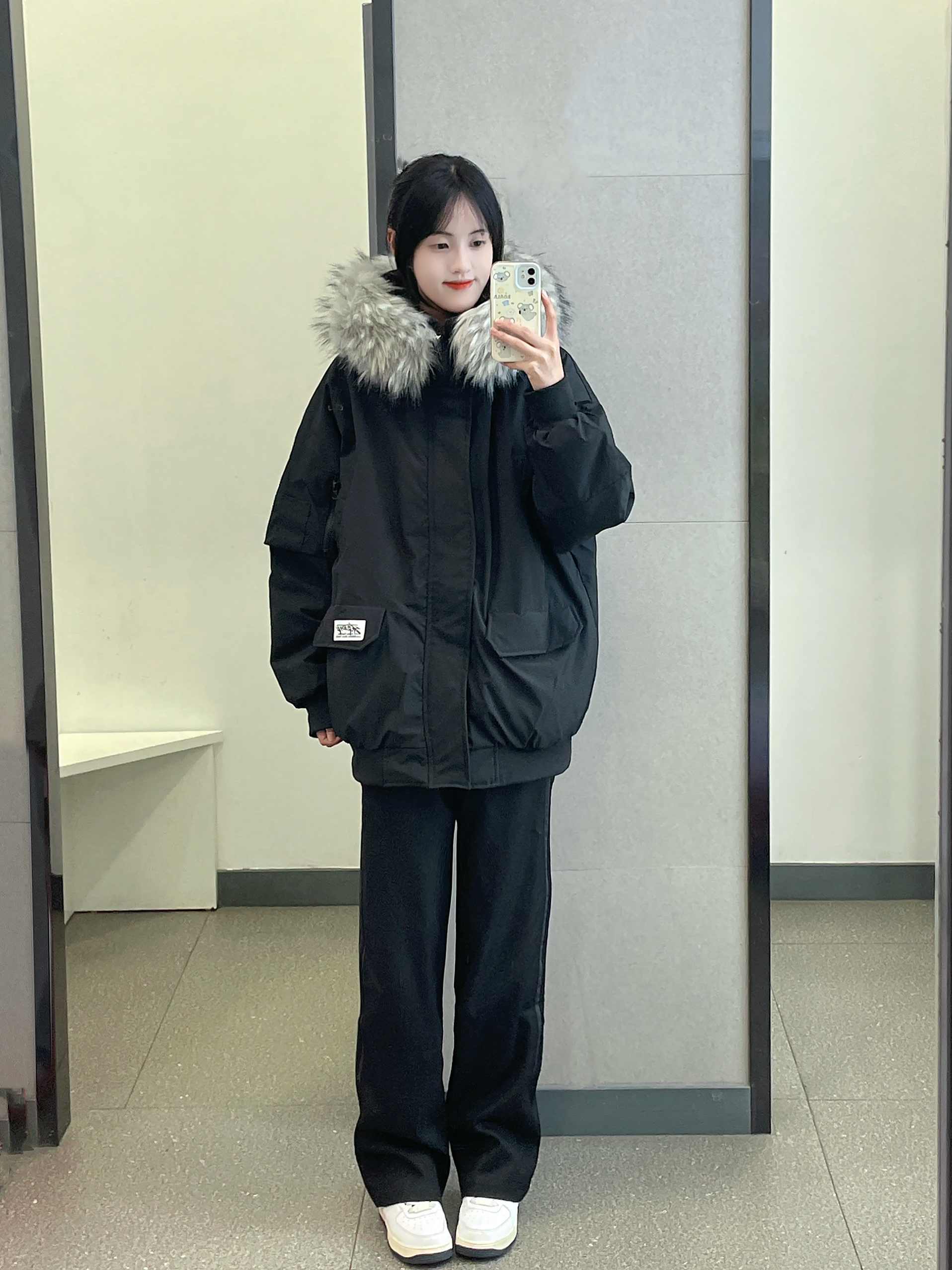 工装羽绒服真嘟怎么穿都好看 搭上鲨鱼裤雪地靴 一整个温暖住 ~