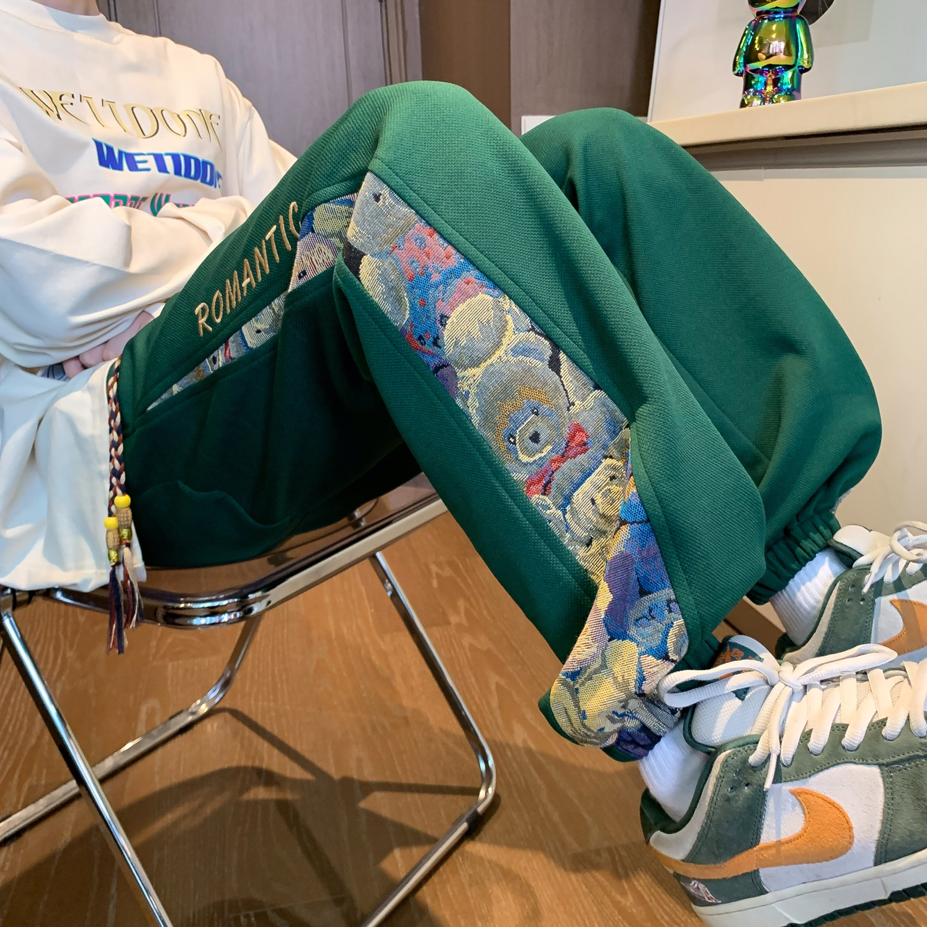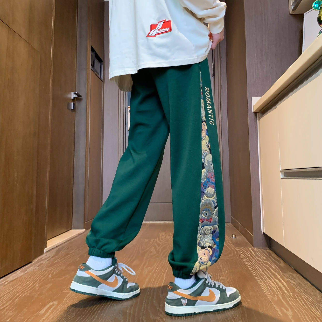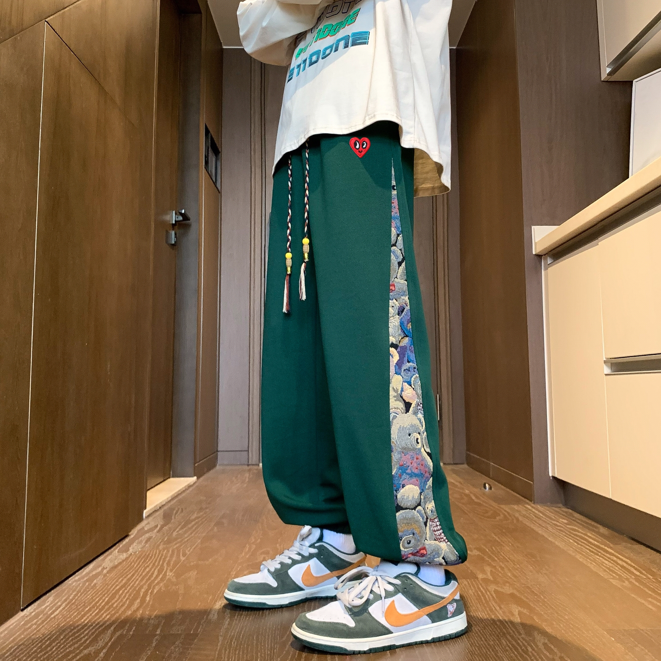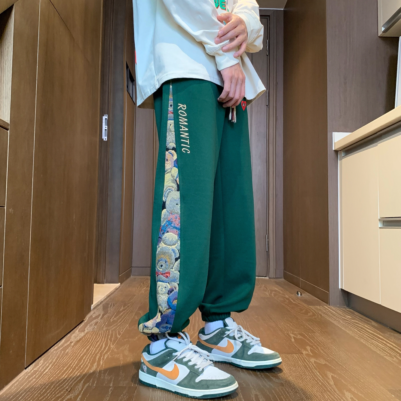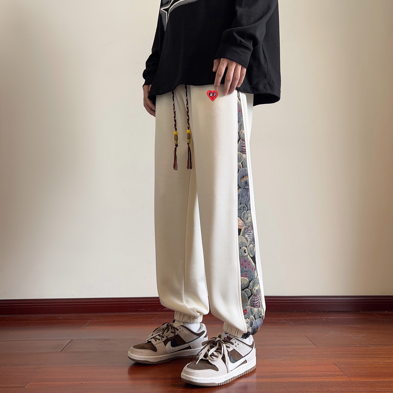 这件查尔斯桃心侧边小熊休闲卫裤,配色拿捏得恰到好处,不仅不夸张,还给人眼前一亮的感觉,很特别又时髦好驾驭的休闲裤