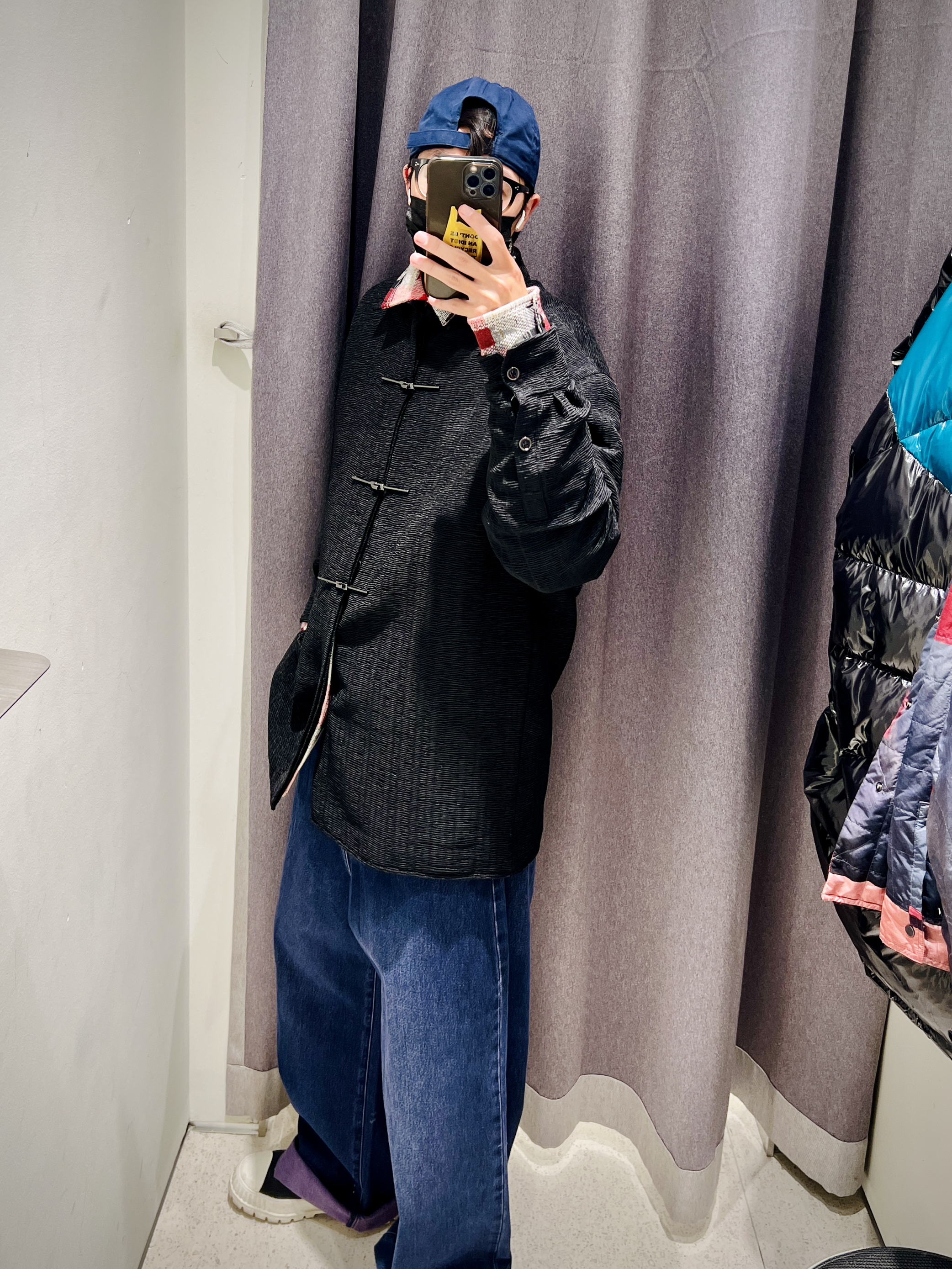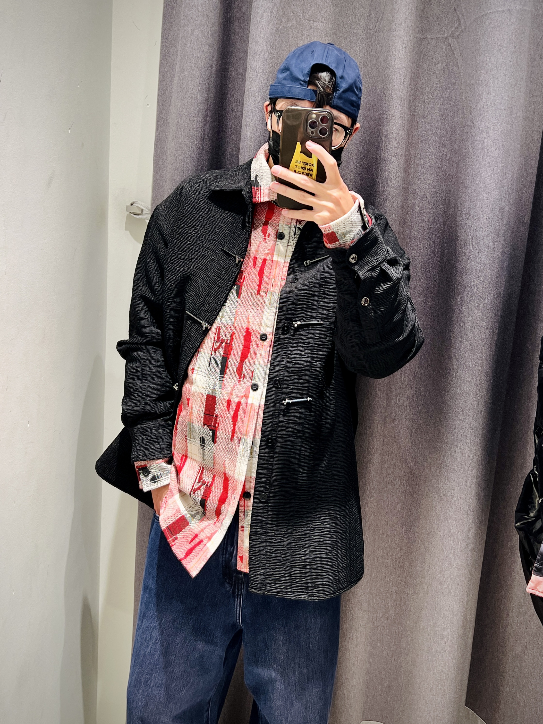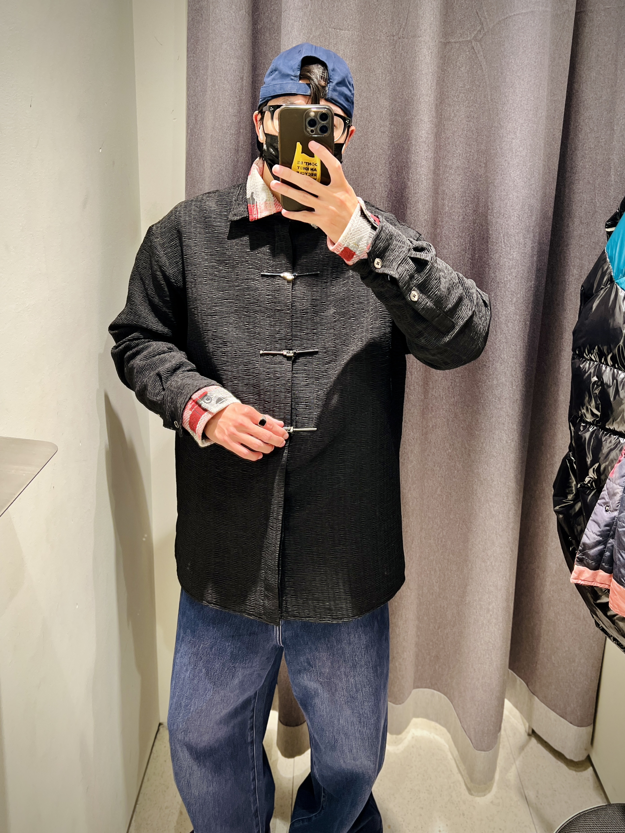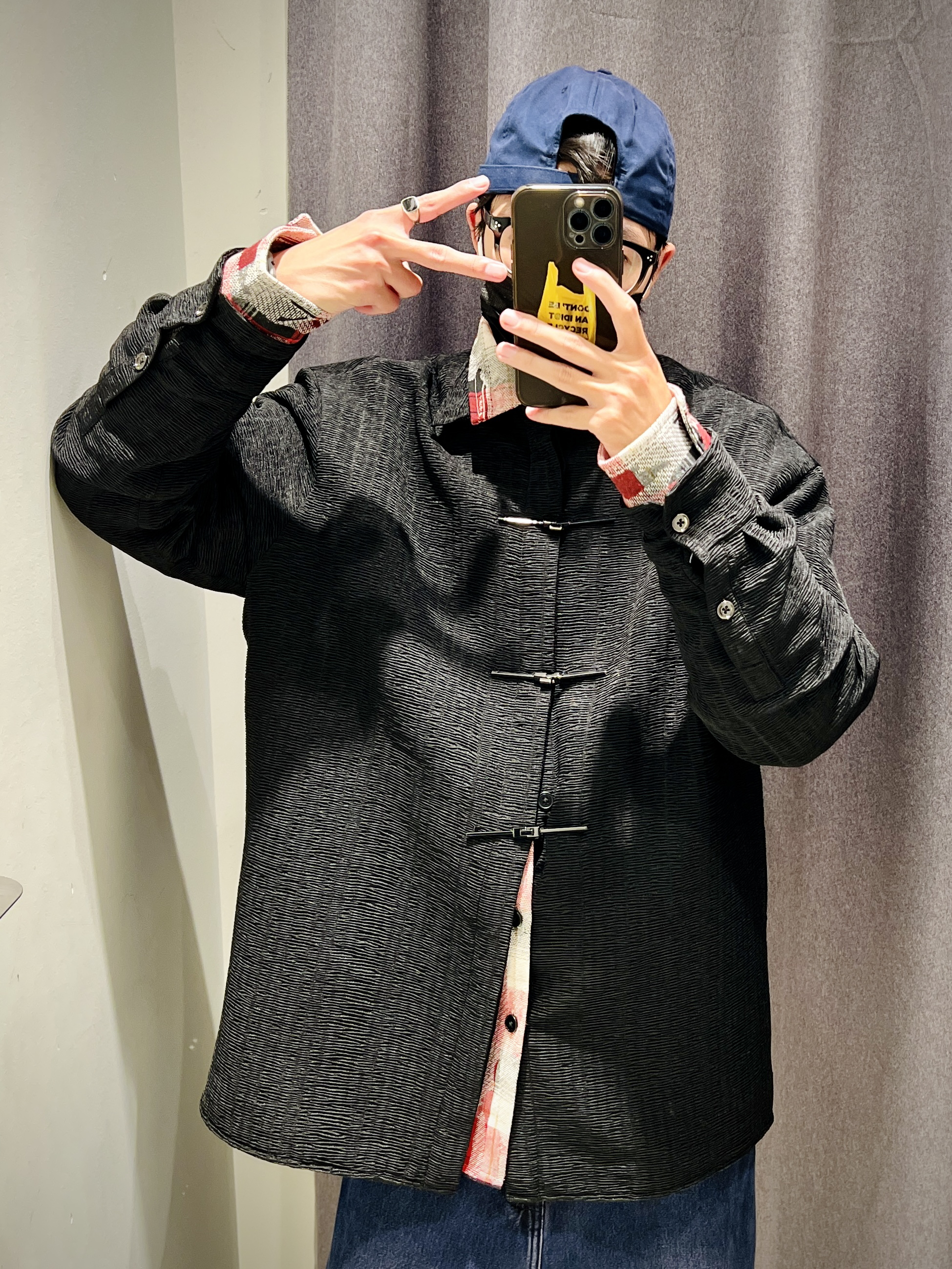 黑色金属盘扣衬衫外套 有一点点夹棉 在暖冬穿刚好合适 龙年好像更有中国风的味道 用金属盘扣代替普通盘扣的设计 更具未来感同时保留中国风 一个非常好好的设计 内搭选择红衬衫 露出领子和袖口叠穿 即有了年味又不会大面积红色 让人视觉疲劳 裤子选些宽松牛仔或者休闲裤 有点喜庆有点个性 轻松get新年开运穿搭 👦🏻:180/65 🧥:UMV140009 L 👔:UML240001 M 👖:UMV830...