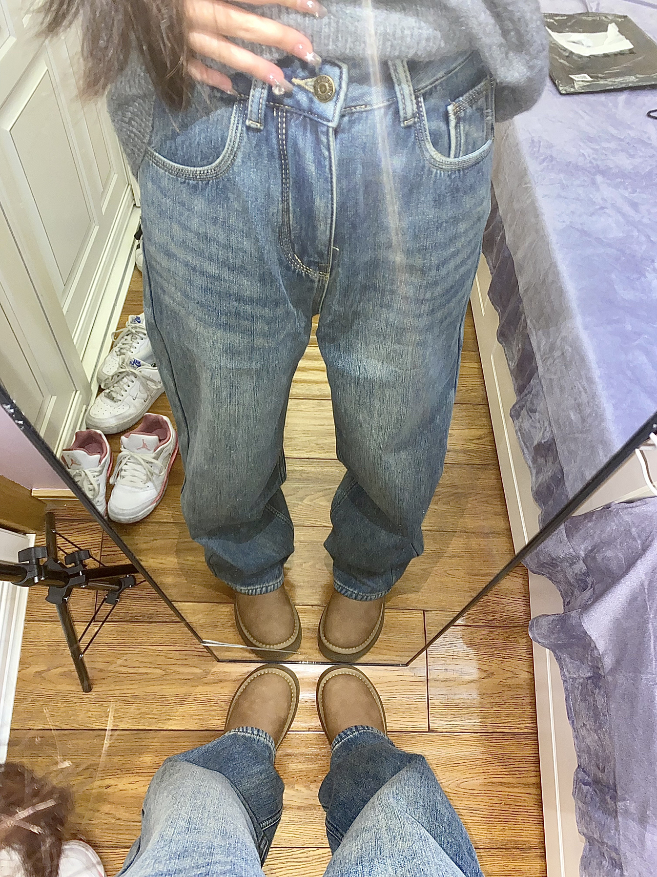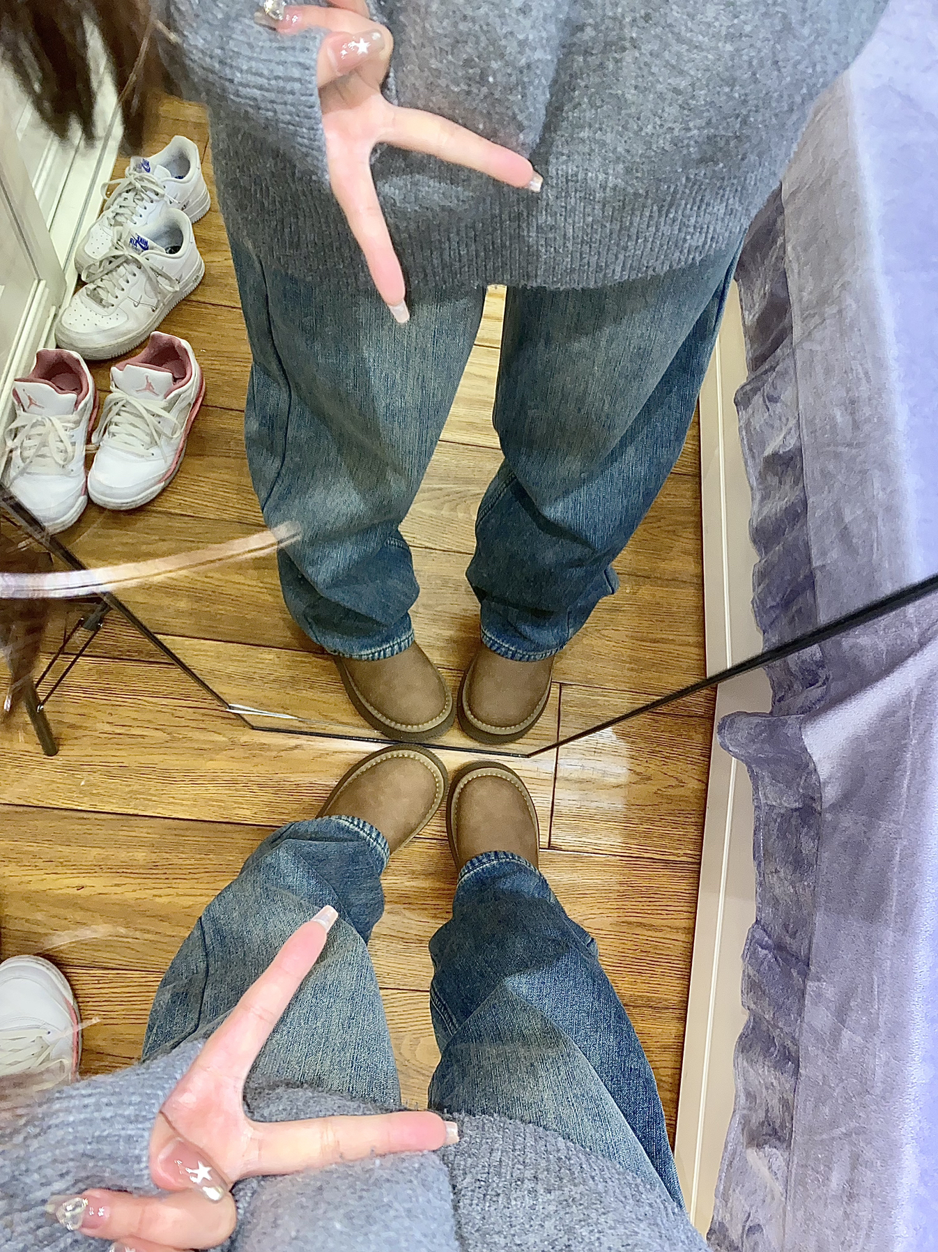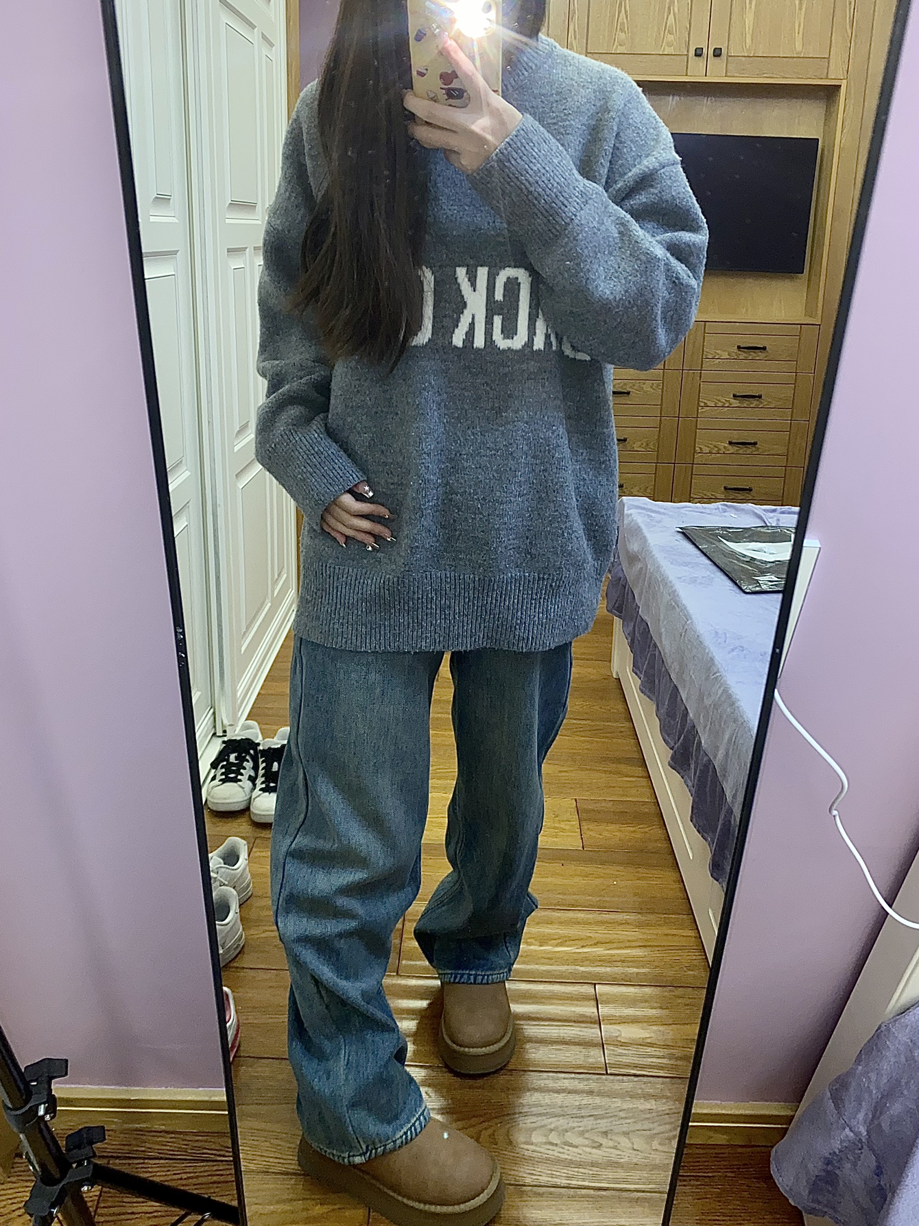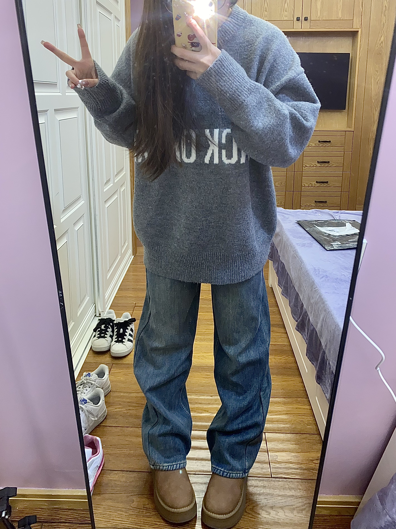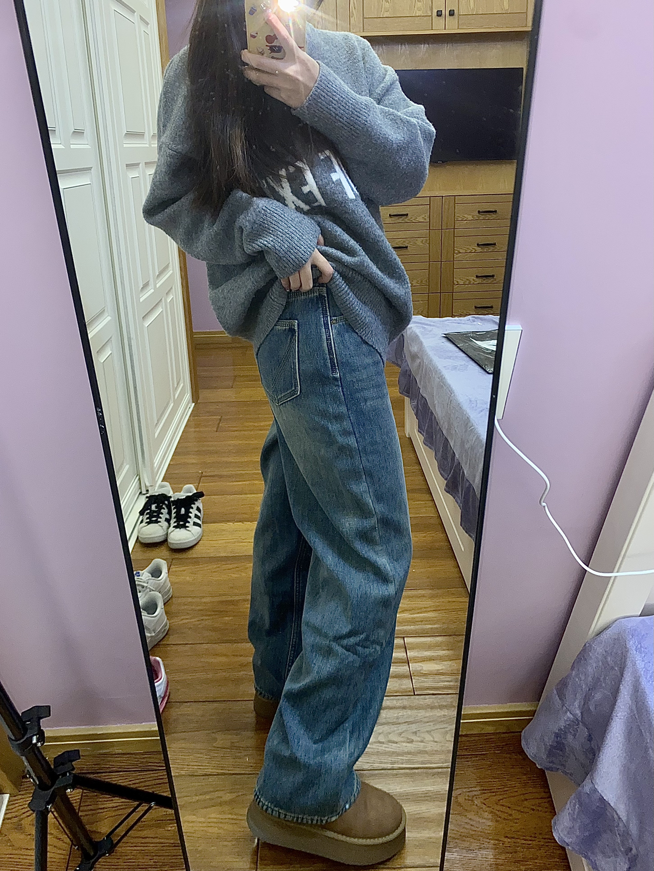 今天穿的是 E.D.X 家的牛仔裤! 这款裤子整体上是蓝色的 是那种阔腿的牛仔裤 很耐看很百搭的 里面还加绒了 穿起来非常的舒服保暖 秋冬穿太合适不过啦! 我158 94穿的是s码~