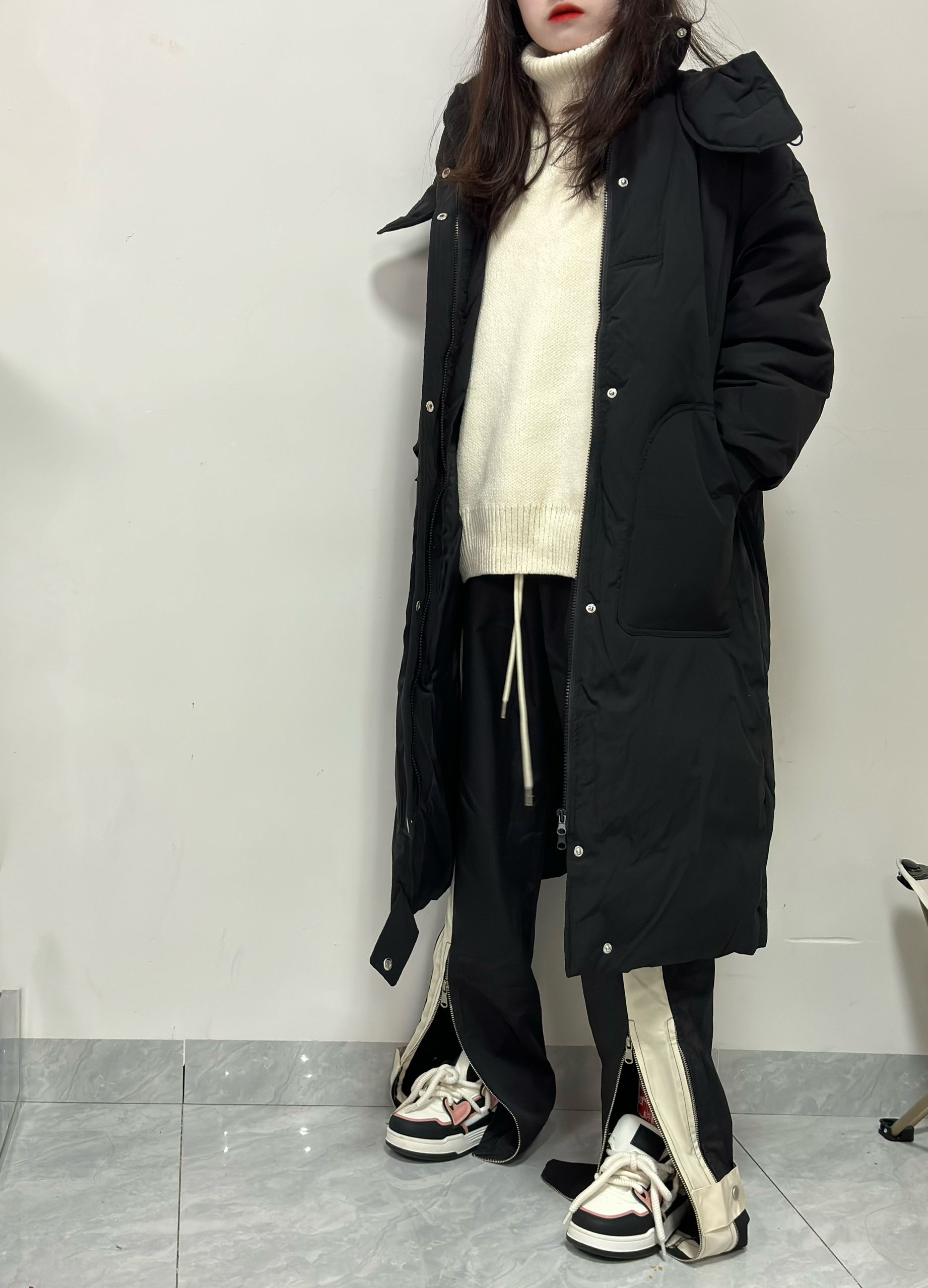 黑色长款羽绒服➕微喇休闲裤 一双环球的平底板鞋~~ 搭配菱格小香风羊皮 单肩斜挎~~ 纯色系列的冬季穿搭 似乎还不错呢