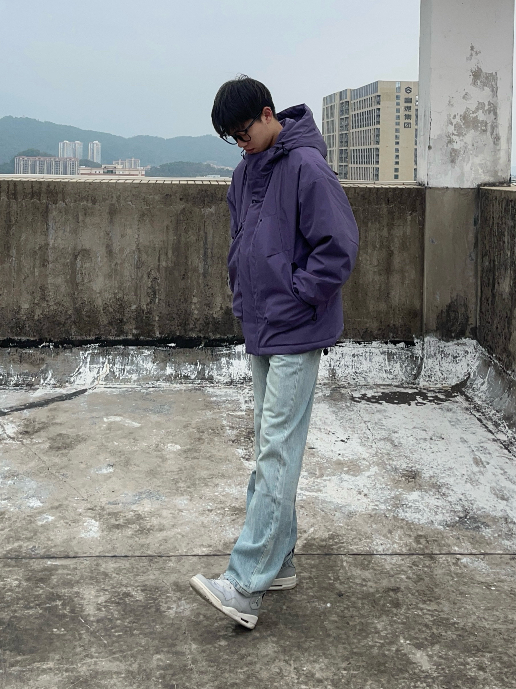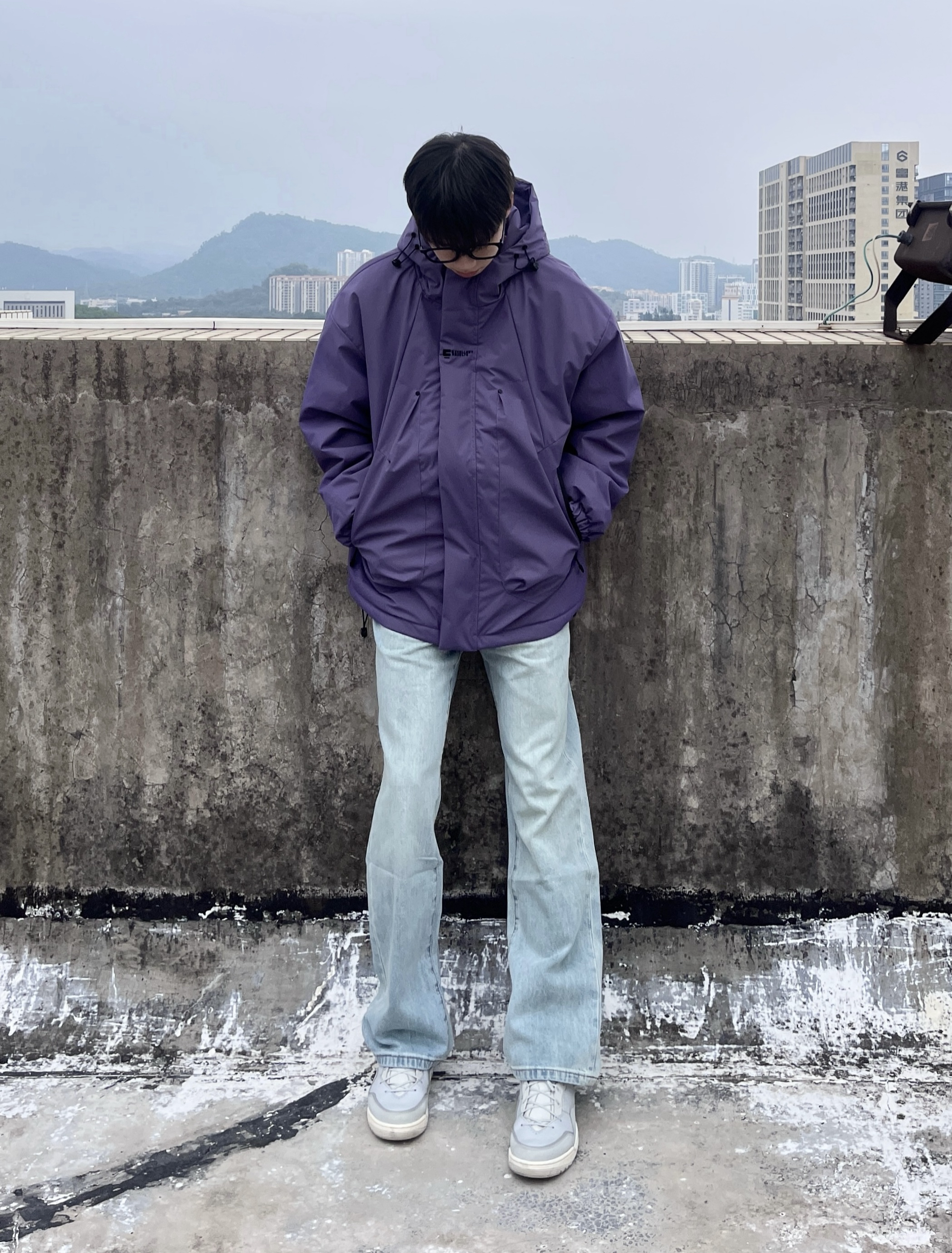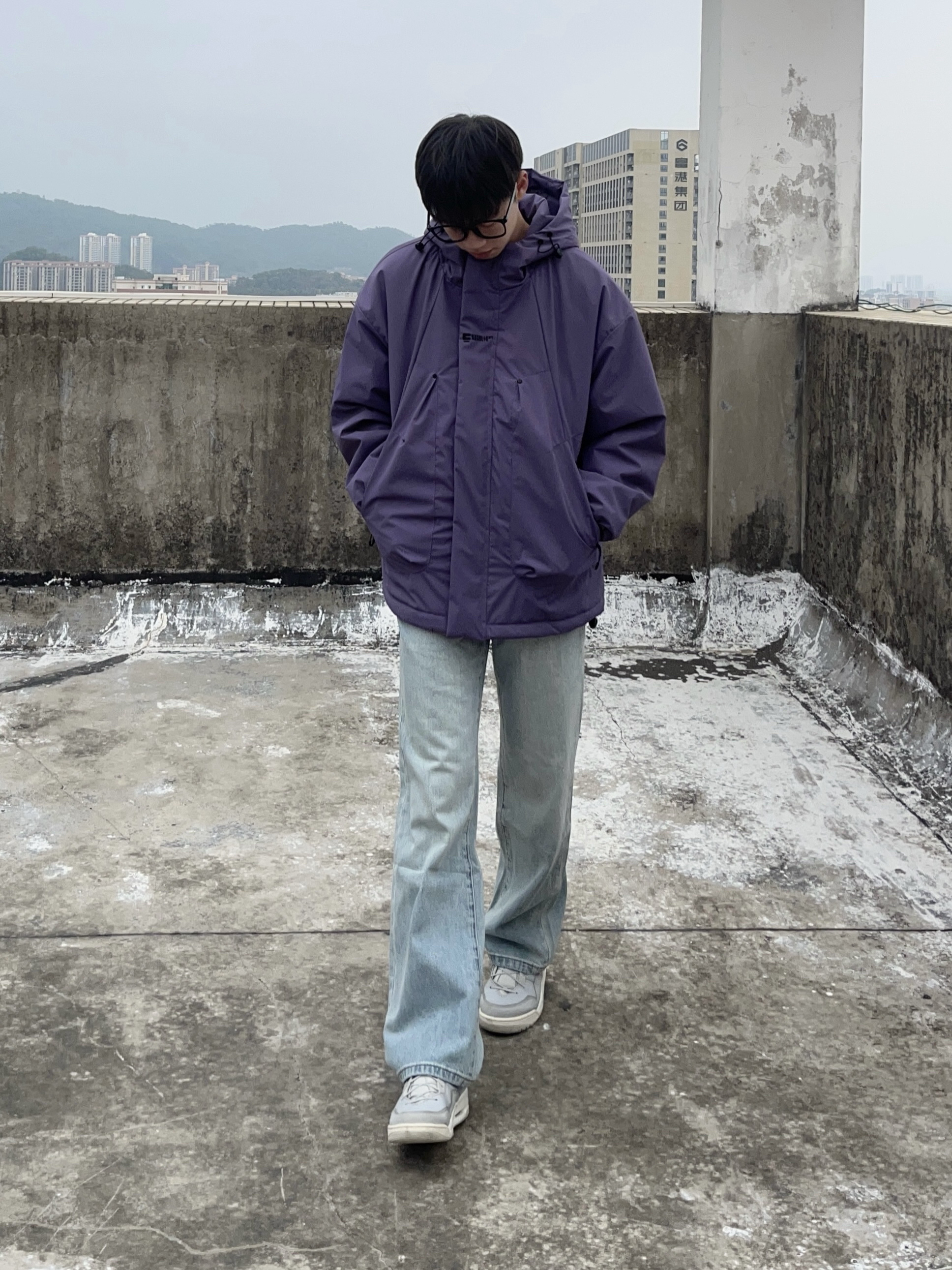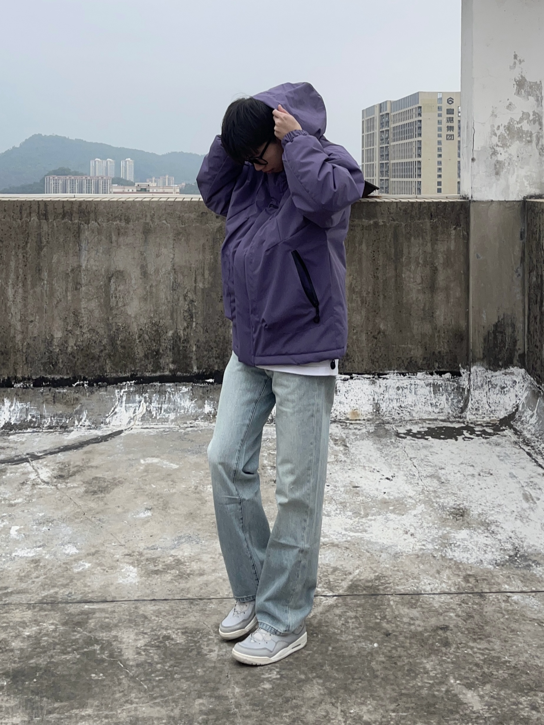 今日份穿搭分享look👀 衣服是紫色的户外休闲冲锋衣 颜值简约时尚 防风防水防污三合一🟣 搭配一条浅蓝色的直筒牛仔裤👖 版型宽松显瘦 穿上后面料柔软舒适显腿型 最后上脚一双灰色复古板鞋 一套搭配下来 百搭又好看🚶