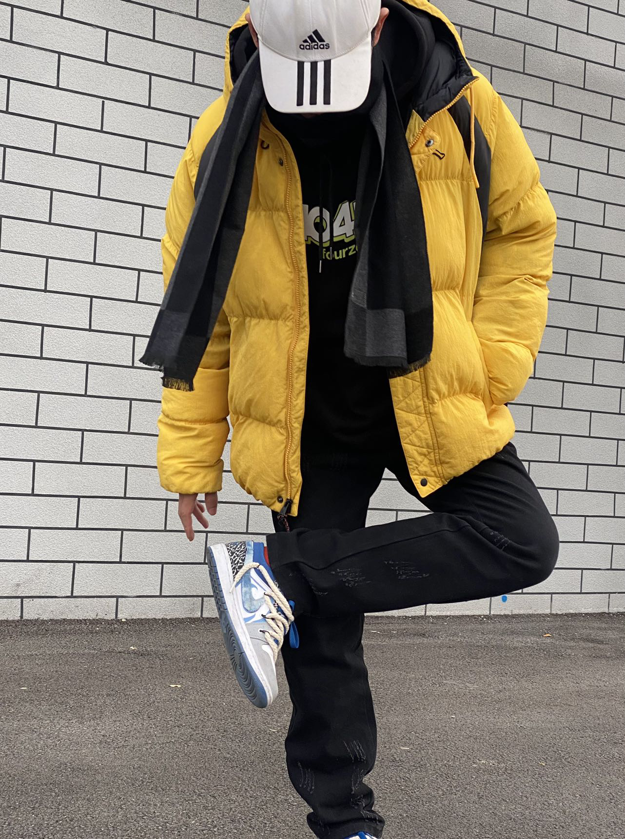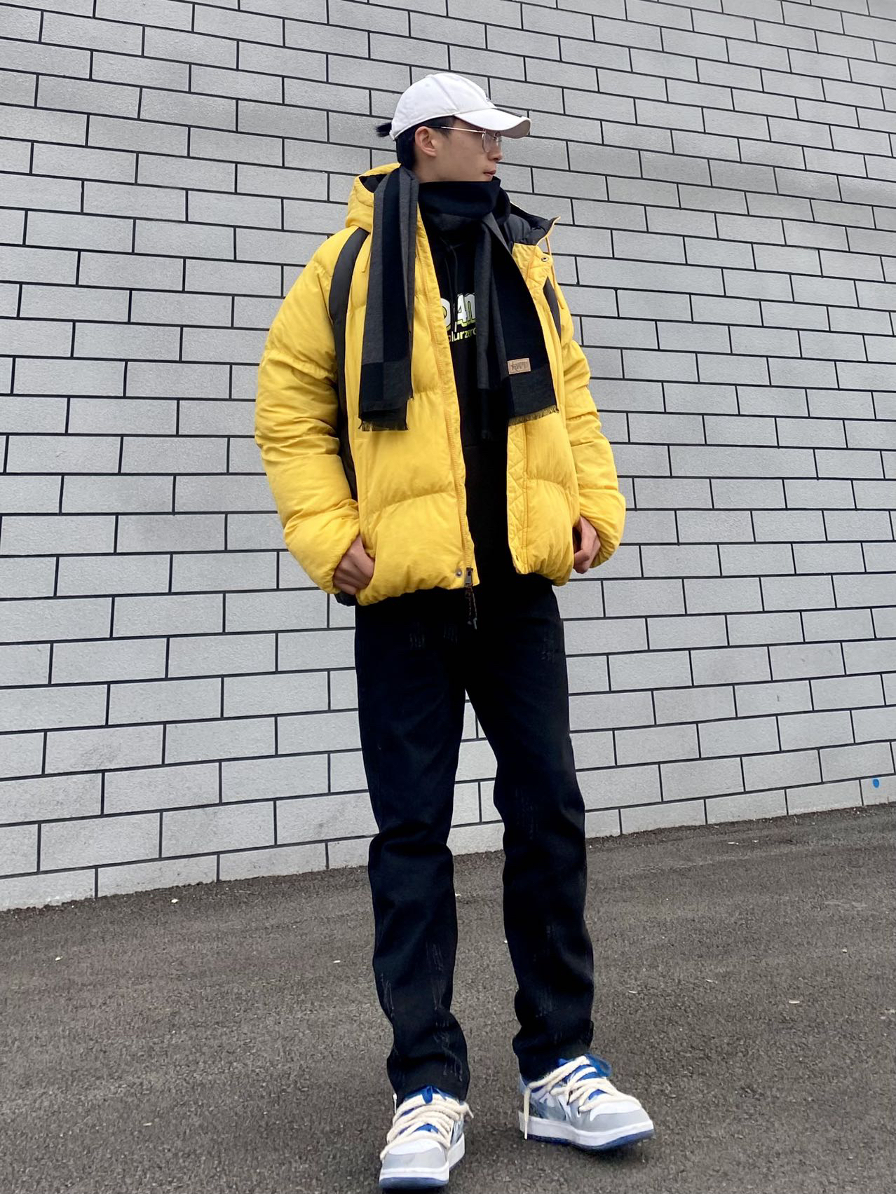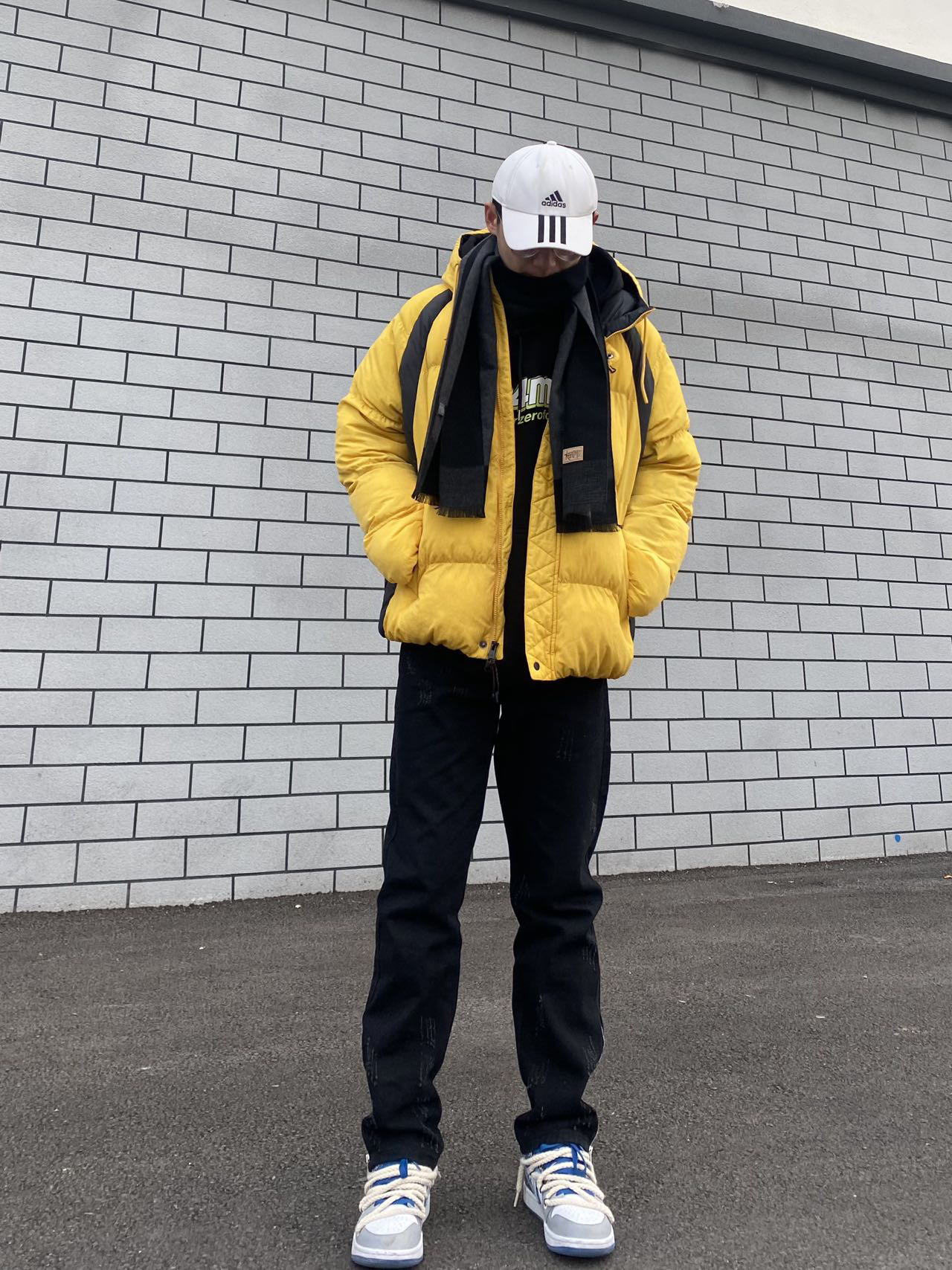 🤳今日冰美式穿搭 我今天的保暖搭子是格子围巾 羊毛混纺的材质既保暖又舒适 拼接颜色也比较好搭衣服‼️ 👔衣服是一件亮色棉服 直接棉服的保暖性还是非常不错 这个颜色比较显白 宽松百搭的版式也不错 — 👖裤子是一条黑色直筒修身牛仔裤 厚度适中冬季穿衣不会冷 修身的版型也显瘦⚡️ — 👟脚上穿了一双AJ1 达芬奇定制球鞋 青韫牛仔配色 吸引我的是他鞋身上的手绘不容易撞鞋