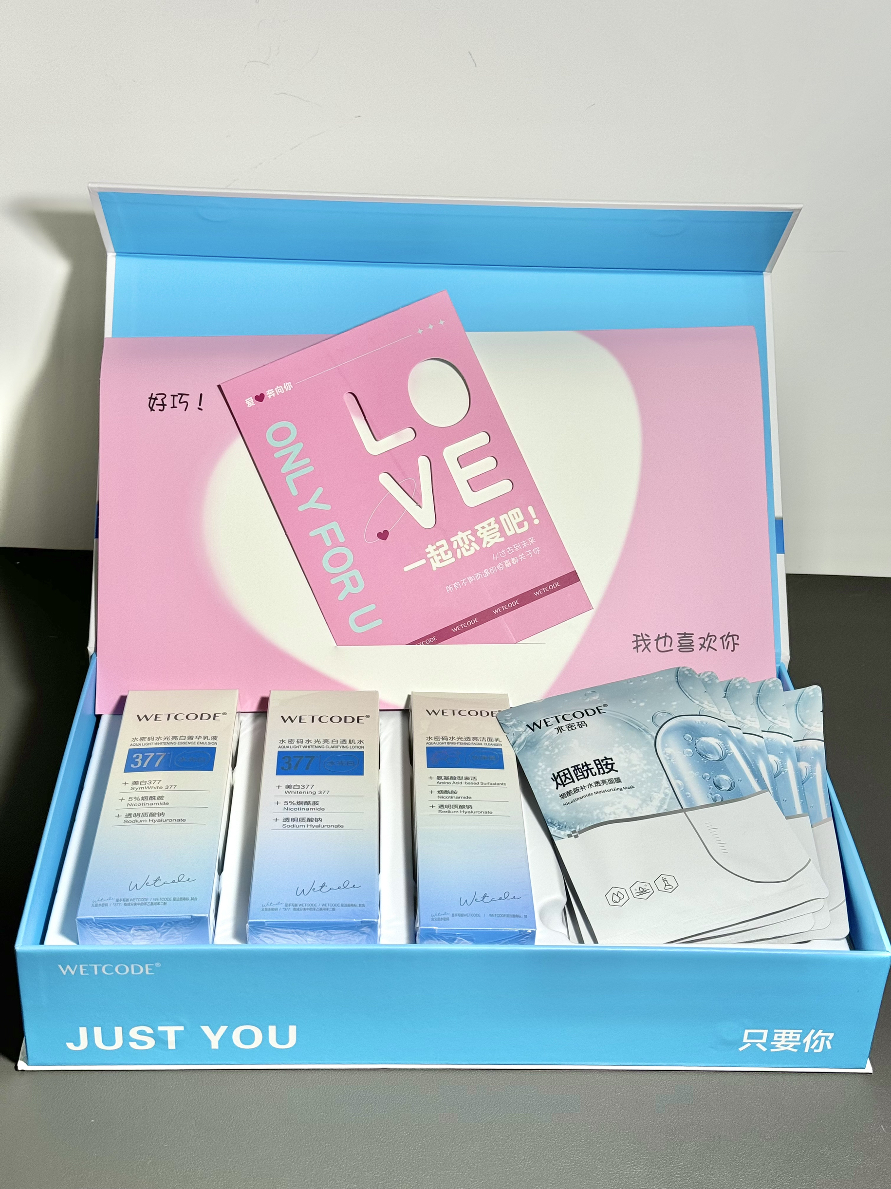 ONLY FOR U 无法拒绝的春节礼物 春节马上来啦 这套“只要你”护肤礼盒 也太适合当春节礼物了吧!! 粉粉嫩嫩的包装还印了超大的爱心 JUST YOU不是明闪闪的表白吗 水密码你也太会搞浪漫了!! 一套里面有洁面乳➕精华水➕精华乳➕烟酰胺面膜 女朋友用完更白了~闪闪惹人爱呀 希望男生都能卷起来当模范男友!