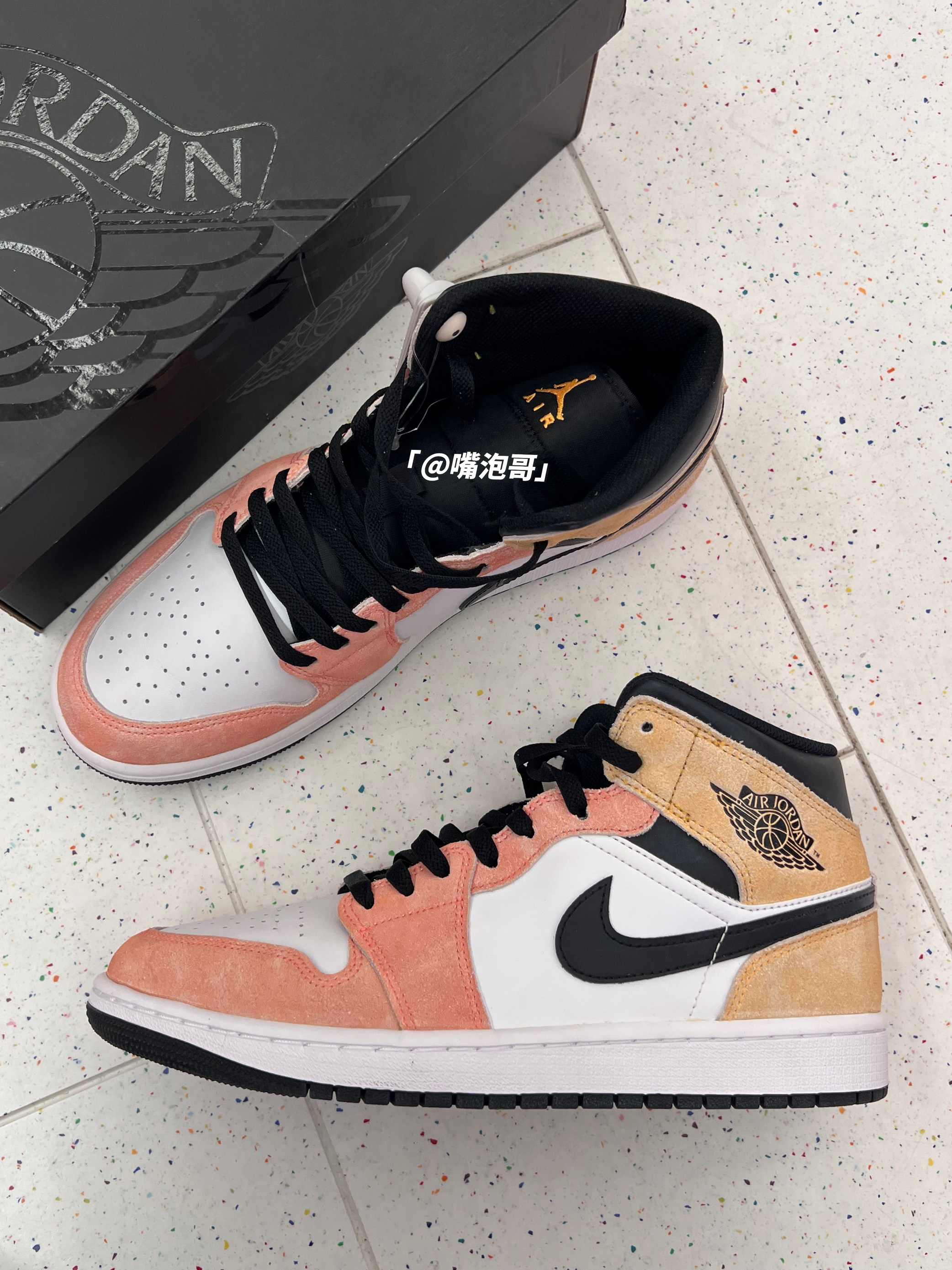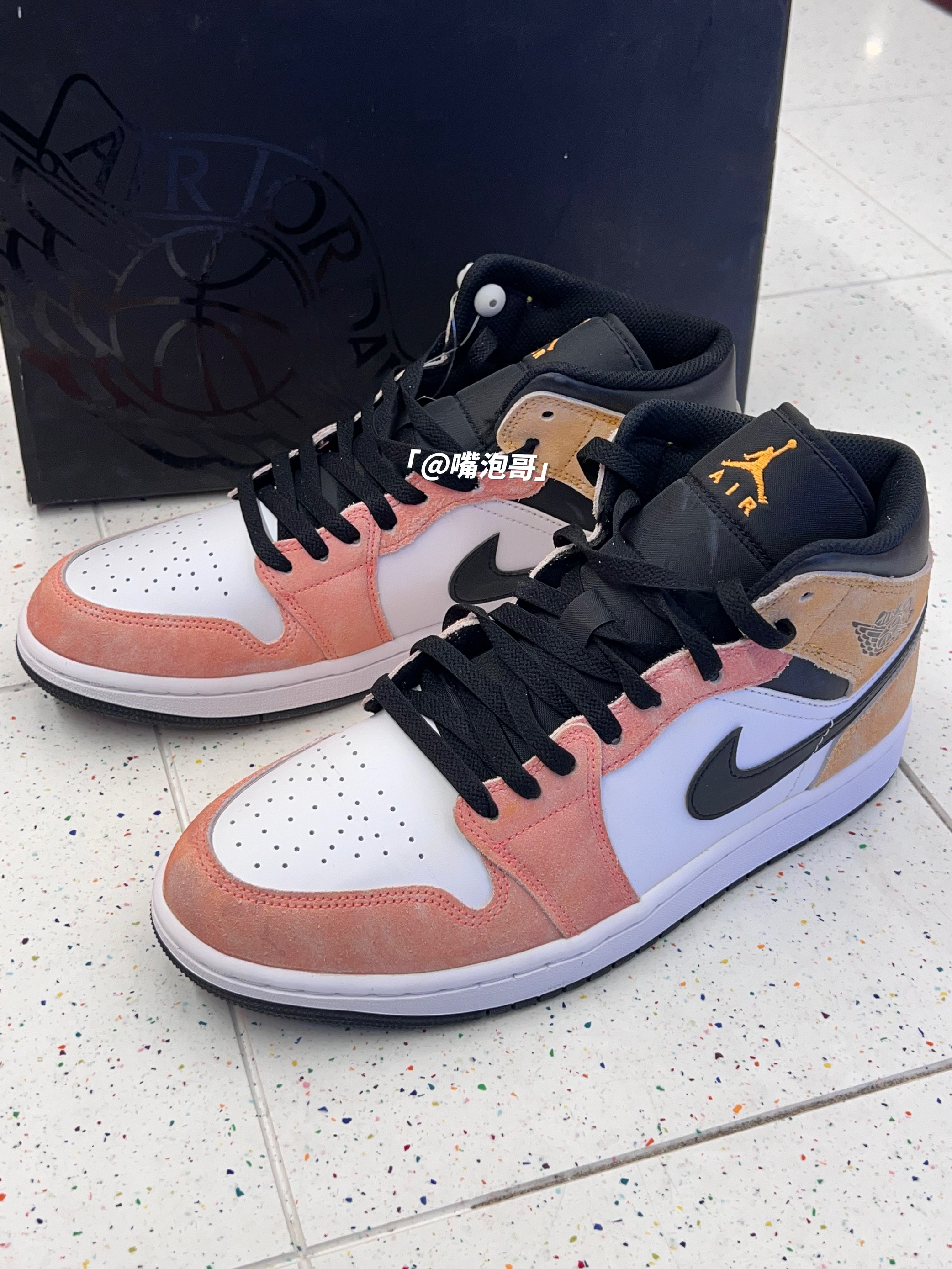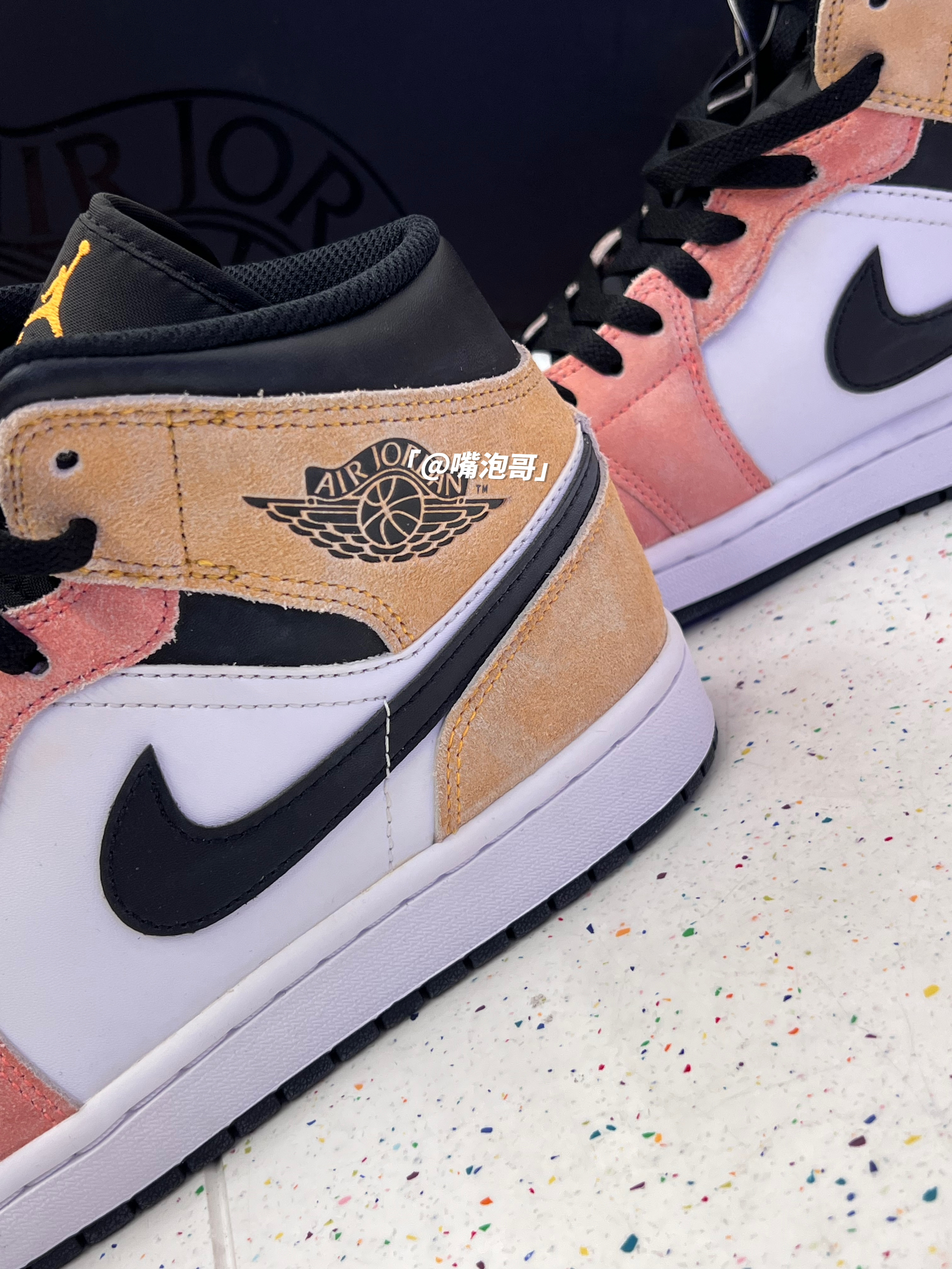 👟:Air Jordan 1 Mid "Flight Club" 简介: 鞋款是经典的中帮AJ1鞋型,整双鞋子的配色还是比较有辨识度的,采用多彩渐变色来呈现,并且又是运用了麂皮材料,所以整体的质感是有提升,但脚感上依旧偏硬的状态。 细节: 鞋面采用了麂皮制作框架,鞋头面及鞋身两侧均使用白色光面皮革填充,虽然整体质感不错,但光面皮革容易出现褶皱,鞋身两侧swoosh选用了黑色皮革打造,...