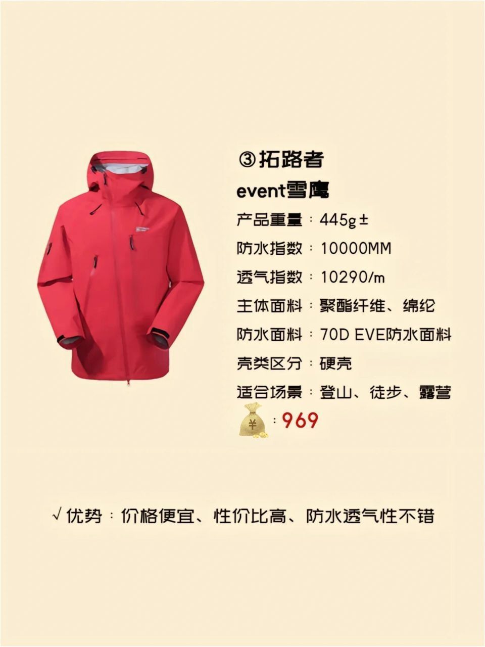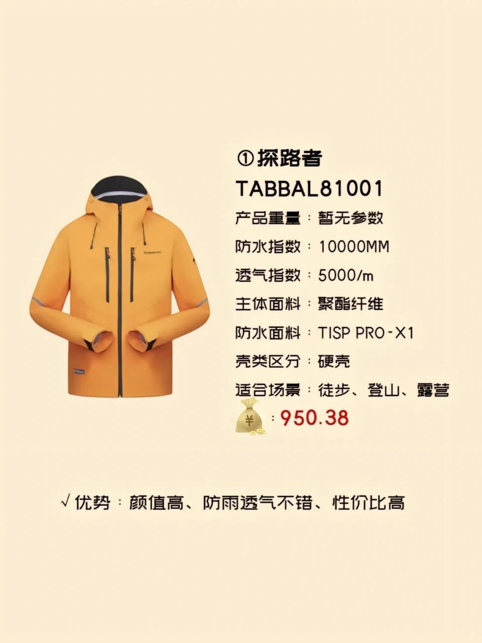 不管是在寒冷季节还是户外活动,拥有一件好的冲锋衣都是十分重要的❗️ - 市面上,冲锋衣分为: ✅软壳冲锋衣 ✅硬壳冲锋衣 ✅三合一冲锋衣 ✅抓绒冲锋衣 那么新手di一件高性价比的冲锋衣怎么选⁉️ 今天给大家分享几个高性价比的冲锋衣,都蛮不错的❗️ - 1️⃣探路者 TABBAL81001 产品重量:暂无参数 防水指数:10000MM 透气指数:5000/m 主体面料:聚酯纤维 防水面料:TISP ...