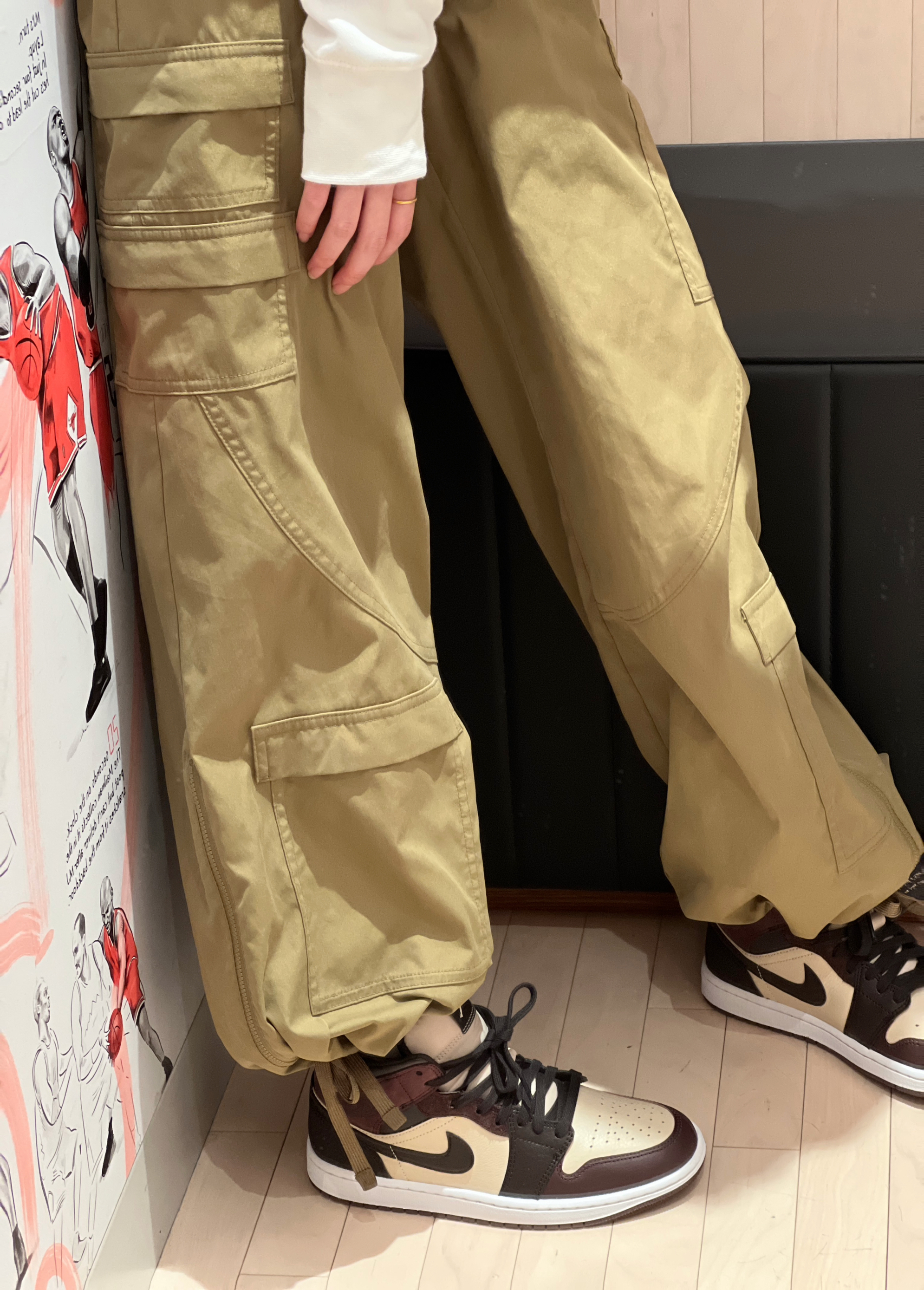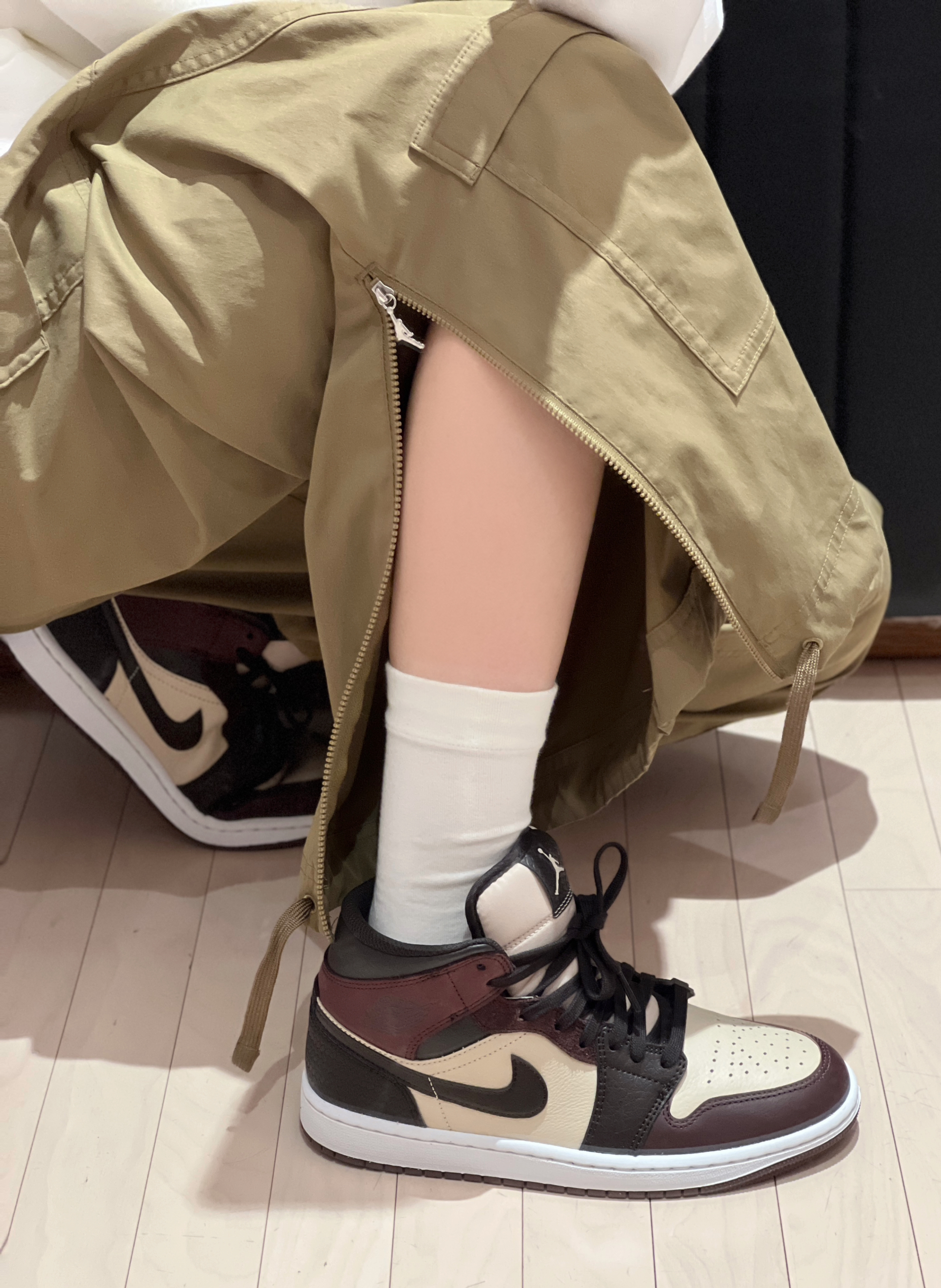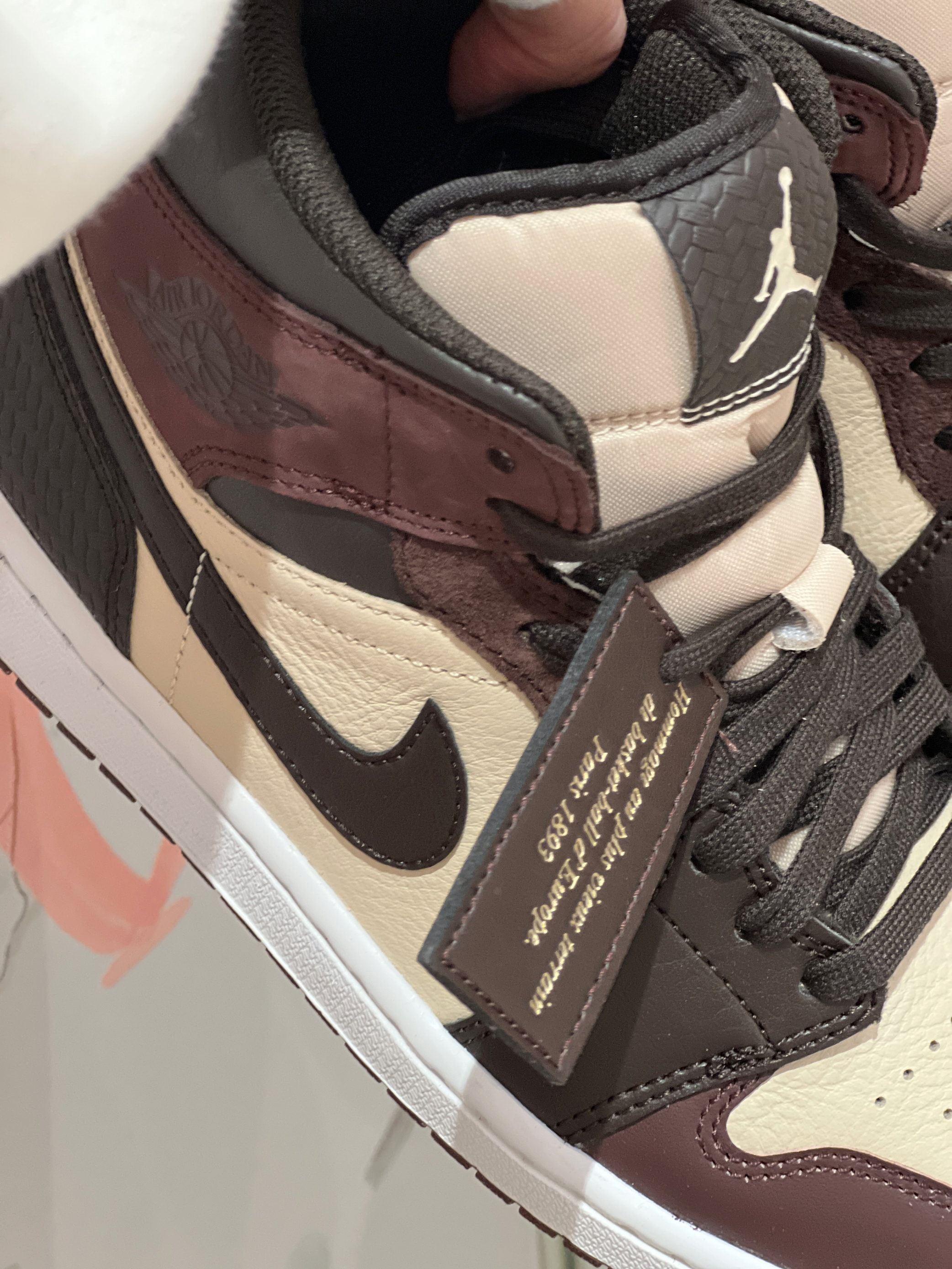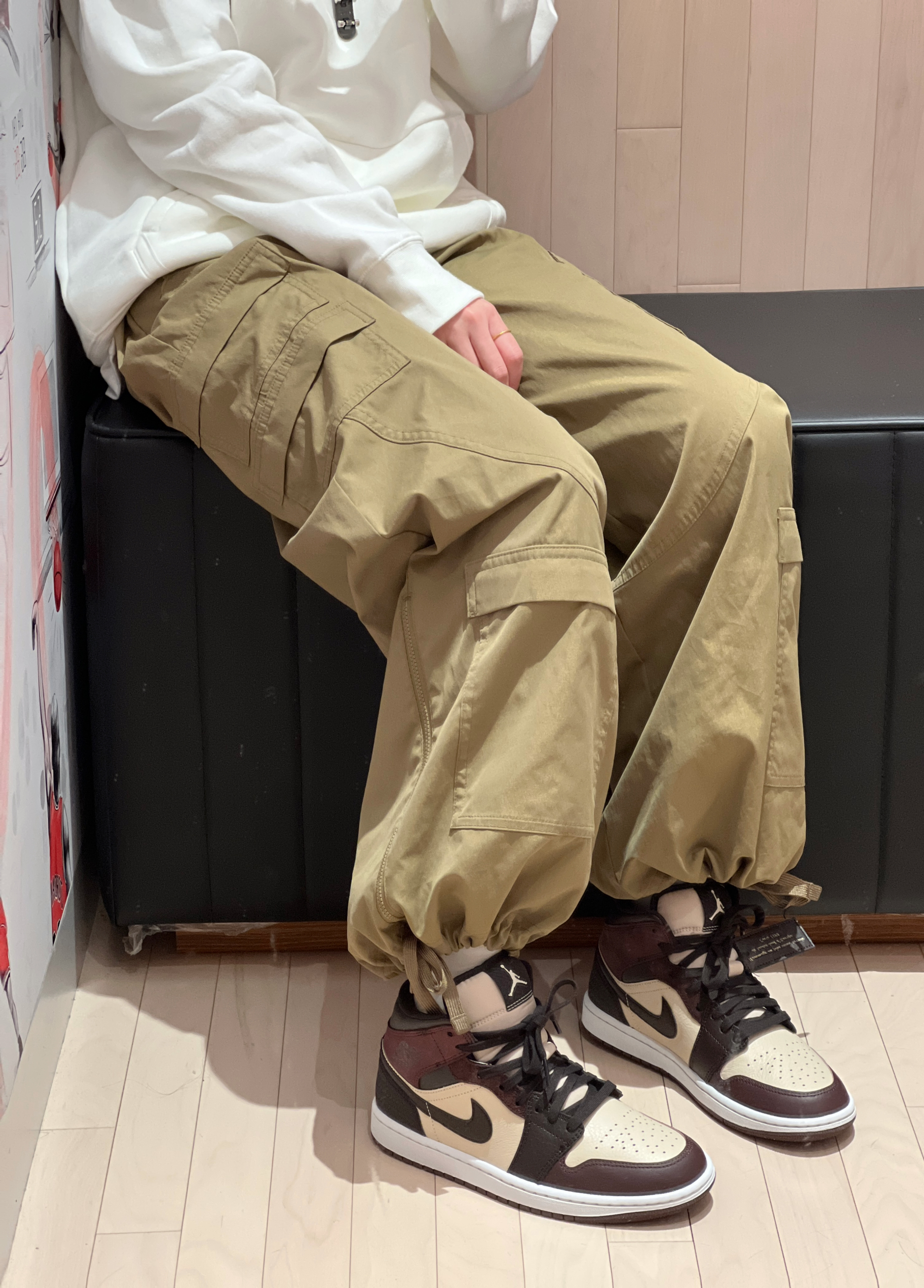 今日穿搭复古风 白色大巴黎卫衣搭配棕色工装裤也太耐看了吧! 👟是AJ1mid黑棕色 整款鞋已棕色系打造鞋后跟采用 了编织的设计配件附赠了皮革制的标签皮质会比经典款柔软好多质感很不错👍 颜色很百搭😉