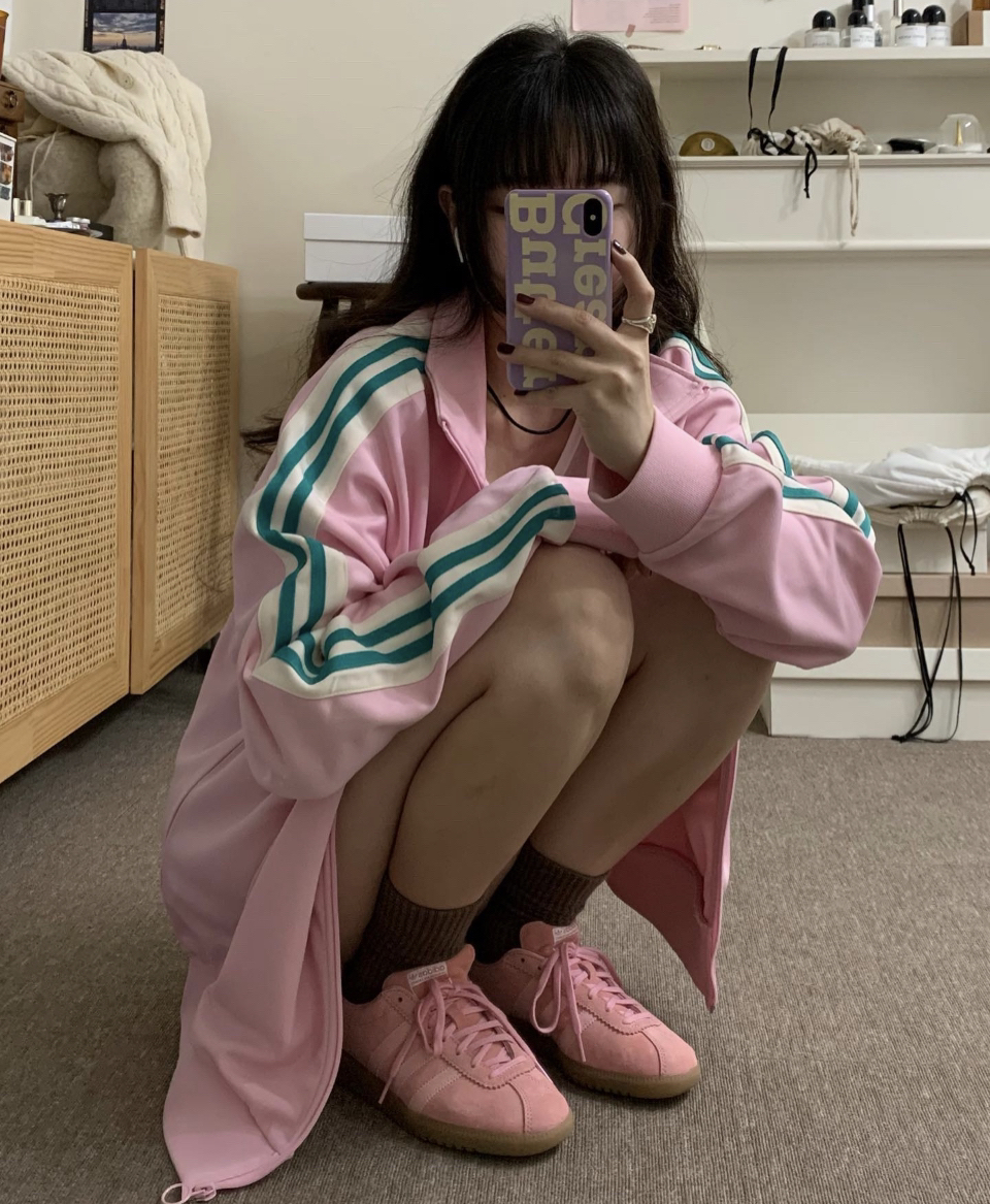 温柔甜美风的外套 搭配同色系的阿迪鞋子 一整套轻松舒适,青春活力💖