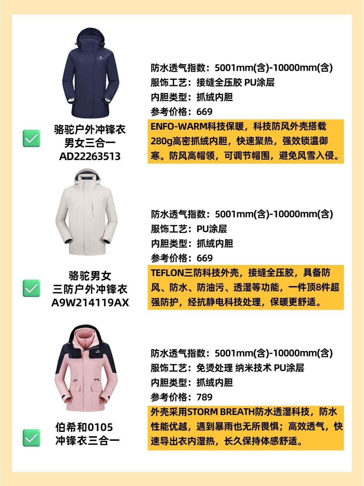 冬天怎么能没有一件冲锋衣做战服! 上期给大家分享了如何选冲锋衣,有兴趣的小伙伴可以去了解一下~ 没赶上的也不要紧,这期直接给大家上推荐干货😎!高颜值高性能,款款都是六边形战士! - 1️⃣骆驼户外冲锋衣男女三合一AD22263513 参考价格:669 ENFO-WARM科技保暖,强效锁温御寒。防风高帽领,可调节帽围,避免风雪入侵。 - 2️⃣骆驼男女三防户外冲锋衣A9W214119AX 参考价格:...