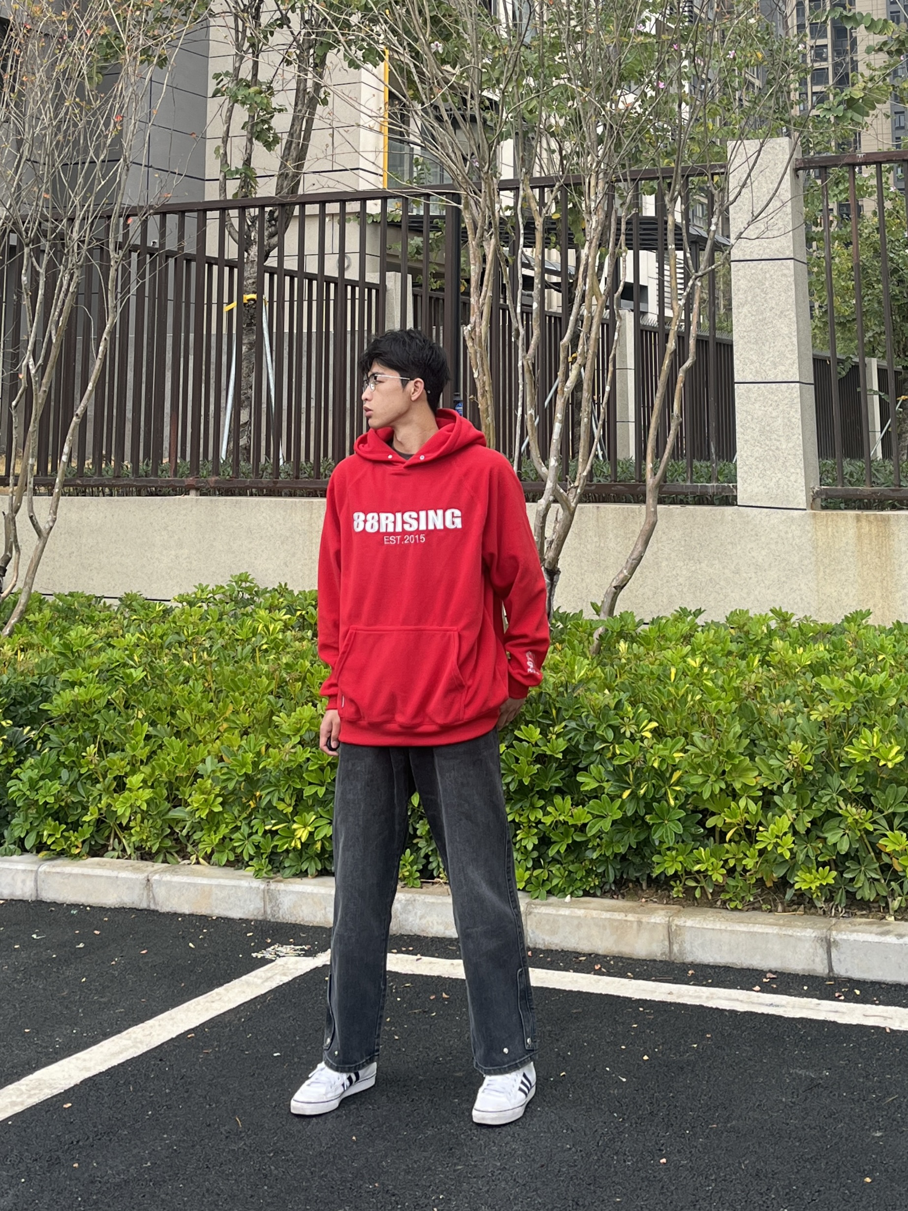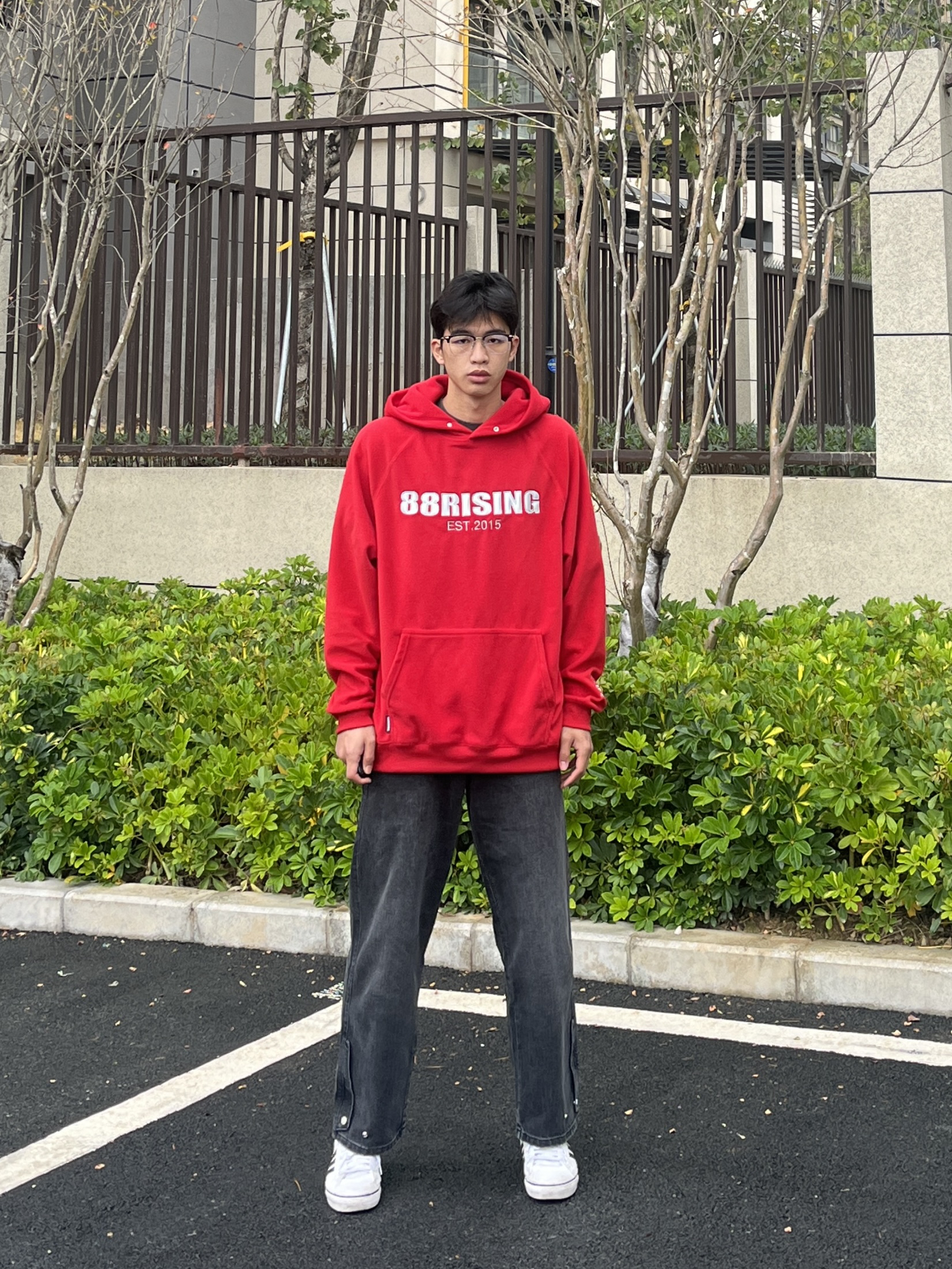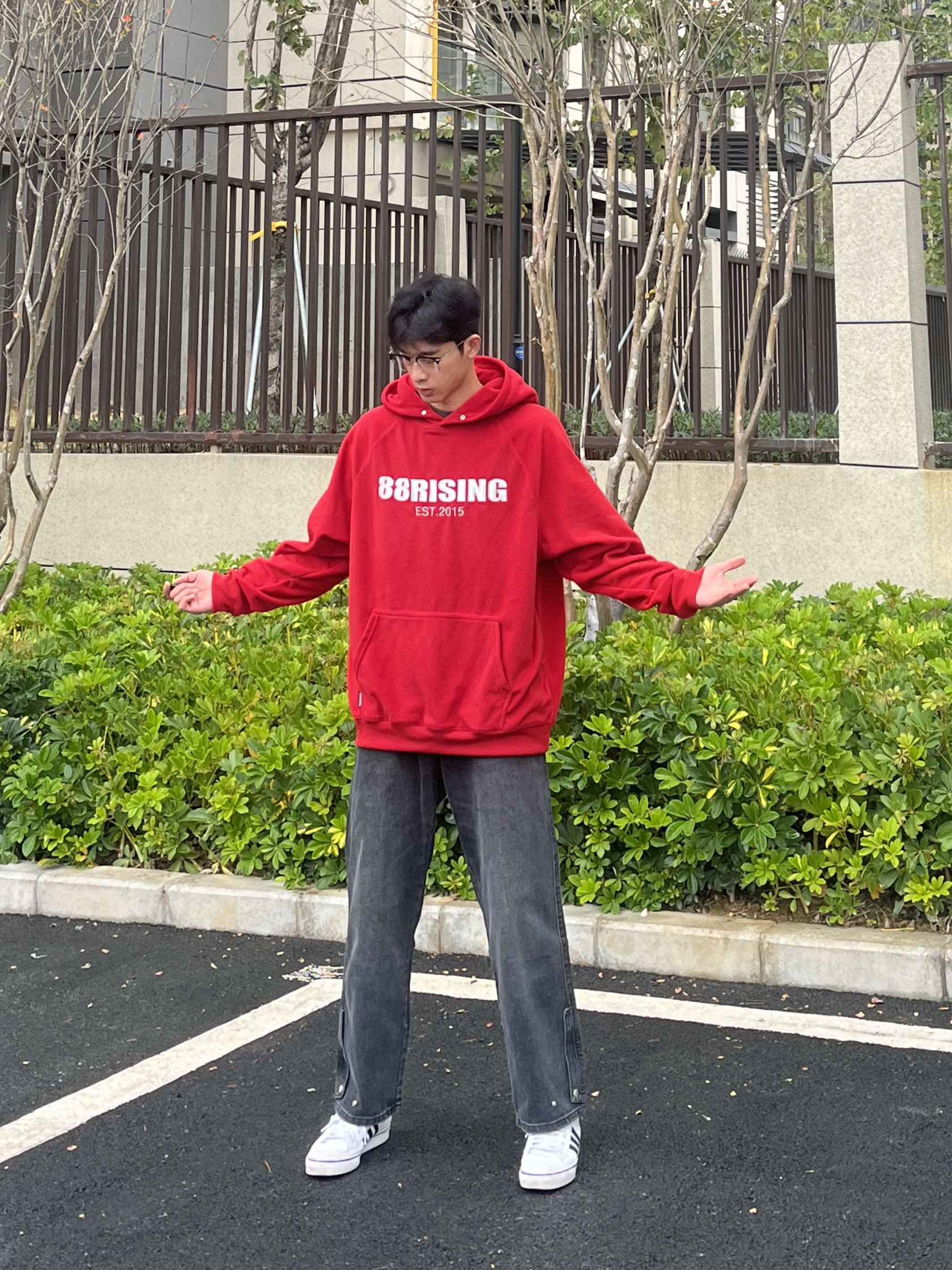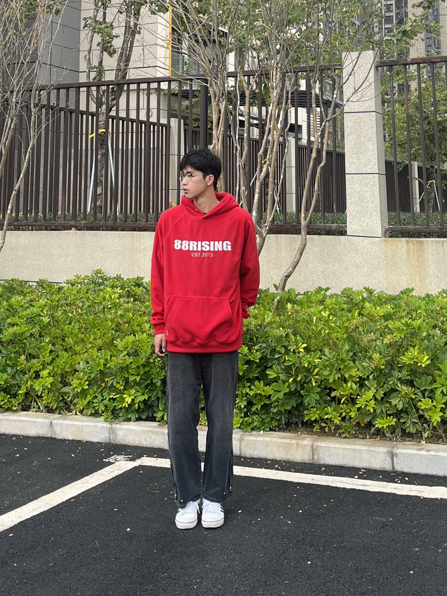 百变风格 不变的我 兄弟们大家好 今天分享一套红色穿搭 新年就是要红色穿搭 上衣是来自88rising家的AW23红色的连帽卫衣 裤子是一条简约直筒的黑色牛仔裤 尺码方面本人185/75kg选用尺码xxl码
