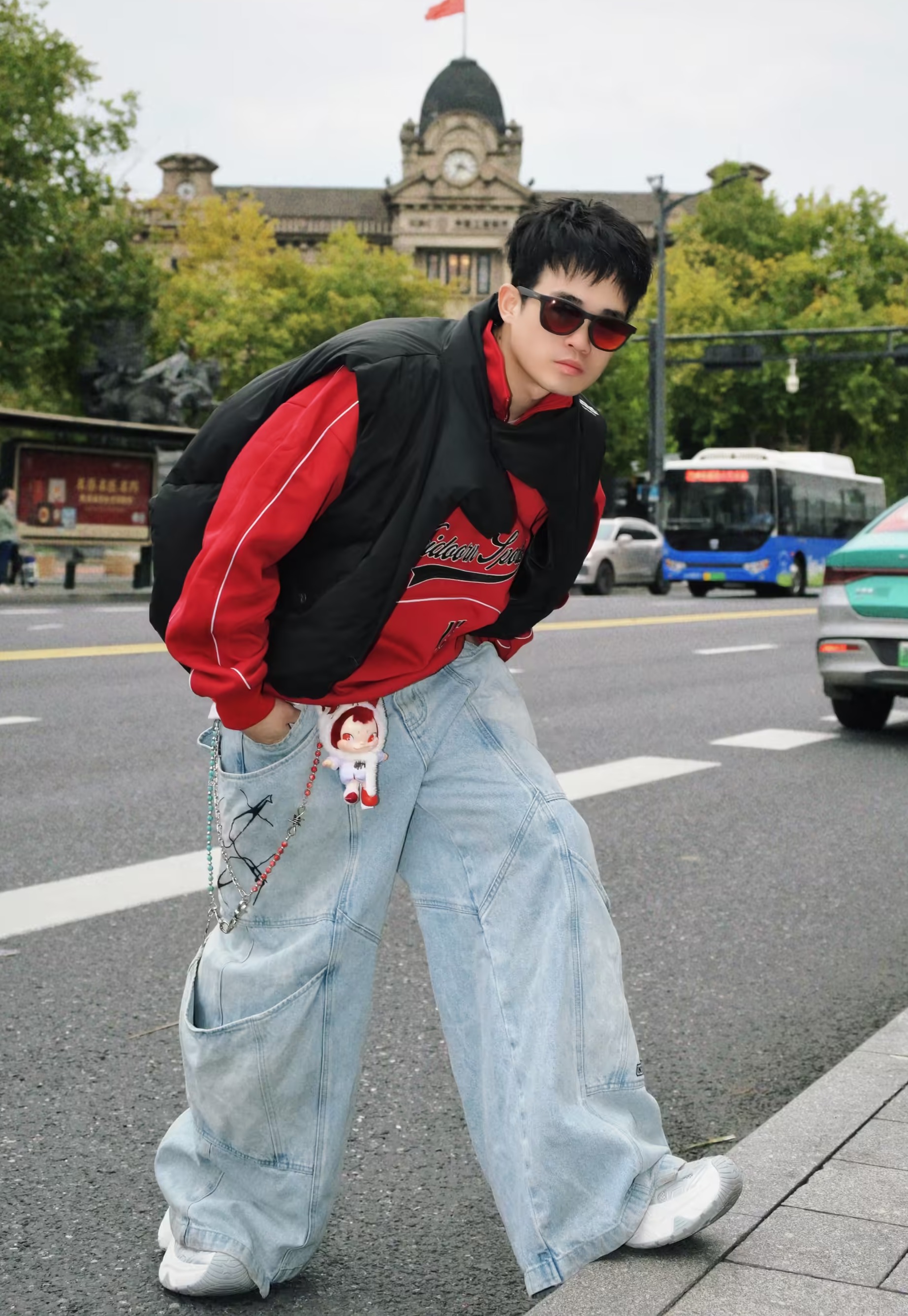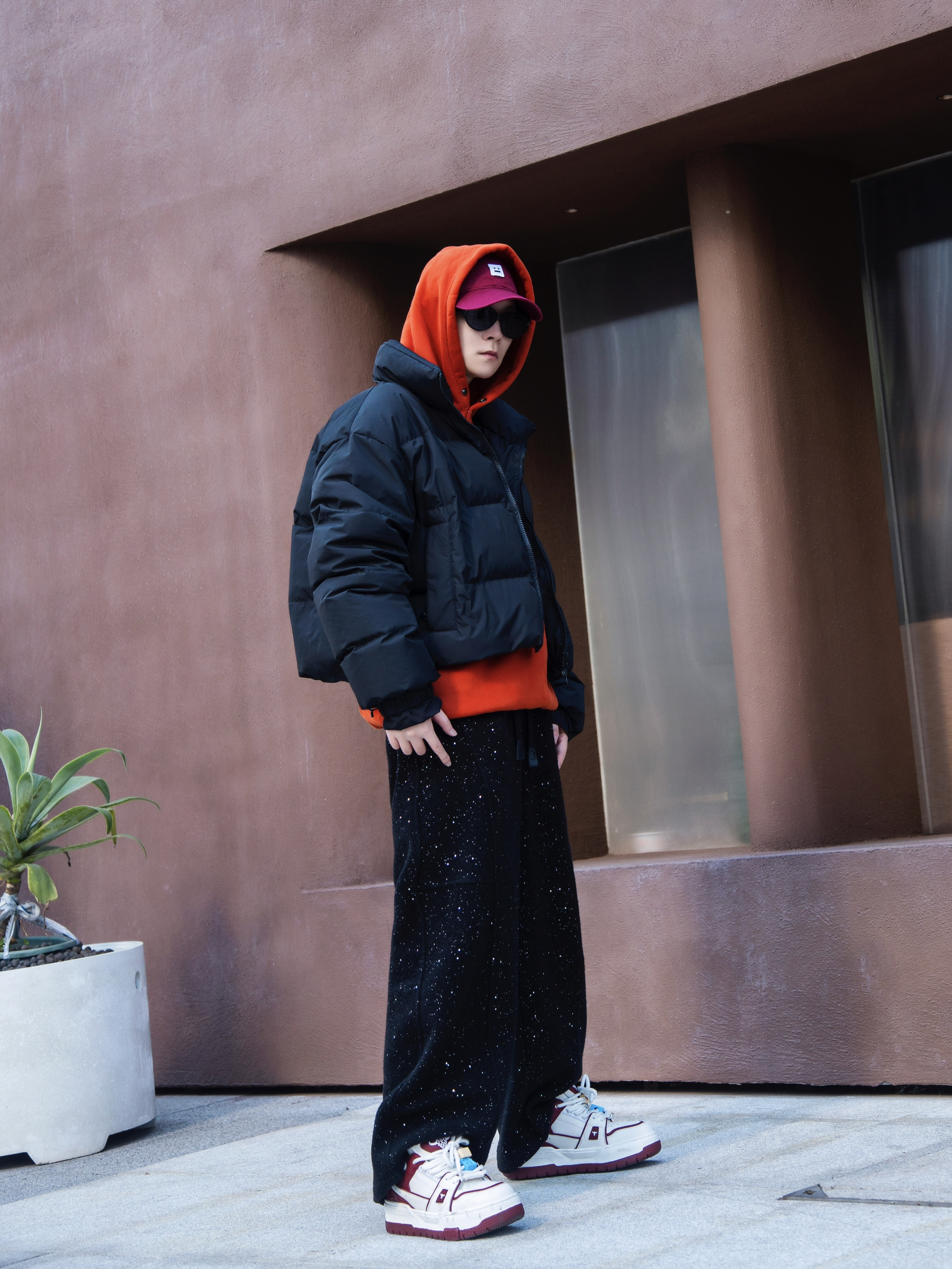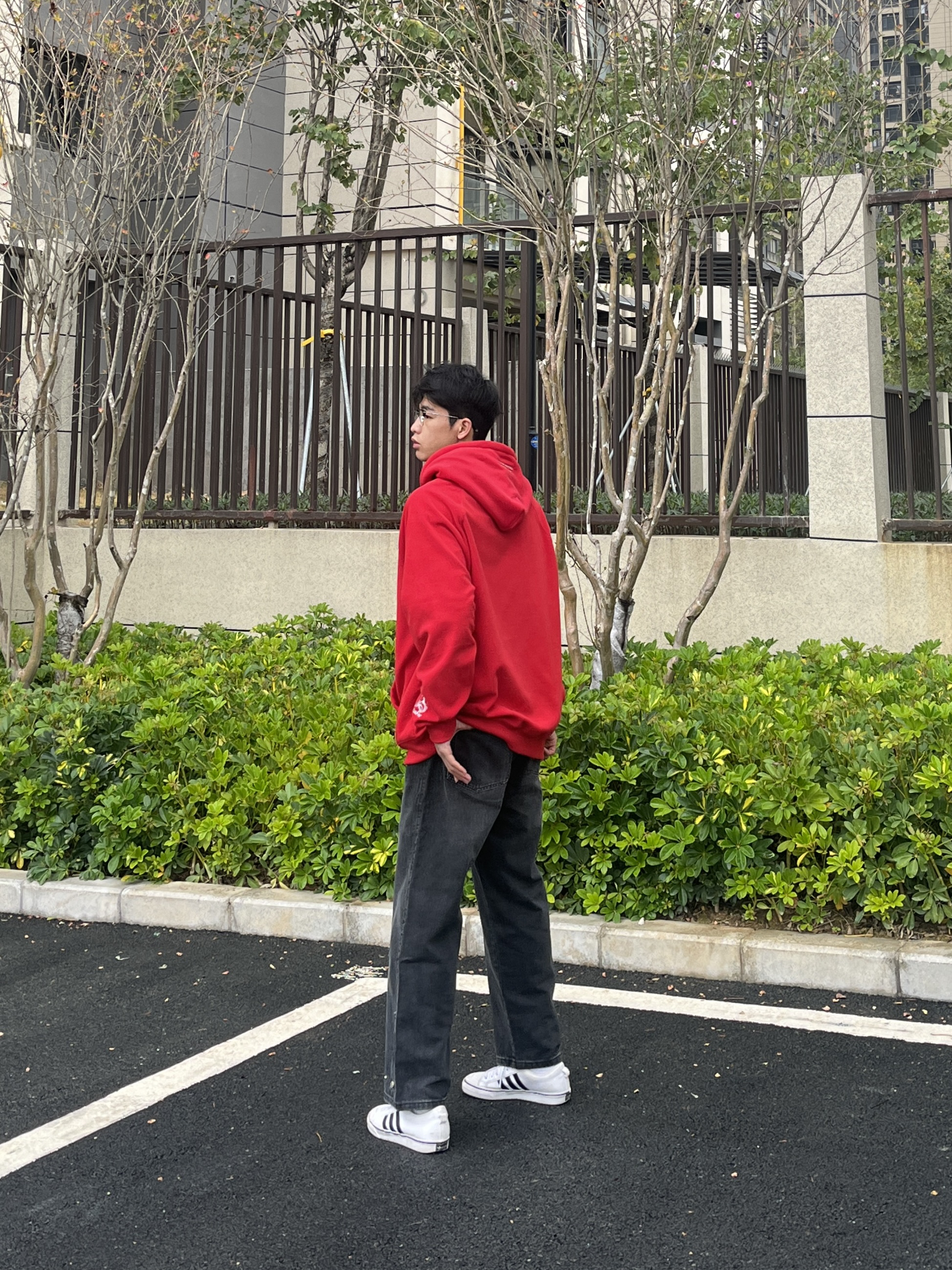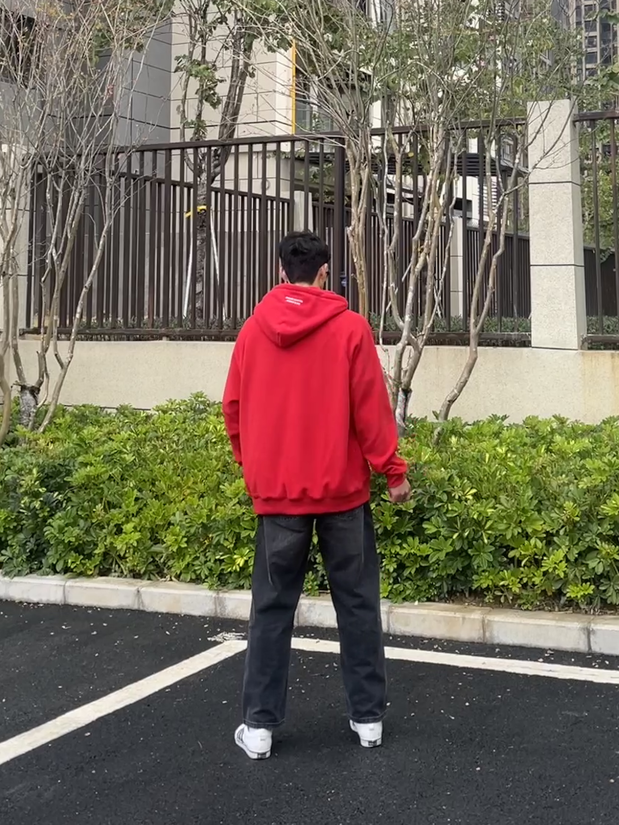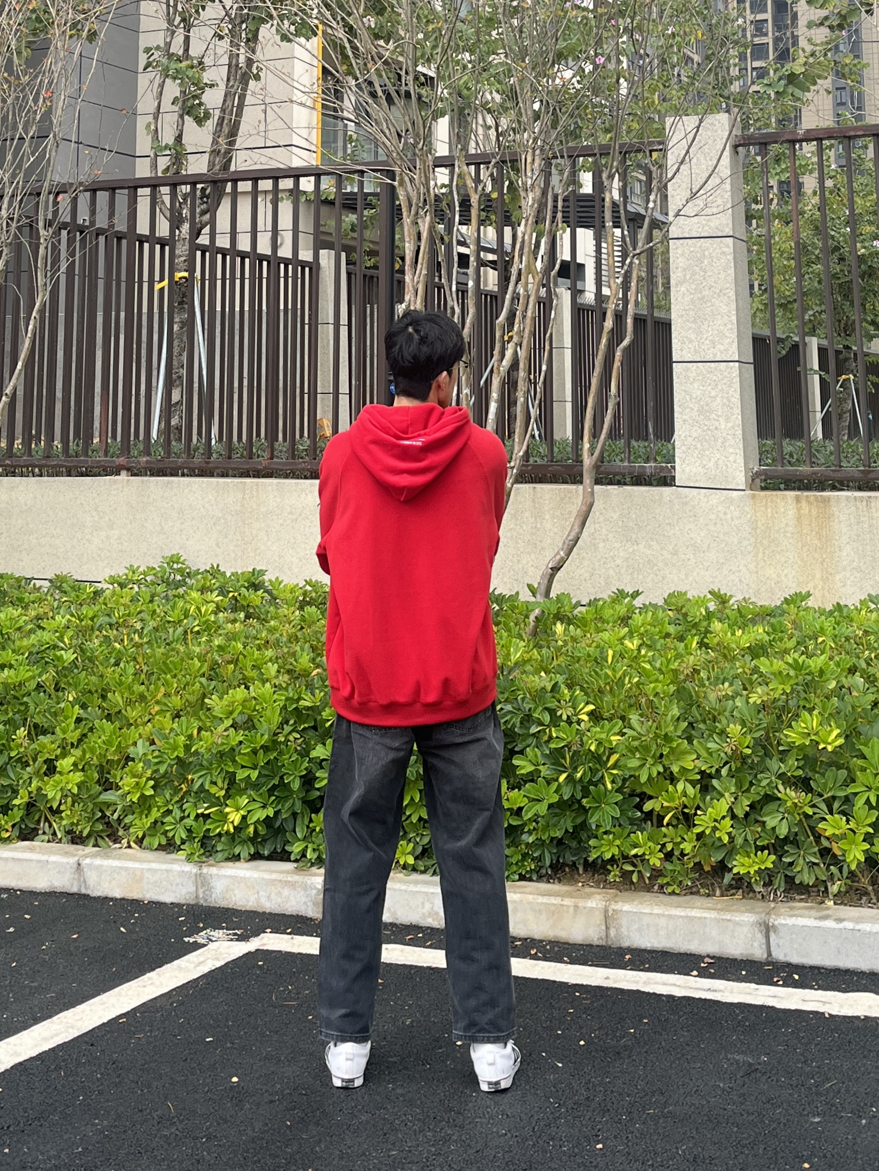 百变风格 不变的我 兄弟们大家好 今天分享一套红色穿搭 新年就是要红色穿搭 上衣是来自88rising家的AW23红色的连帽卫衣 裤子是一条简约直筒的黑色牛仔裤 尺码方面本人185/75kg选用尺码xxl码
