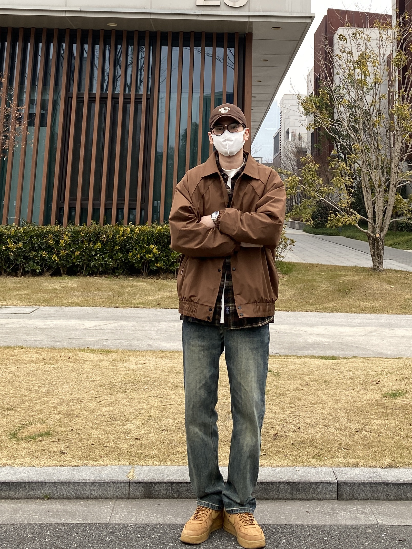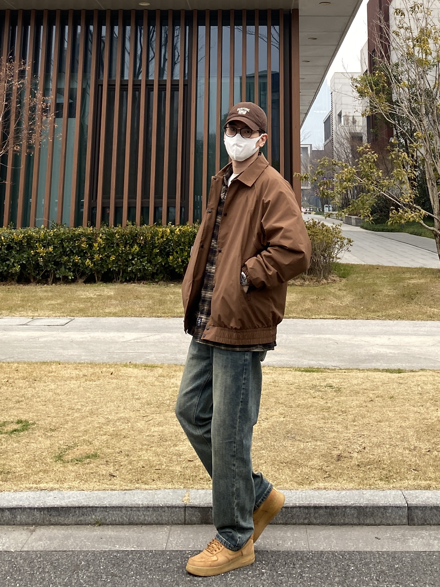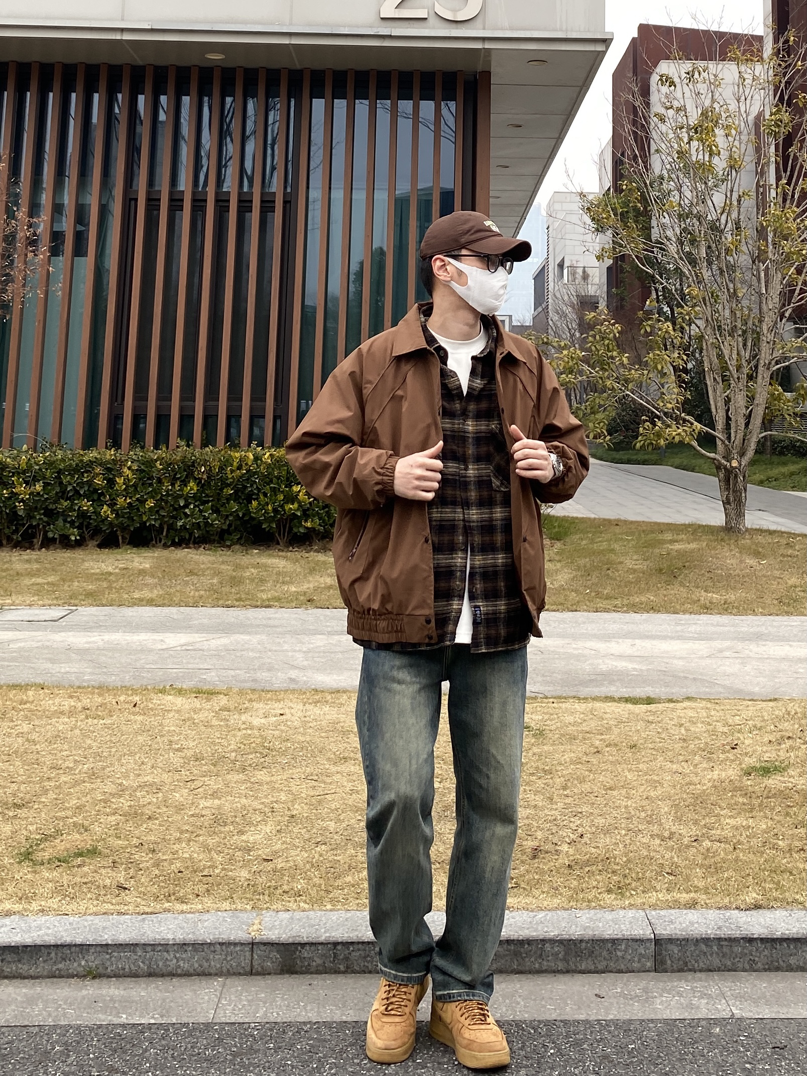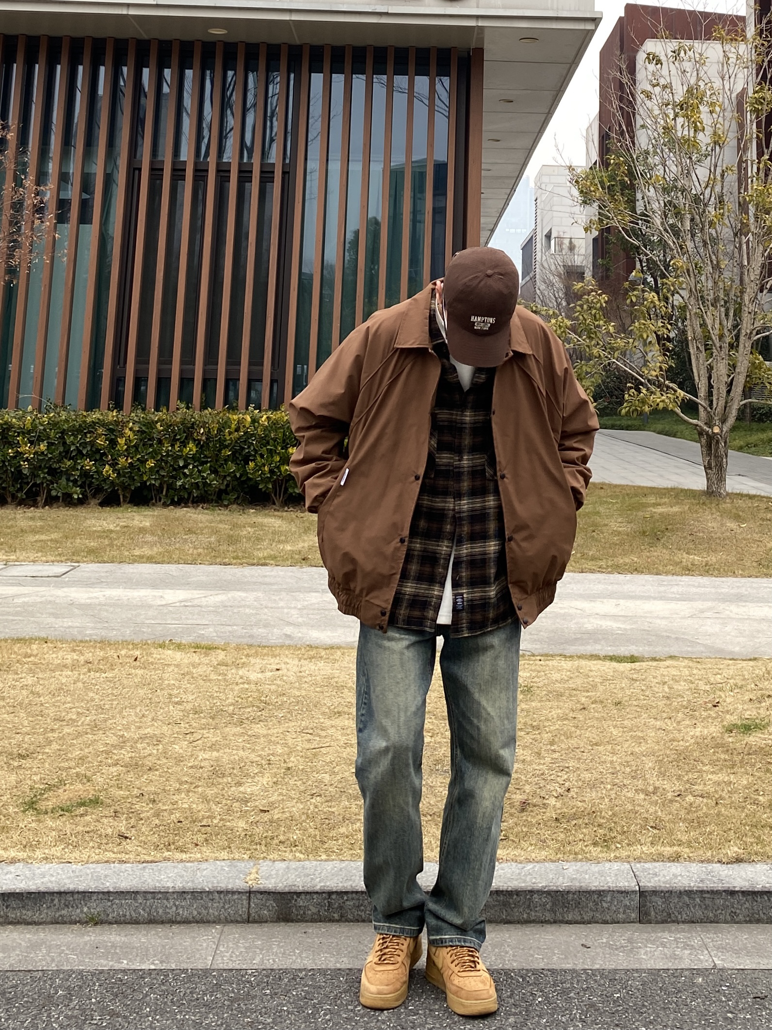 今天这套先用咖啡色磨毛格子做内搭,裤子选择简约大方的水洗直筒牛仔裤,鞋子上脚经典百搭的小麦色af1,接着套上深棕色宽松阔版轻机能教练夹克,最后戴一顶棒球帽呼应下衣服的颜色,OK,出门看看搭配效果吧! - 今日穿搭 衣服裤子:NICE LILI 鞋子:AF1小麦