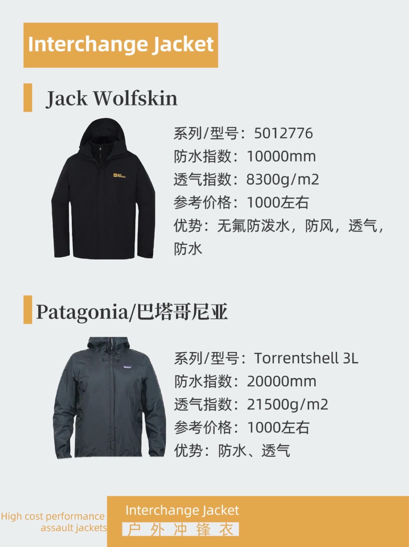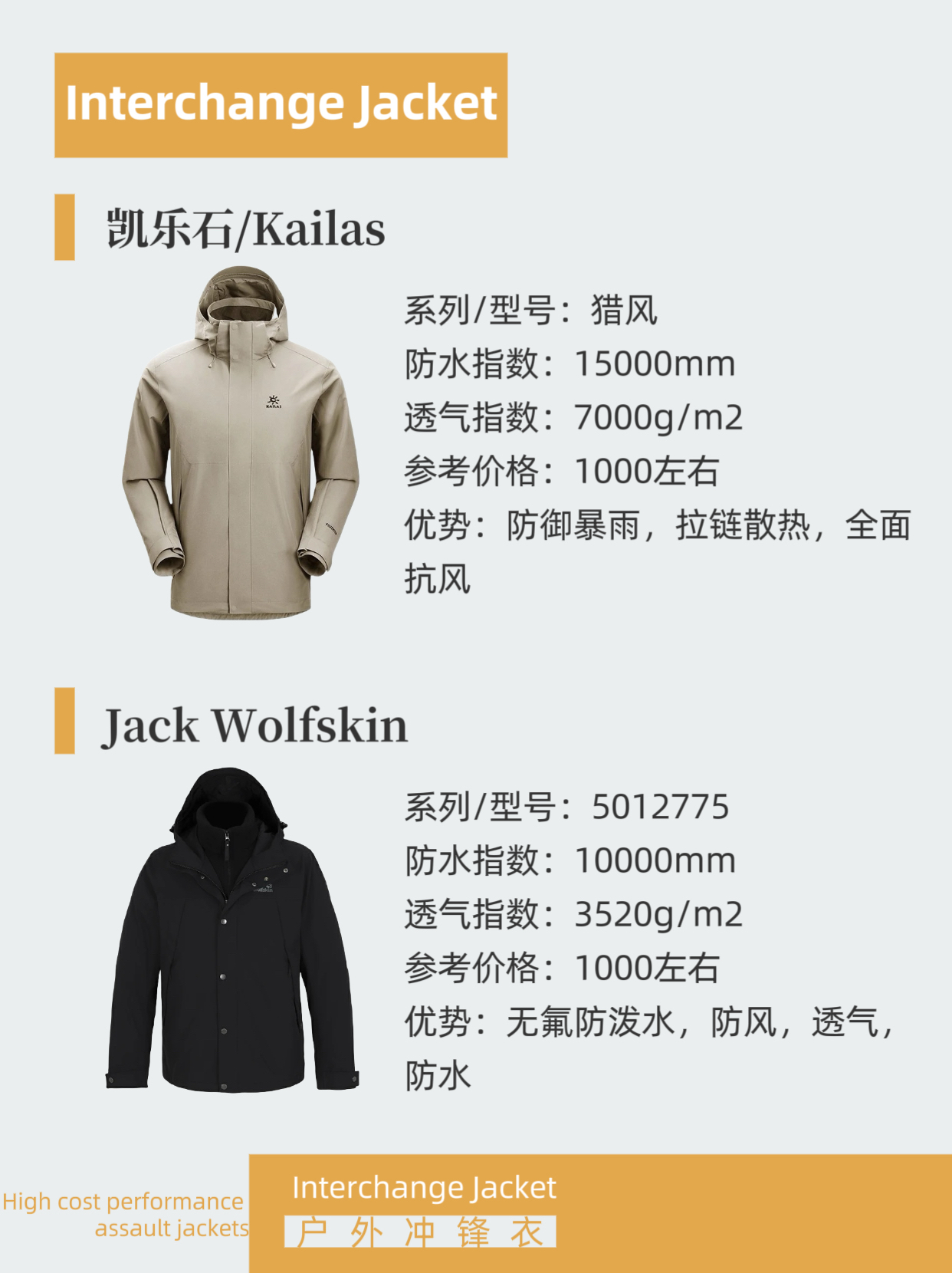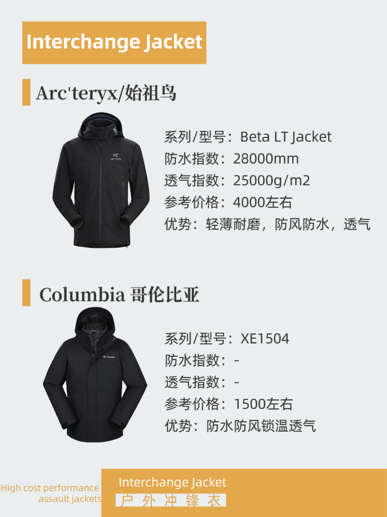 1️⃣「Arc'teryx/始祖鸟」 ✨ 系列/型号:Beta LT Jacket 防水指数:28000mm 透气指数:25000g/m2 参考价格:4000左右 优势:轻薄耐磨,防风防水,透气 2️⃣「Columbia 哥伦比亚」 ✨ 系列/型号:XE1504 防水指数:- 透气指数:- 参考价格:1500左右 优势:防水防风锁温透气 3️⃣「凯乐石/Kailas」 ✨ 系列/型号:猎风...