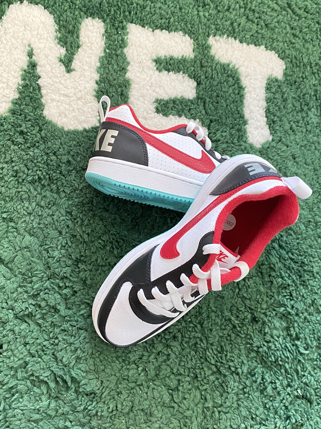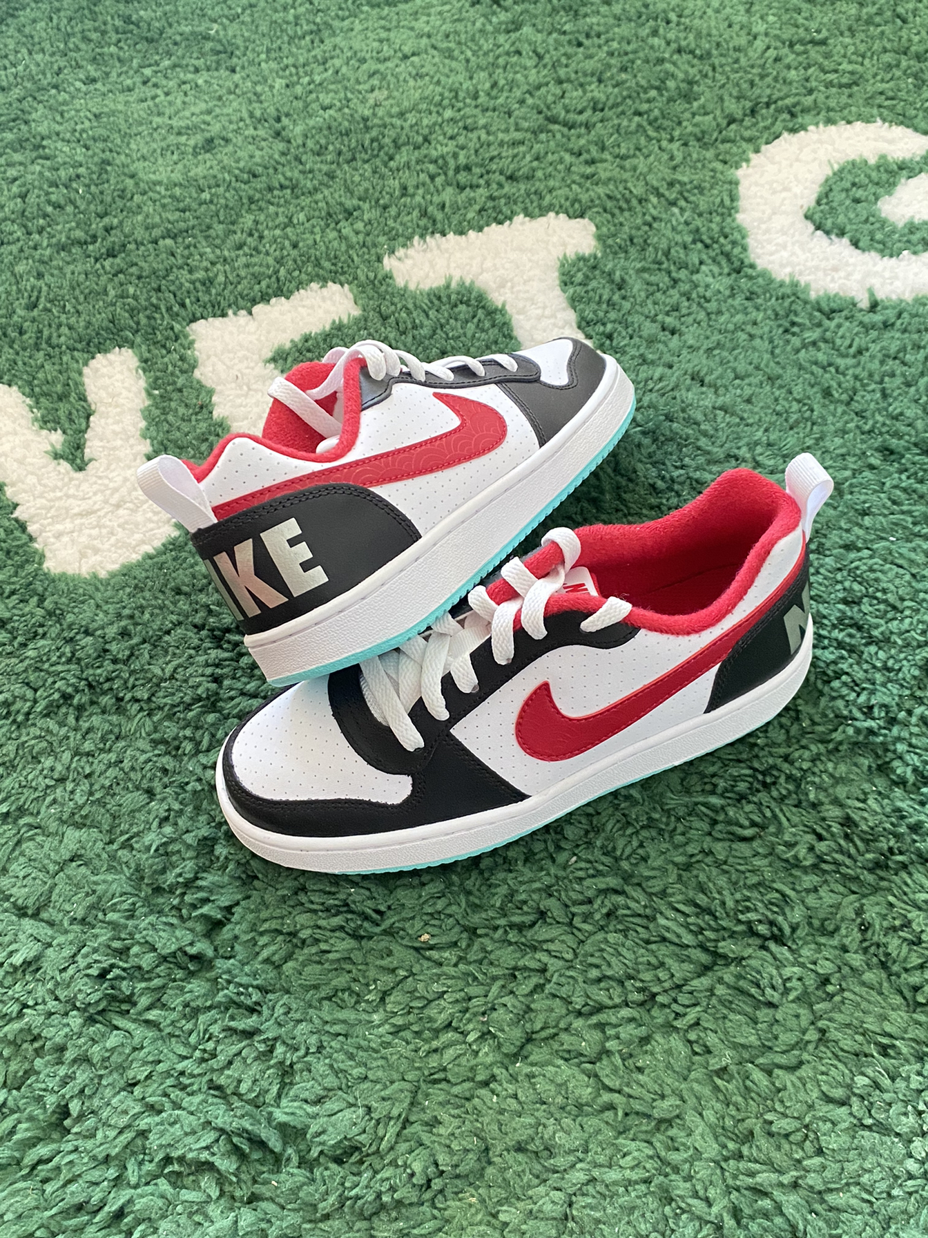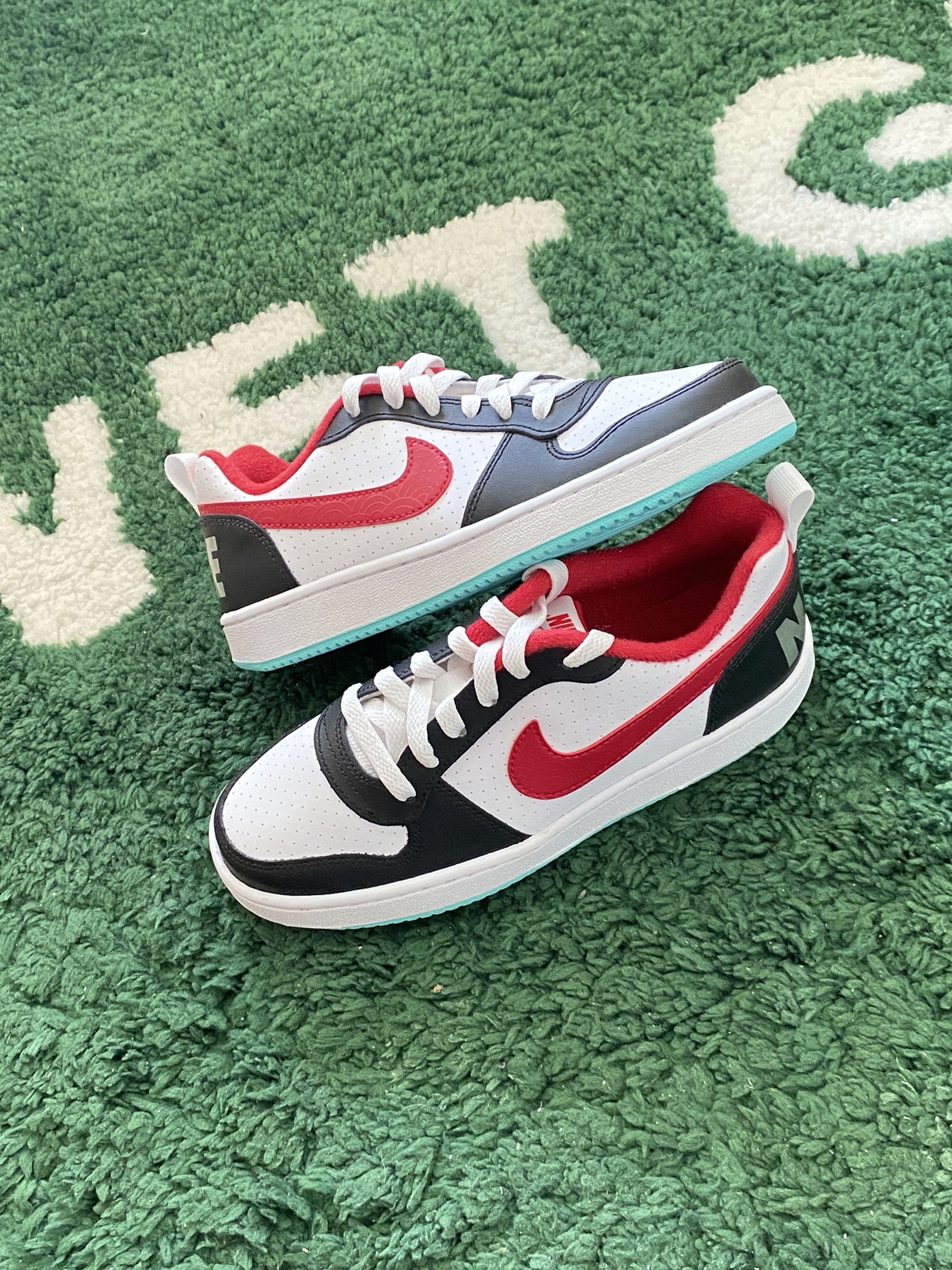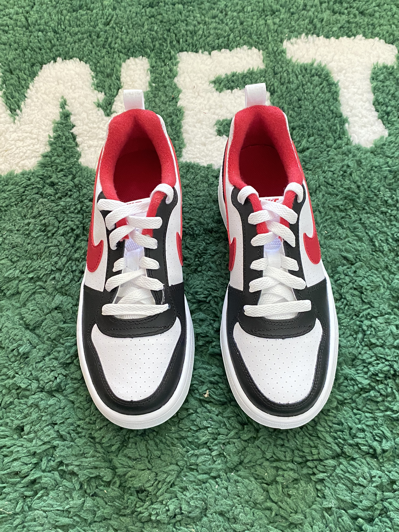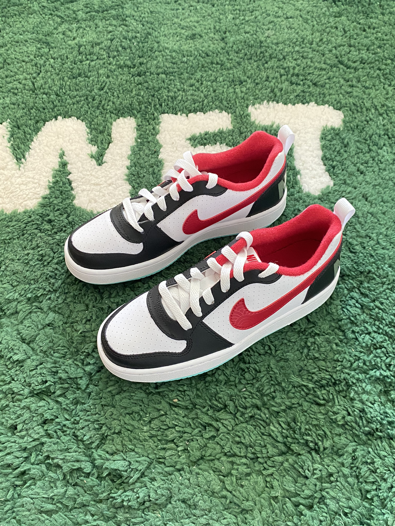 今日开箱📦球鞋 Nike Court Borough黑白红 鞋款配色由黑白两色为主红色为辅点缀 色调较为高级 穿搭属性较好 合成革质感还是可以勉强接受 搭配牛仔裤效果就不错 大家觉得这双鞋款怎么样🤔