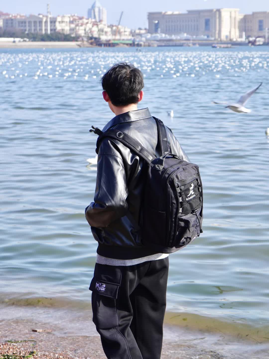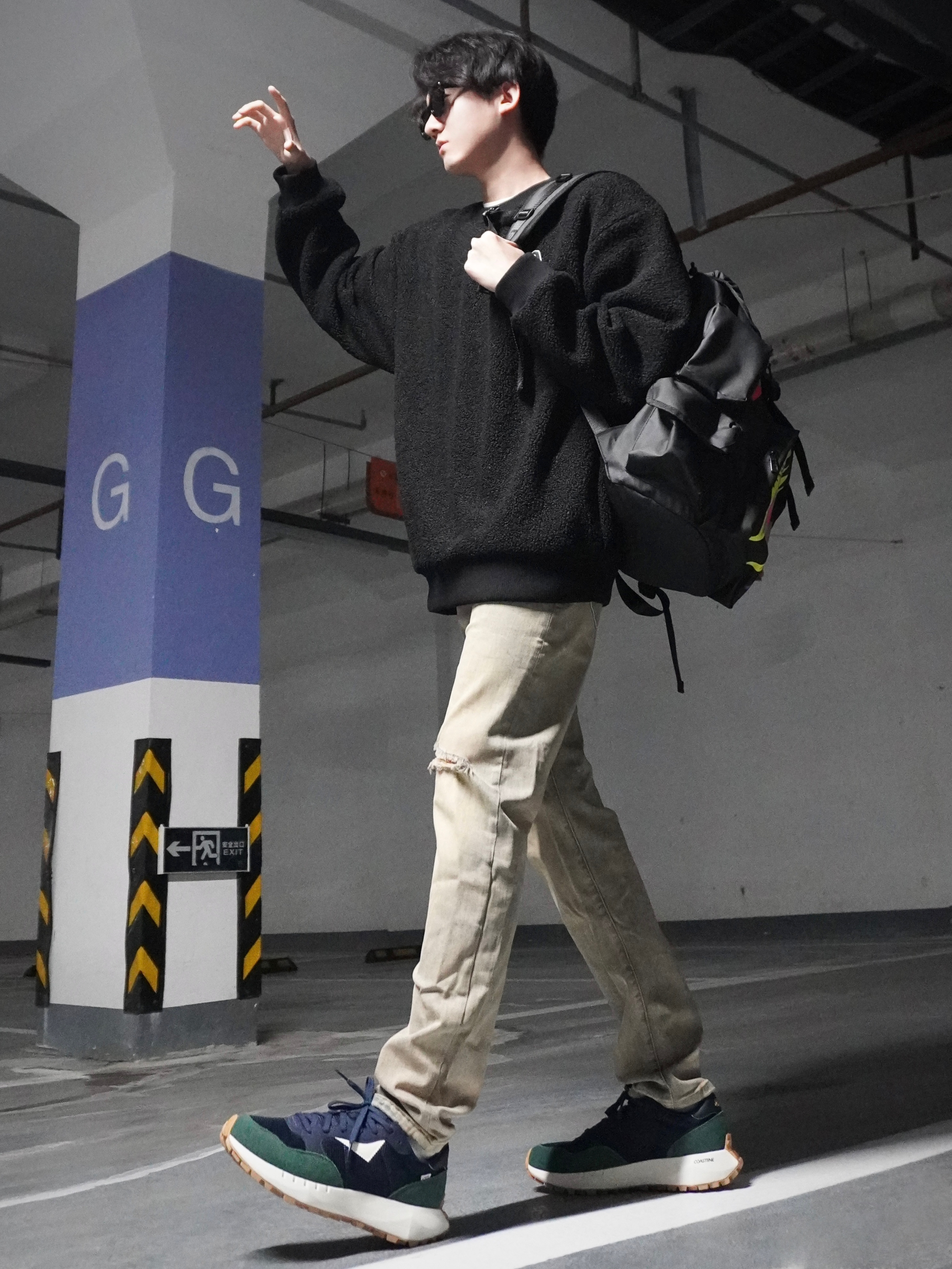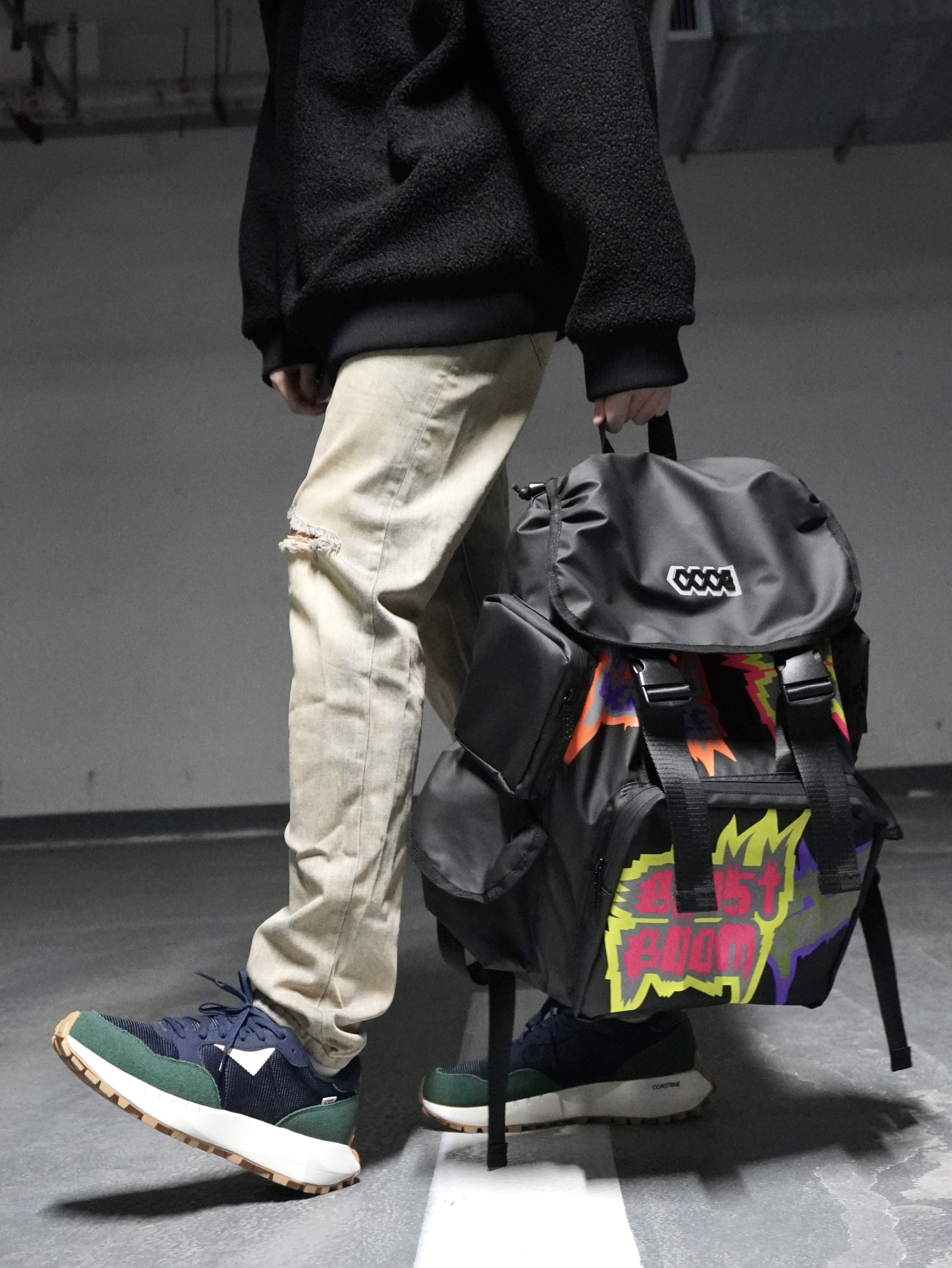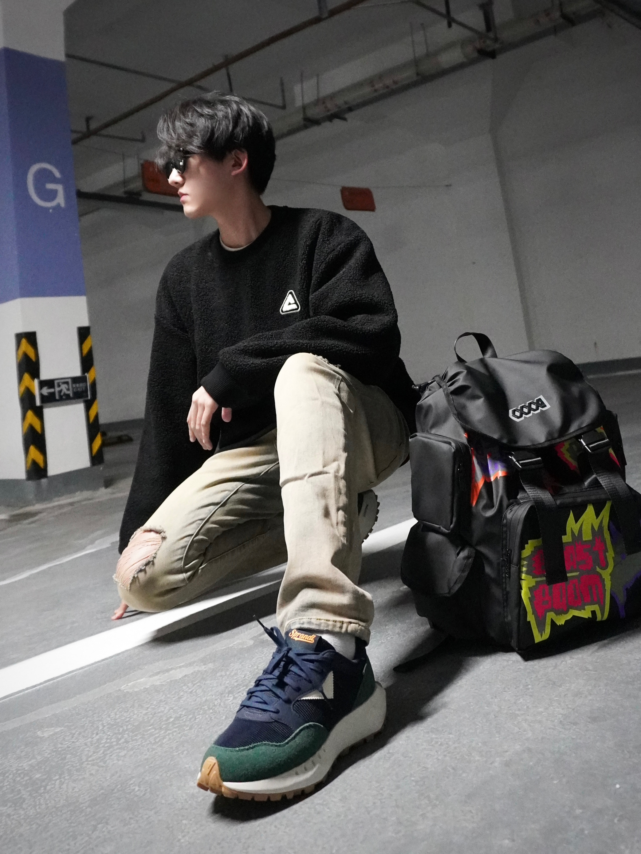 经常出差当然少不了一款旅行双肩包 最近入手了COEXISTENCE这款大容量包 平时旅行游玩 或健身打球都很实用 双卡扣设计有很好的安全保障 包包面料是防水和耐刮材质 美式涂鸦外观看上去很有高级感 大容量可以放球鞋或替换衣物 送人或者自用都是不错的选择哦 搭配黑色抓绒卫衣和修身破洞牛仔裤 再选择一双舒适复古的运动鞋 新年和朋友出去玩 给你搭配好啦!