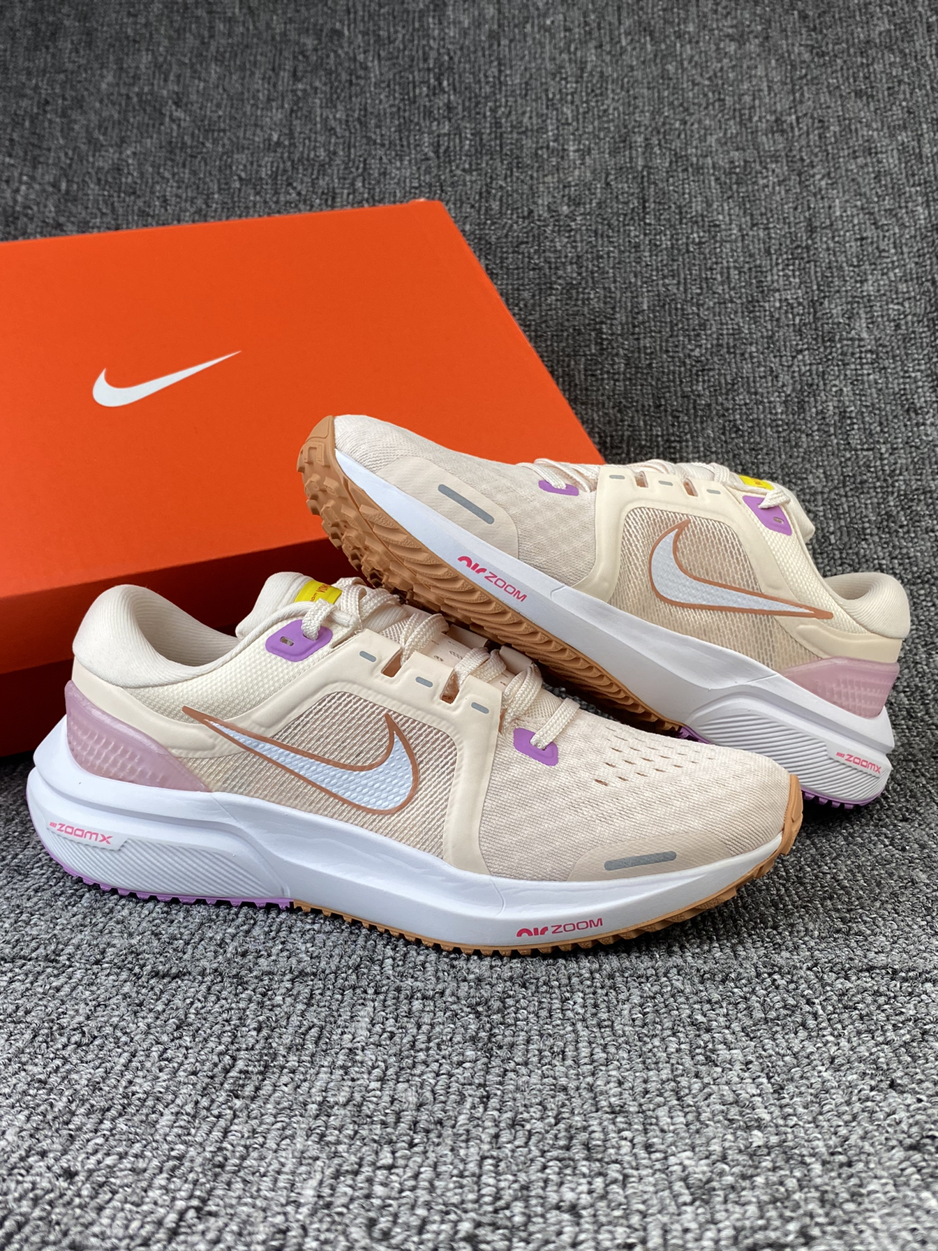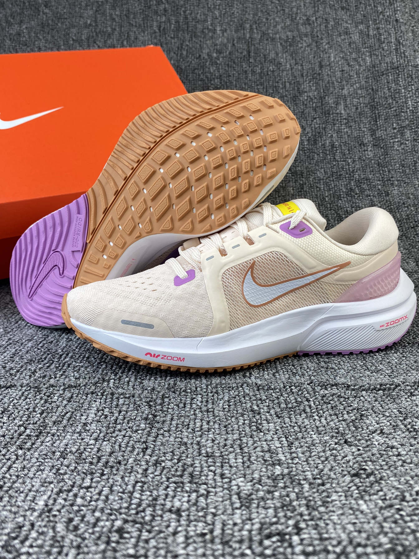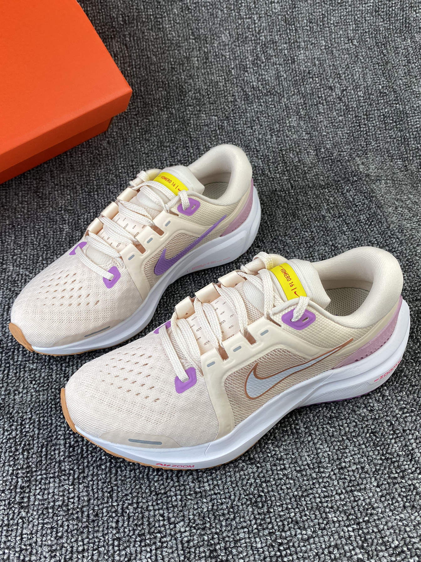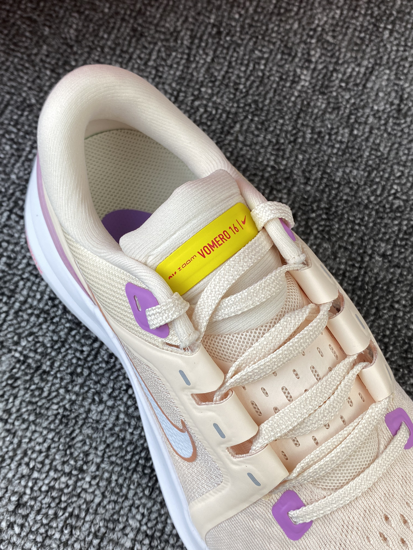 Vomero 16跑鞋还是比较小众的 但不得不说脚感真的很好 分享一下这双少女感配色 鞋子以粉色为主,紫色加上黄色点缀其中 整体很有活力感,少女感拉满 鞋面是织物材质,透气性不错 中底配置为前掌气垫➕全掌泡棉配置 上脚很舒适,可以明显感受到缓震感 尺码方面按平常穿的选择就可以啦