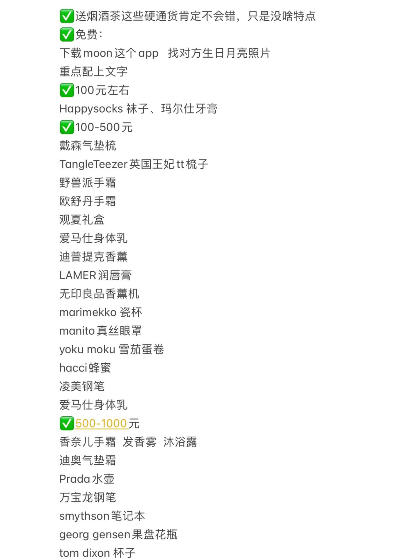 |送礼原则: 【低性价比、实用度高】 预算范围内选性价比最低的礼物 别人不舍得买 收了不舍得扔或转手 而且拿出来还倍儿有面子的。 例如预算500块,送小香的手霜就比送阿迪的运动服更惊艳 ✅送烟酒茶这些硬通货肯定不会错,只是没啥特点 ✅免费: 下载moon这个app 找对方生日月亮照片 重点配上文字 ✅100元左右 Happysocks 袜子、玛尔仕牙膏 ✅100-500元 戴...
