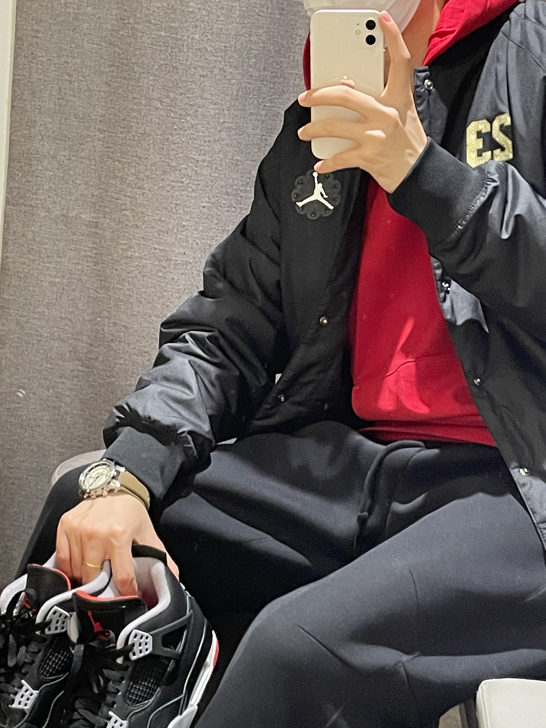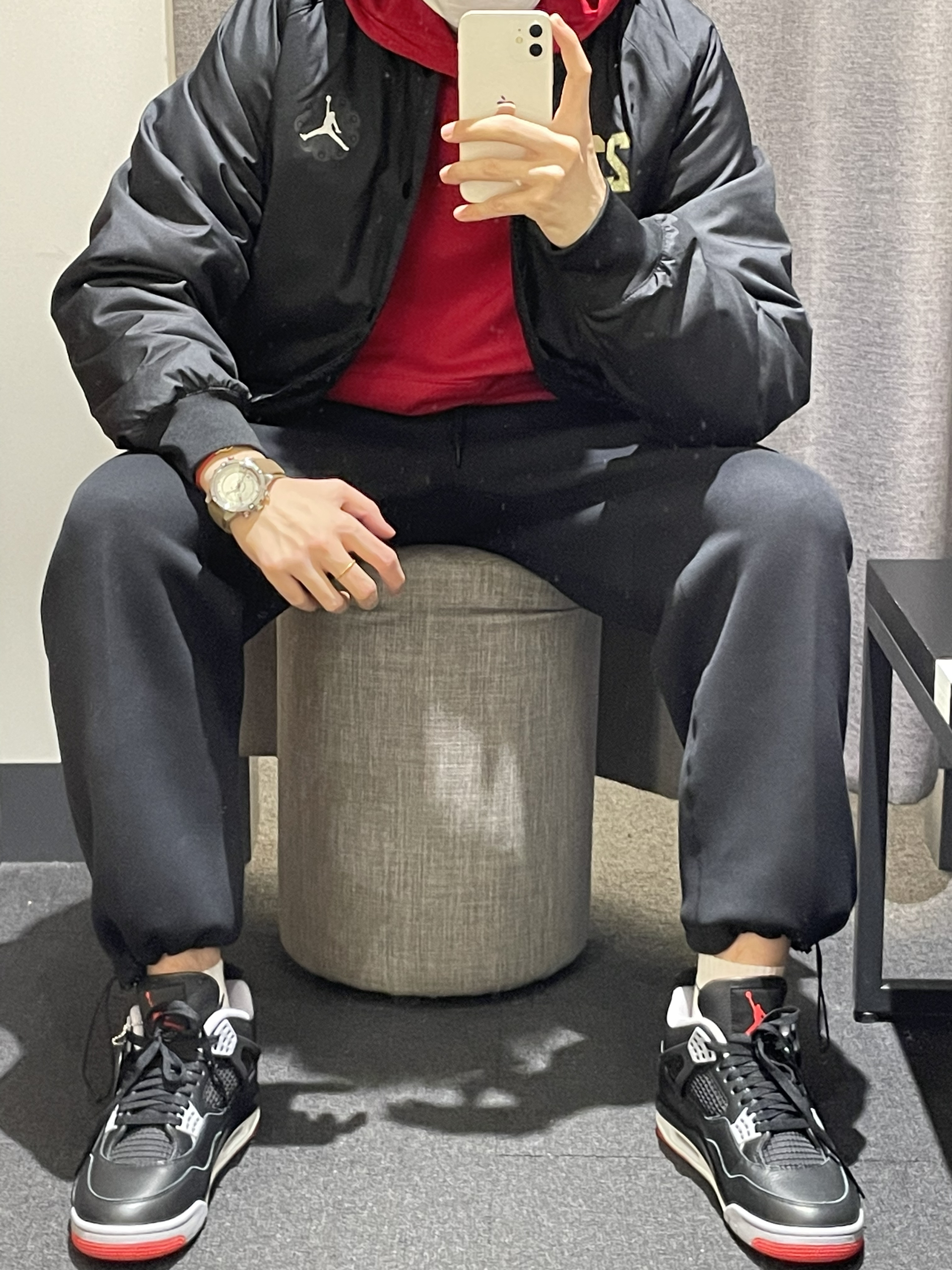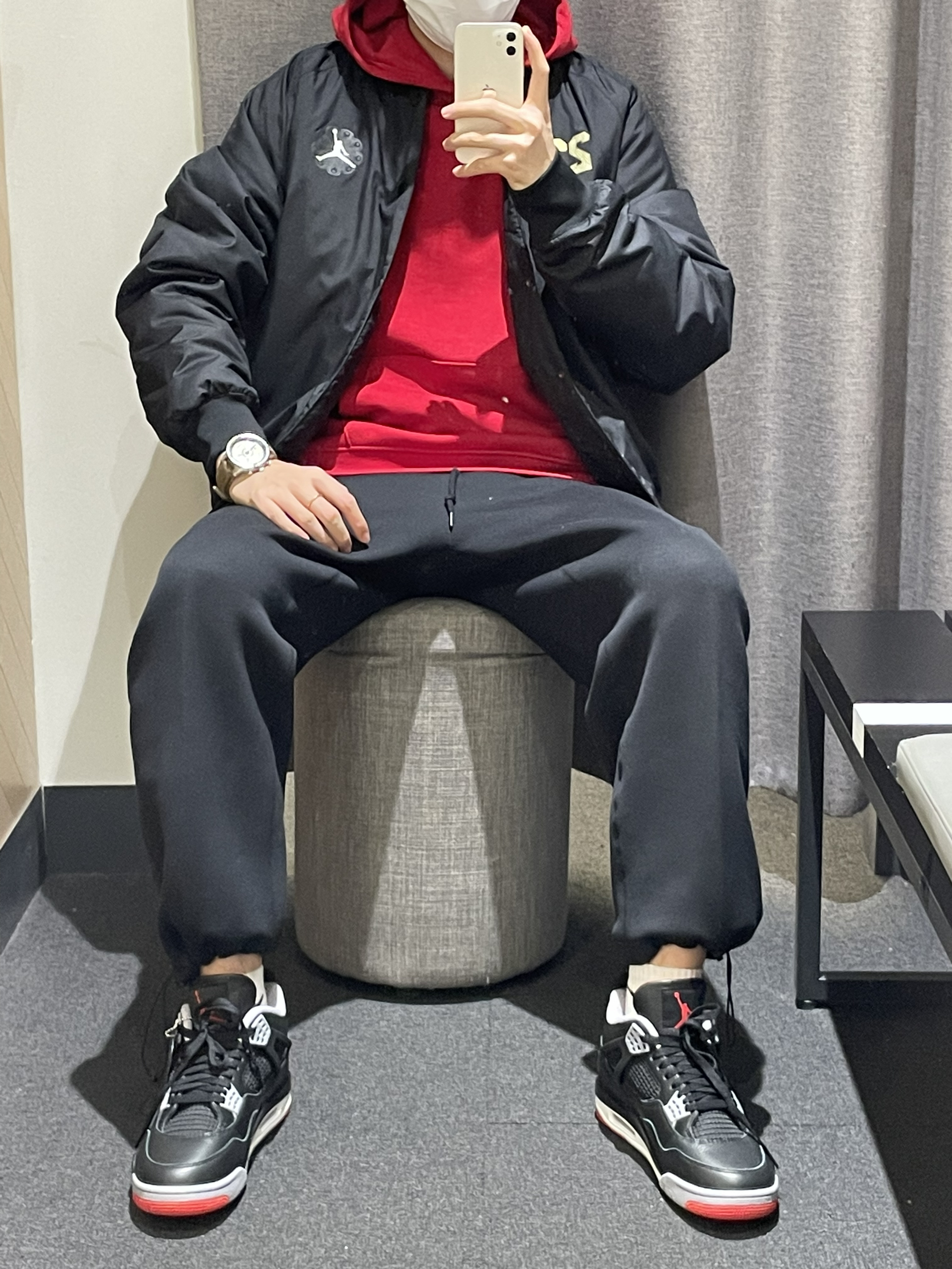 今天开箱一双Aj4的黑红的穿搭推荐!看图👀 首先搭配红色基础套头卫衣 搭配黑色飞行✈️夹克 单穿叠穿都是不错的选择的 搭配黑色直筒长裤👖 👟鞋子搭配的最近的发售的黑红 皮革材质易打理的