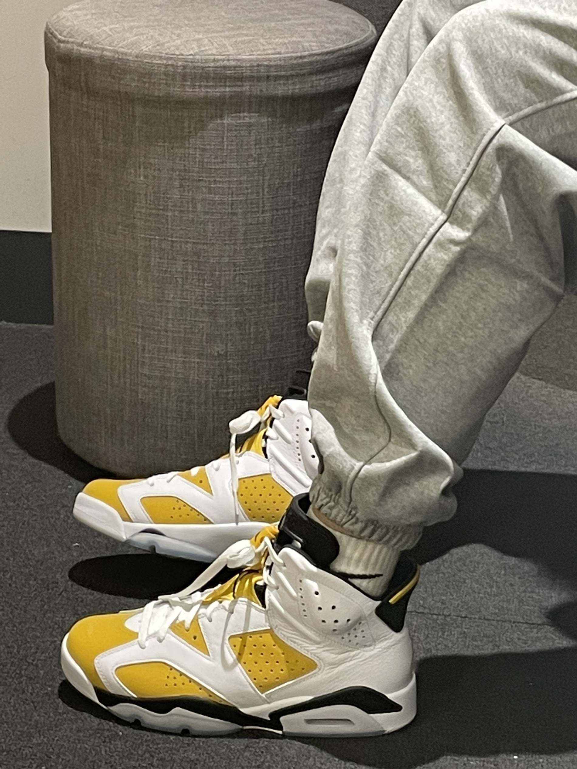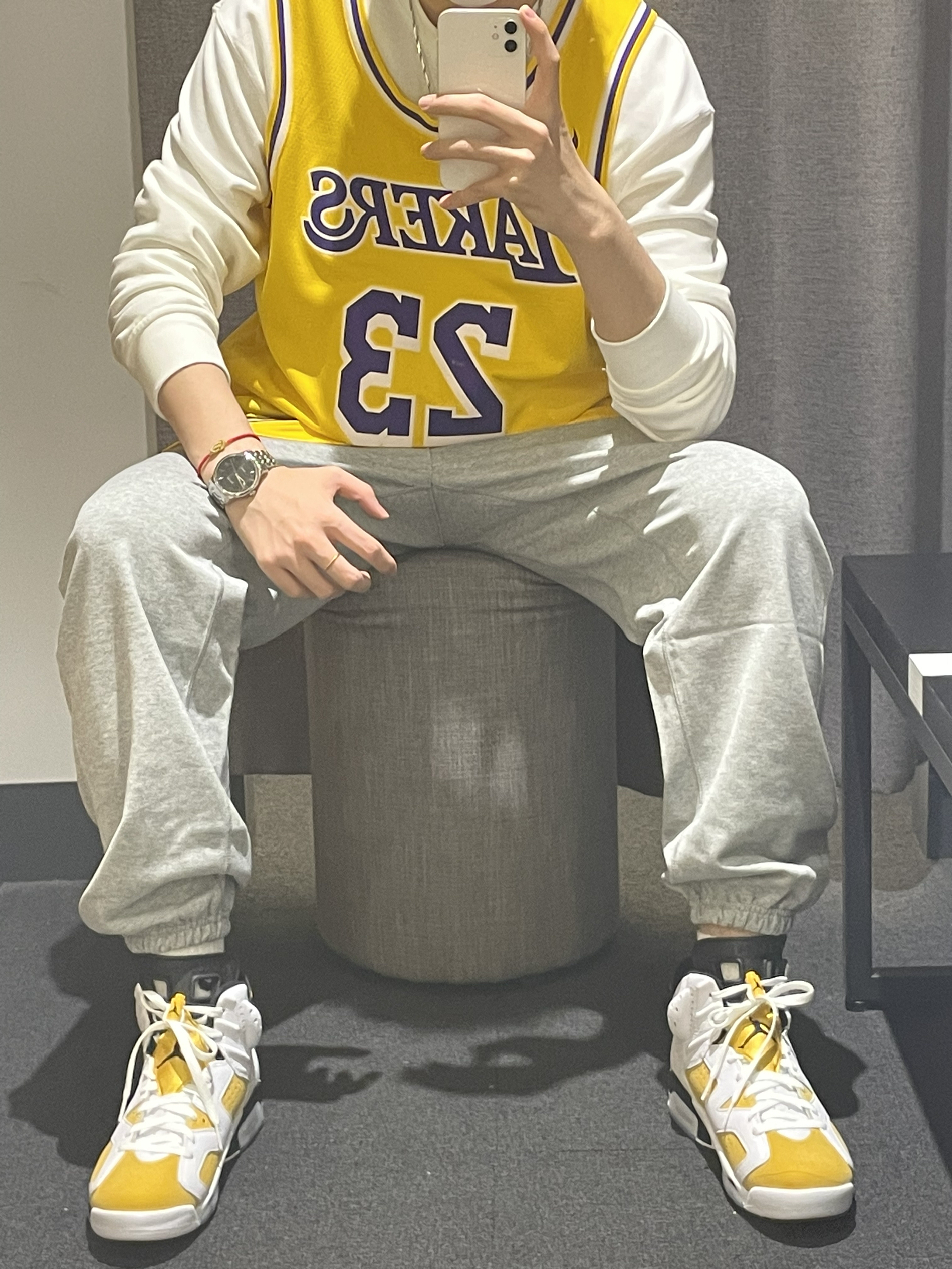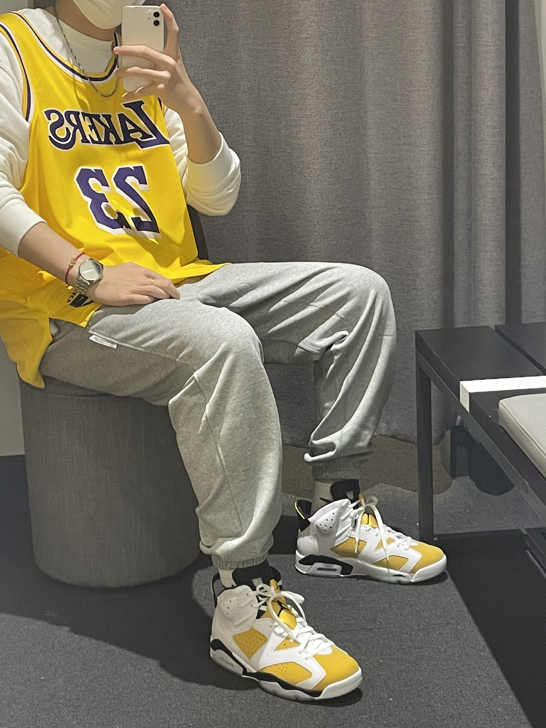 今天带来一双开售的Aj6大黄蜂🐝穿搭推荐!👀图 首先这件球服🏀进行叠穿 搭配白色基础卫衣 颜色上做出呼应 灰色白搭的精英长裤👖版型宽松 👟搭配aj6大黄蜂🐝配色 版型宽松 皮革材质