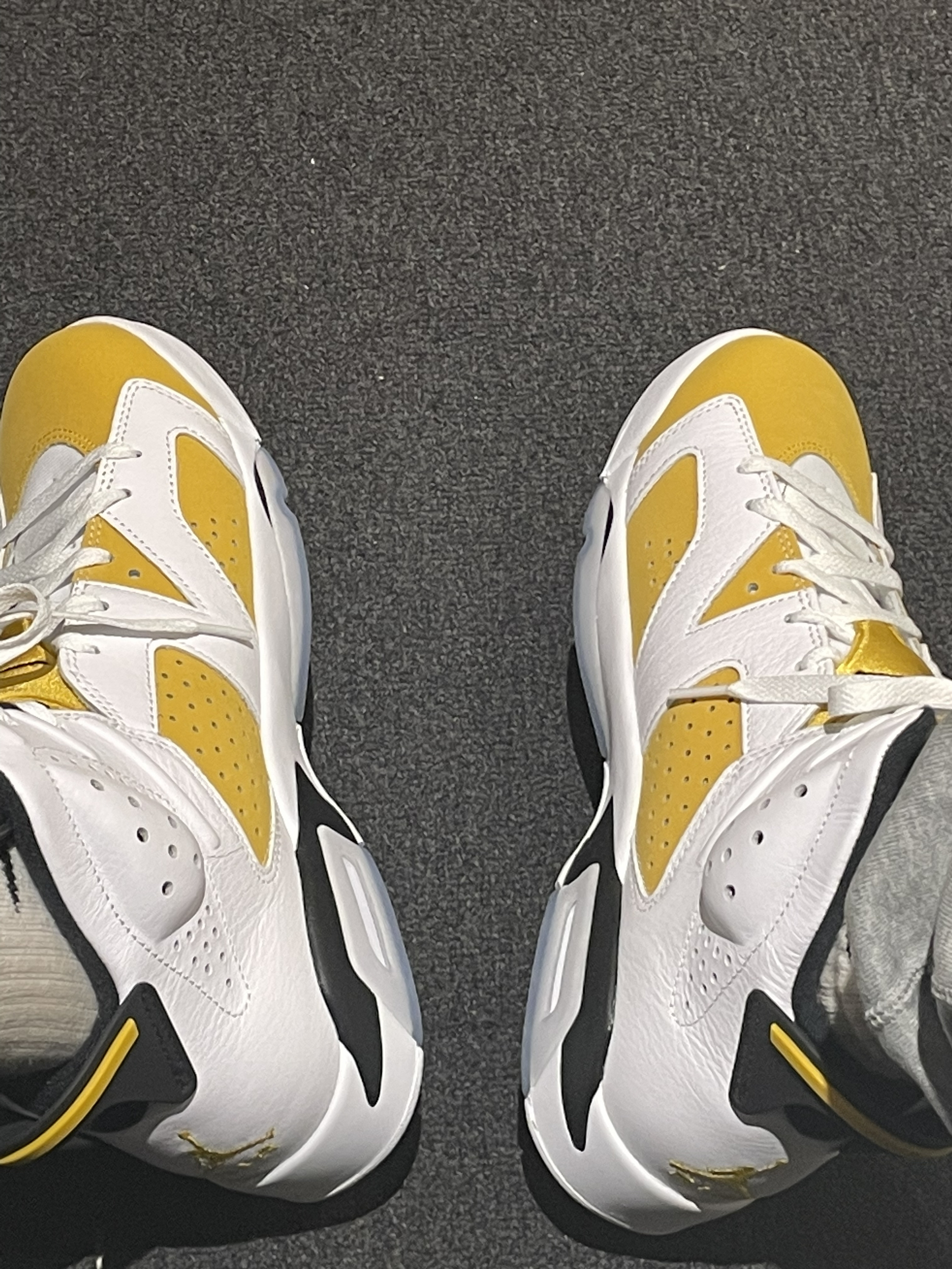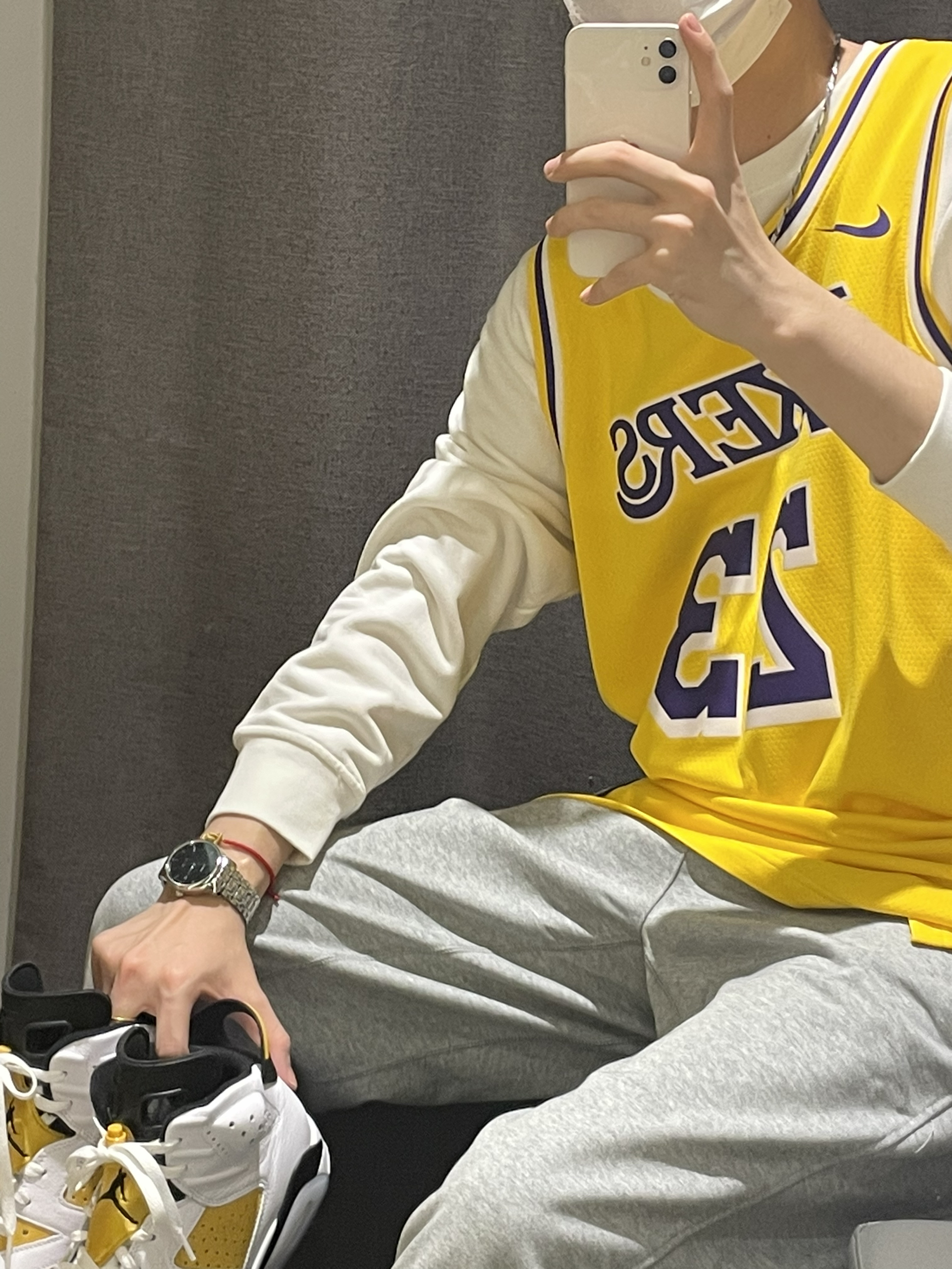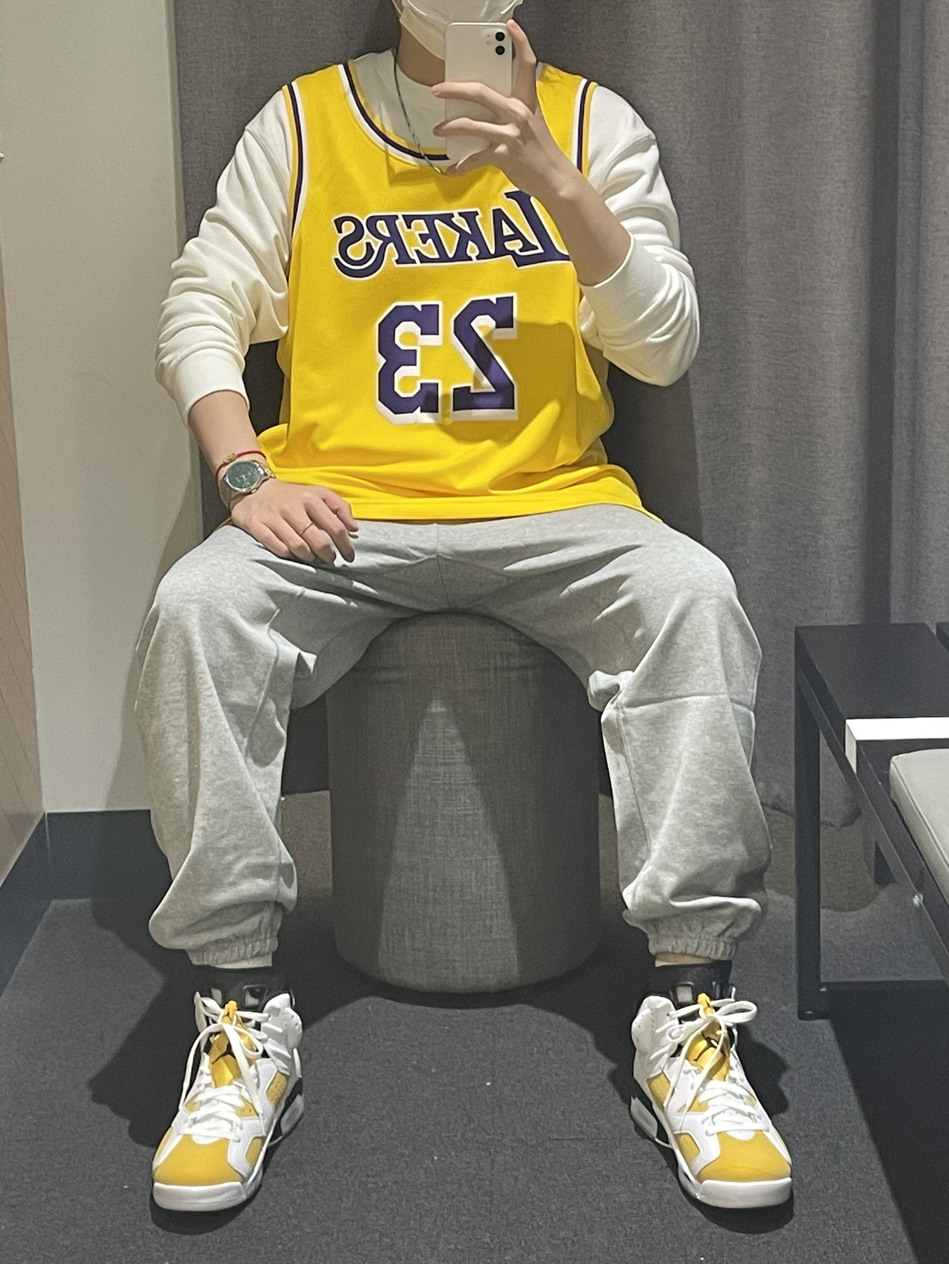 今天带来一双开售的Aj6大黄蜂🐝穿搭推荐!👀图 首先这件球服🏀进行叠穿 搭配白色基础卫衣 颜色上做出呼应 灰色白搭的精英长裤👖版型宽松 👟搭配aj6大黄蜂🐝配色 版型宽松 皮革材质