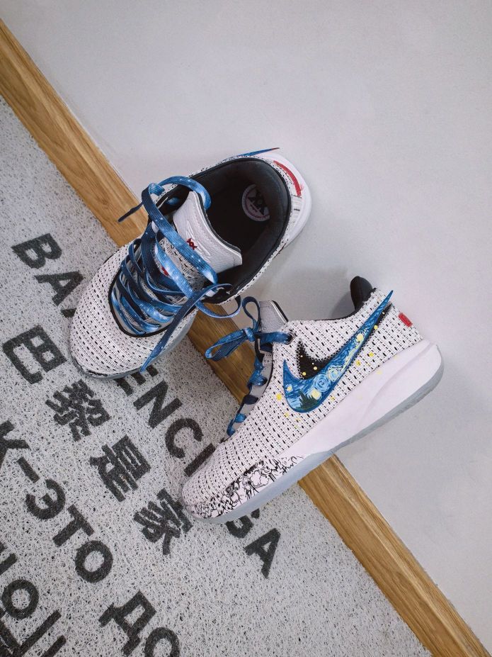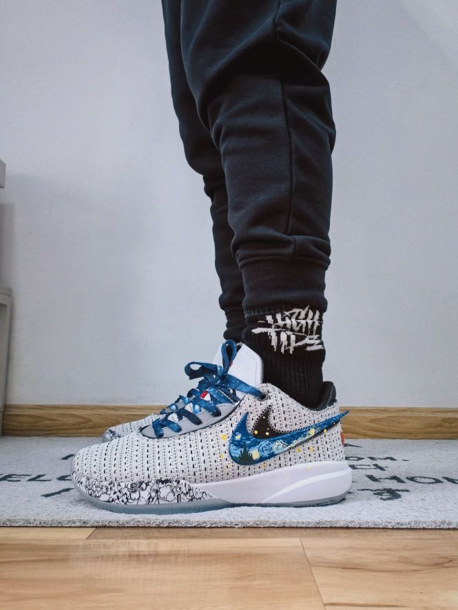 ➡️ 我的新年装备少不了詹姆斯系列 👟 大家好,我是粤雨 今天分享来自@潮鞋画师 的球场精灵系列 ☃️来自詹姆斯20的星空定制款,性能上保持了这款鞋的灵活性,在颜值上确实提升了不少,特别是原本的双勾设计加入了星空涂鸦,细腻有质感,再运用一些泼墨点缀撒下⭐,鞋带这次也适配星空色,打造出别致独特的艺术感 🔖鞋码按照日常篮球鞋即可