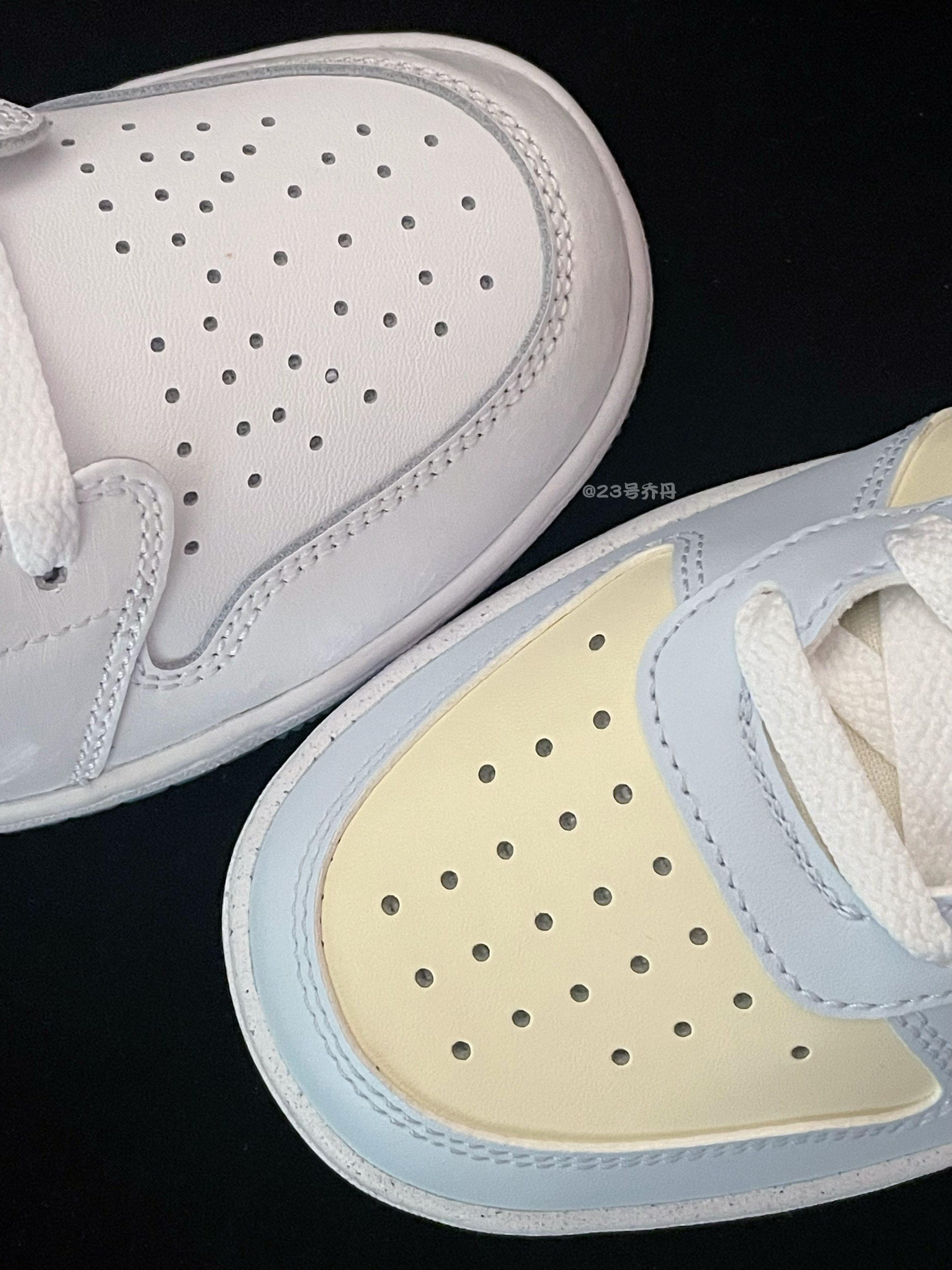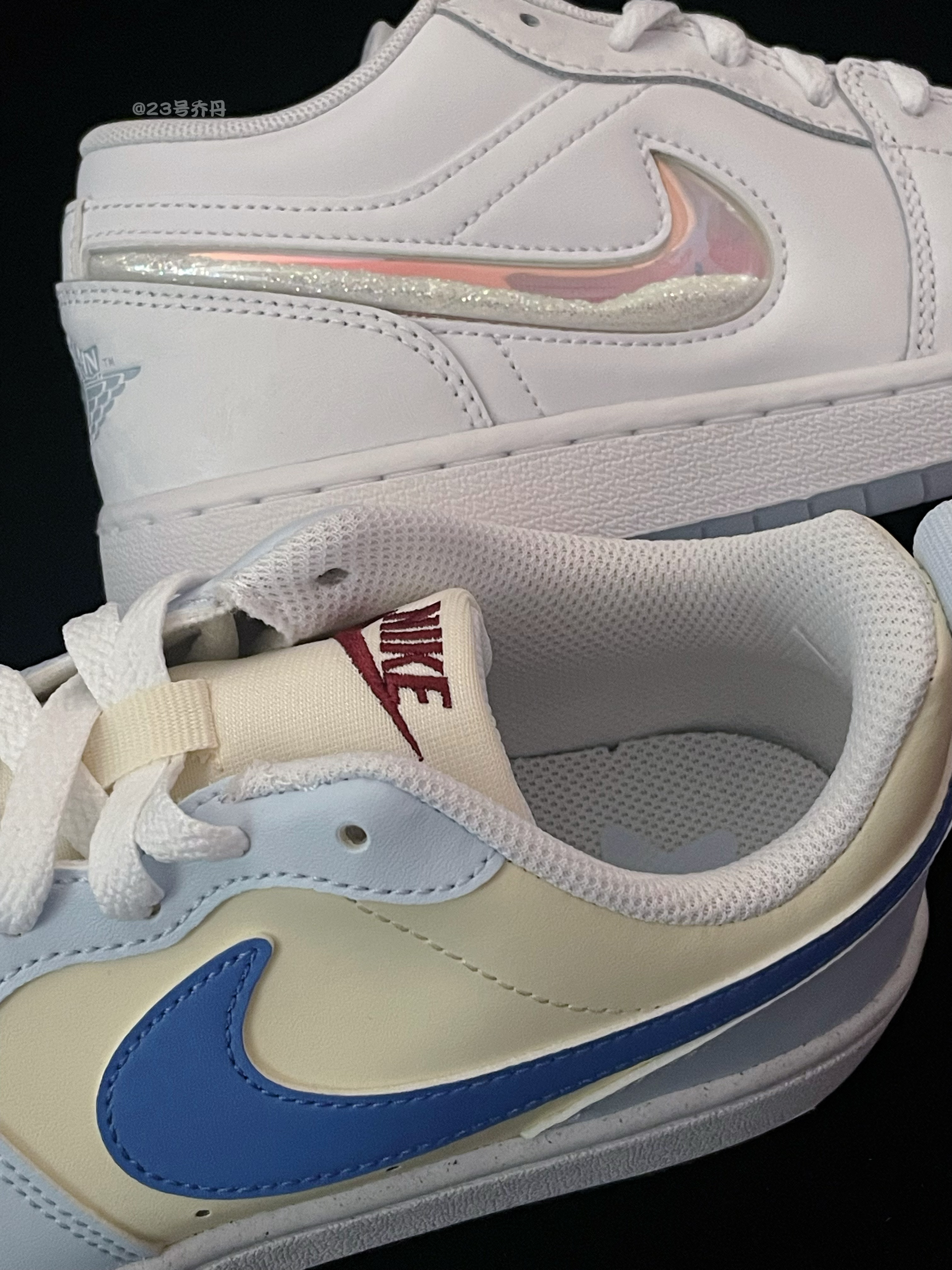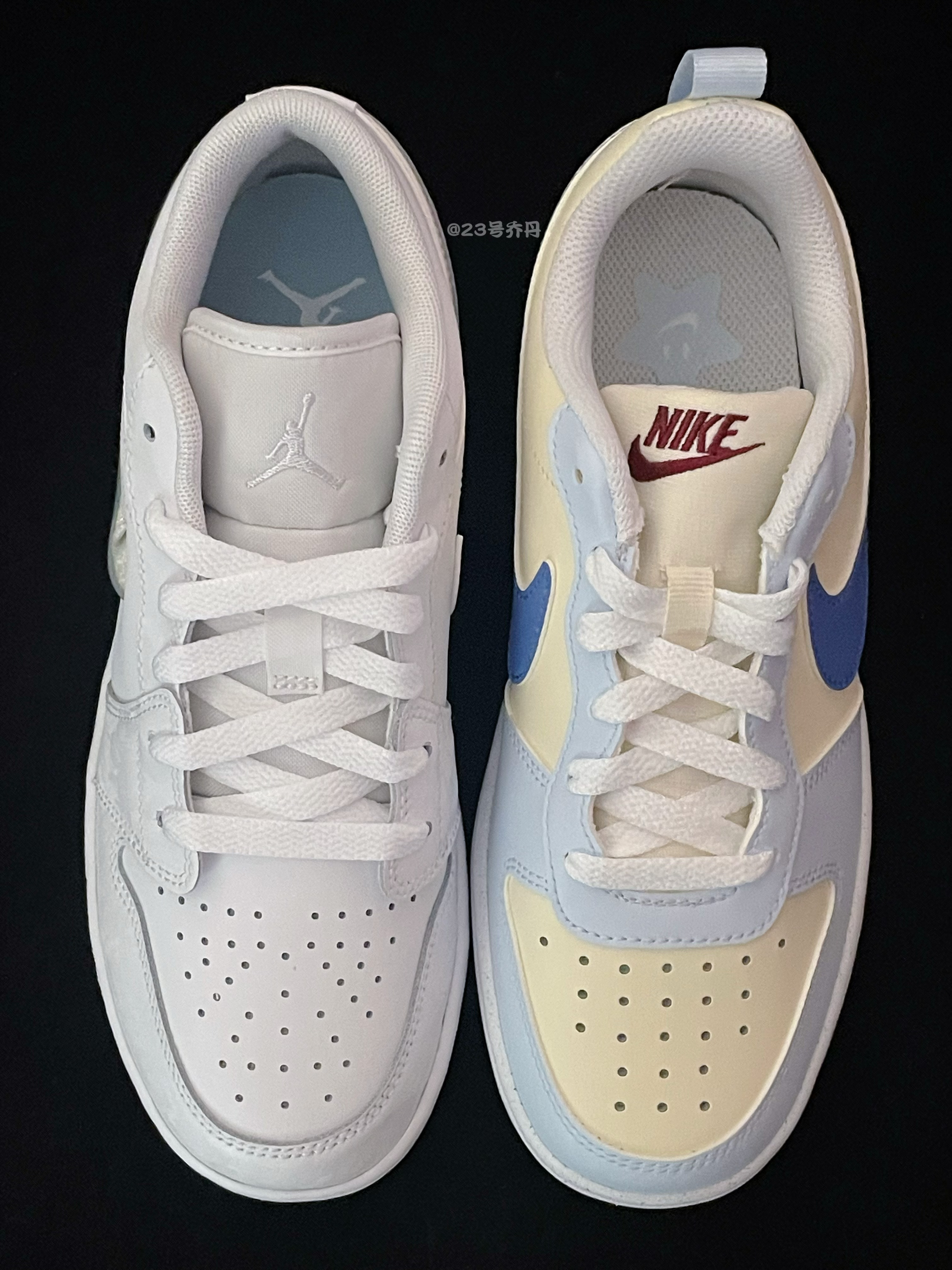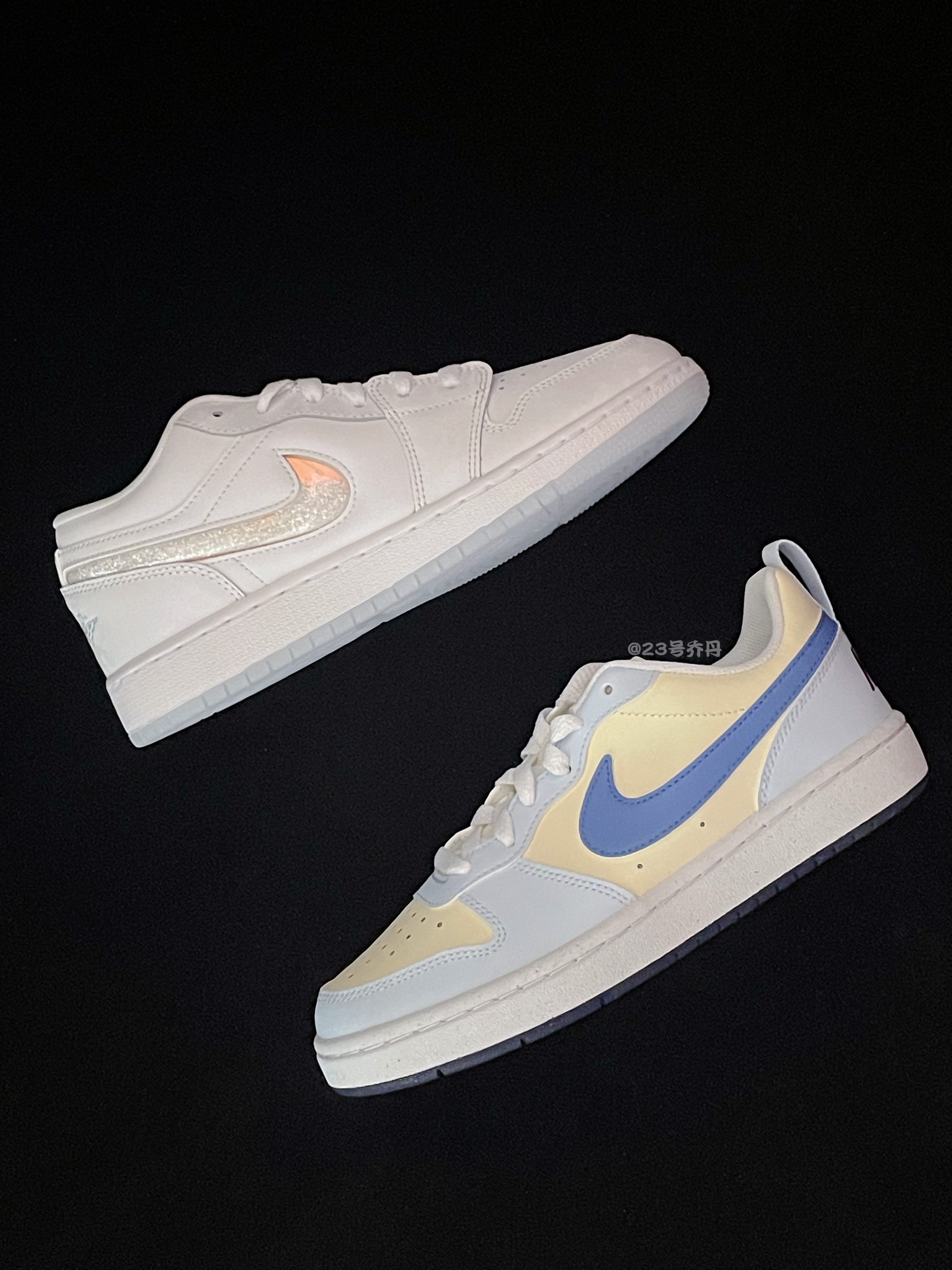 今天给大家分享两双颜值和性价比都不错的 Court Borough Low『蓝黄』 Air Jordan 1 Low『白色』冰雪奇缘 鞋款分别由椰奶色/雾霾蓝/紫蓝和白色搭配 鞋面大面积选用了易于打理的光面皮革材质 鞋头密集的透气孔保证了良好的透气性 白色中底有一定的增高效果 可有效修饰腿型 最后分别由深蓝色和冰蓝色大底收尾 『冰雪奇缘』鞋侧还设计有透明TPU的Swoosh 并且内含七彩流沙和炫彩...