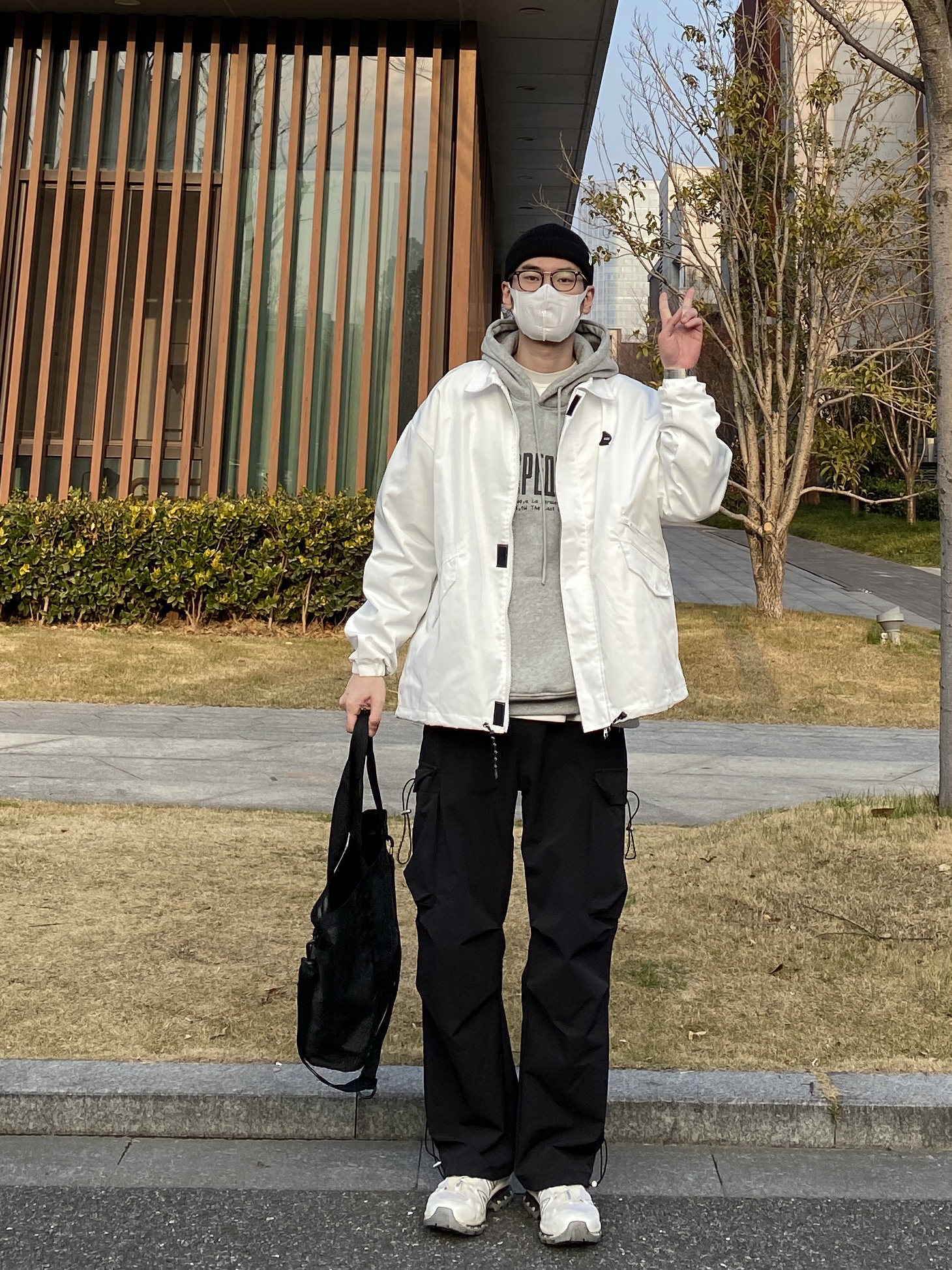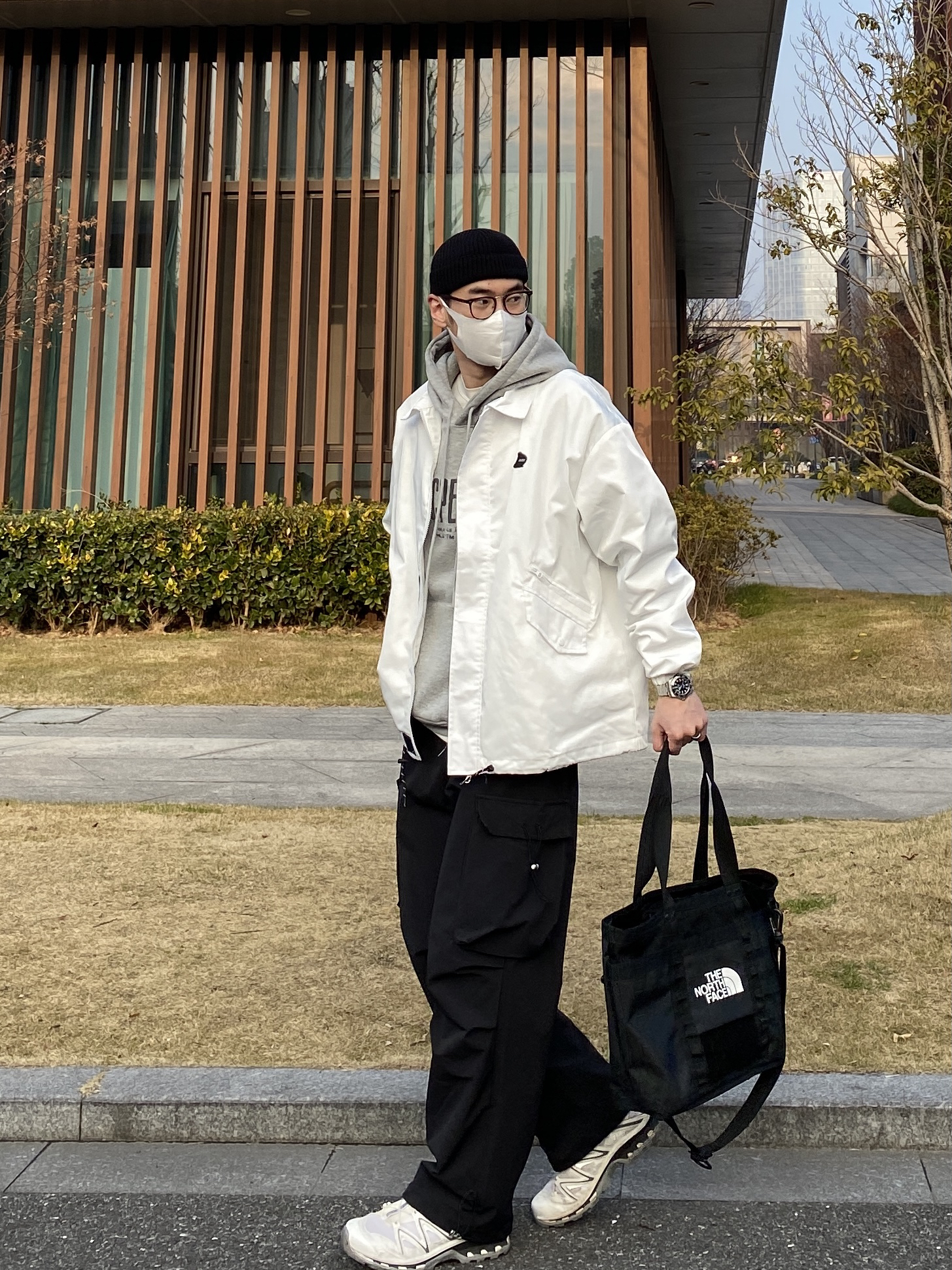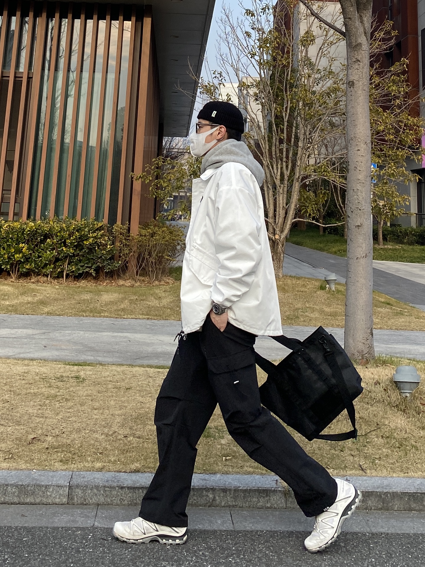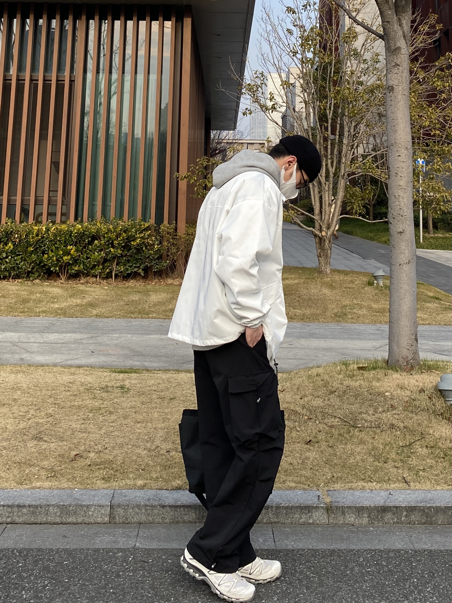 今天这套先用浅灰色字母连帽卫衣做内搭,裤子选择不挑腿型的黑色直筒抽绳系带多口袋伞兵裤,鞋子上脚清爽干净的白灰拼色萨洛蒙户外跑鞋,接着套上白色宽松阔版轻机能教练夹克,最后拿上北面防水托特包,OK,出门看看搭配效果吧! - 今日穿搭 衣服裤子:NICE LILI 鞋子:萨洛蒙xt-quest