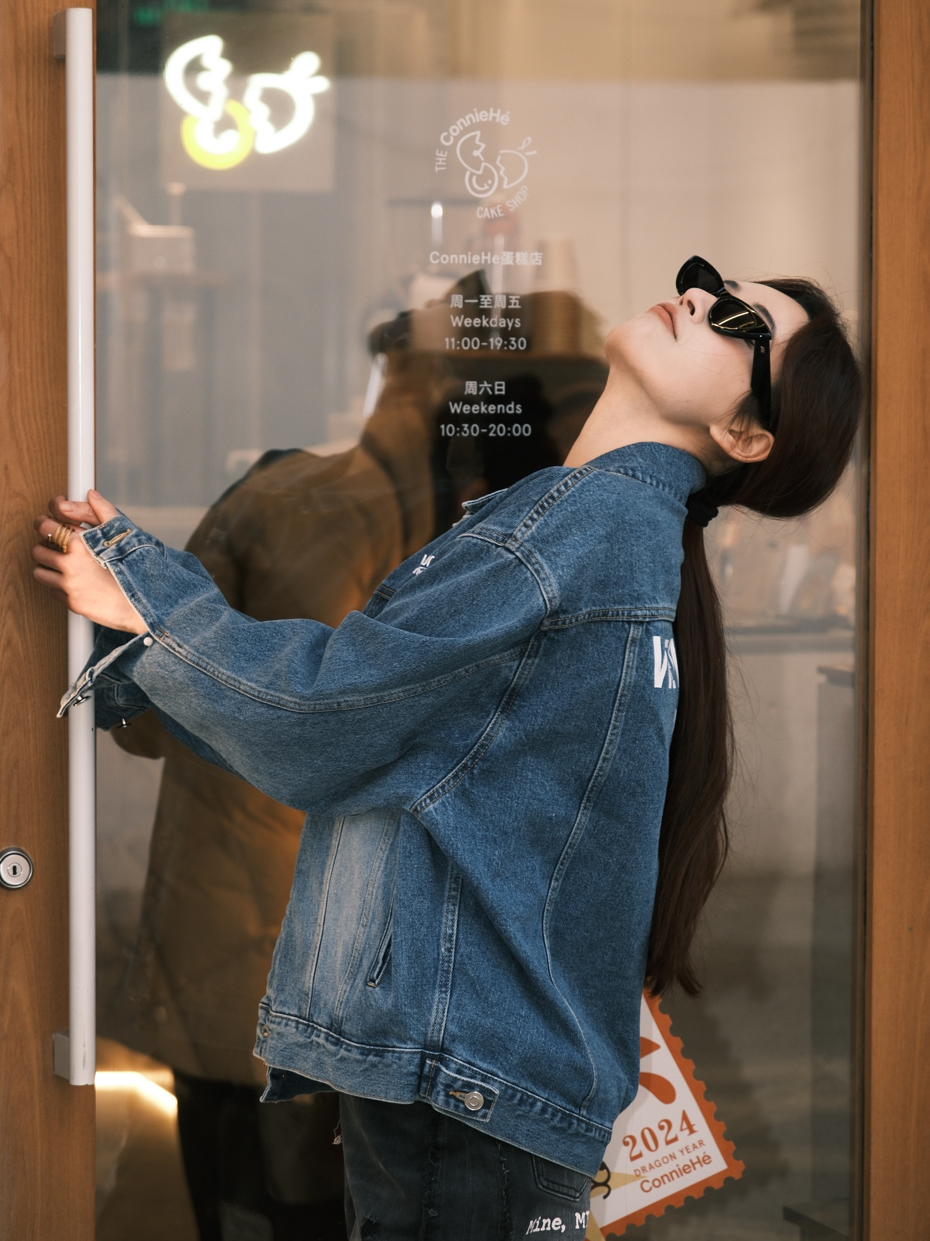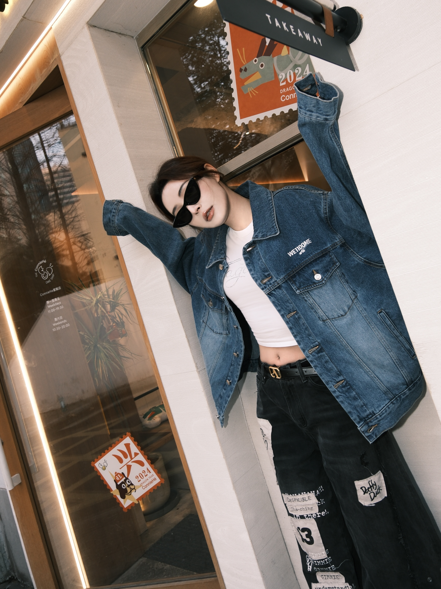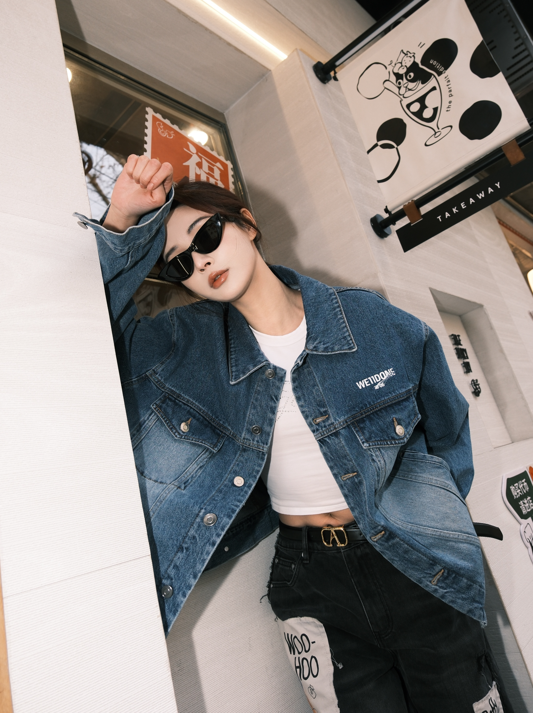 甜妹当久了总想尝试一些不一样的风格 比如说酷飒感十足的牛仔风 一件简单的蓝色牛仔外套直接让整个风格更加明显 深蓝色的配色 银色的扣子作为点缀 就是一整个松弛感爆棚 再搭配同面料的衣服 这样的一身出门上街 回头率都是100昏! 轻轻松松做一位有个性的女生 可能男生欣赏不了 但是女生一定会盯到目不转睛 过年穿这一身见朋友也很不错哦~ - 上衣:WE11DONE SS23牛仔外套