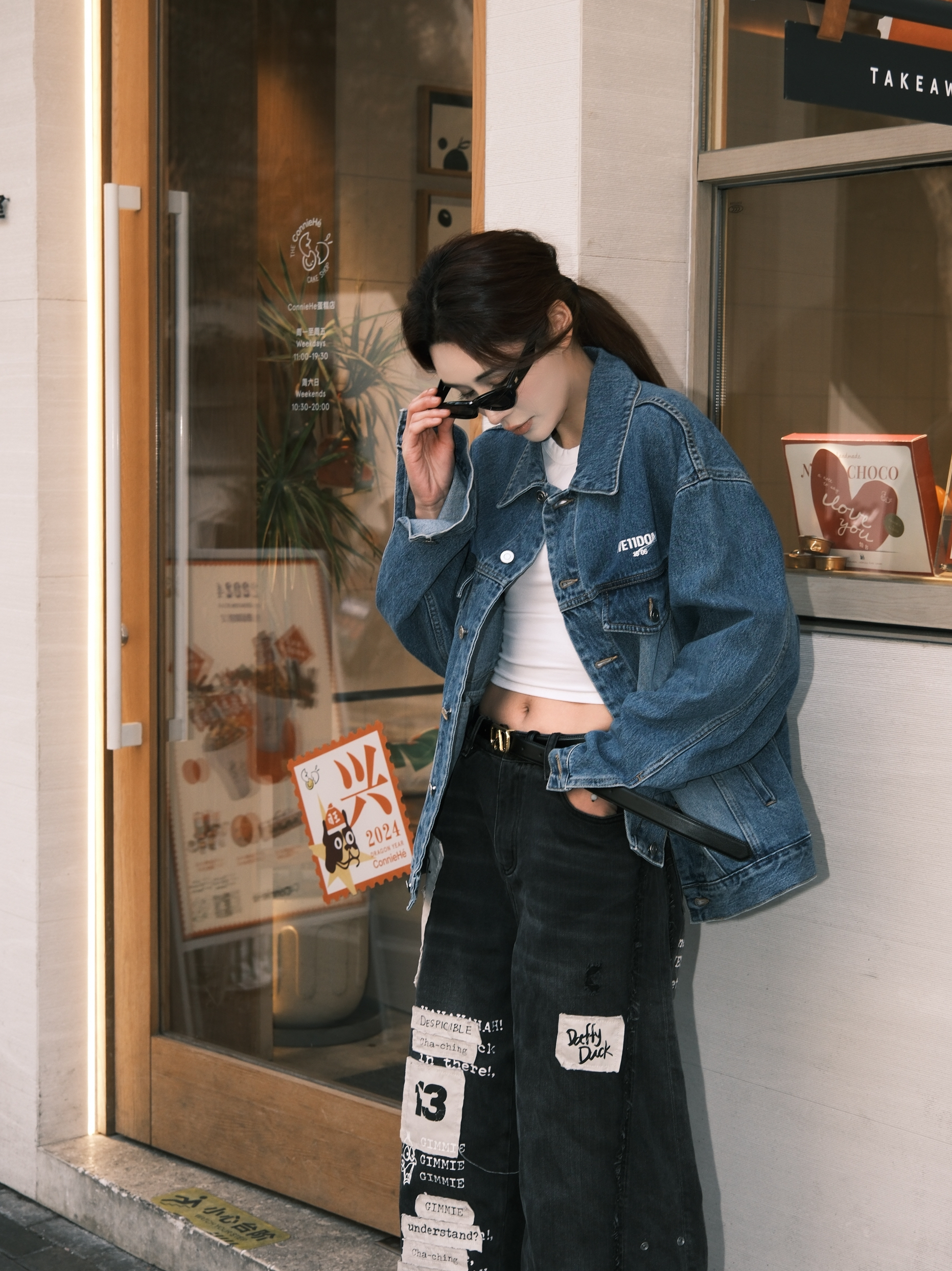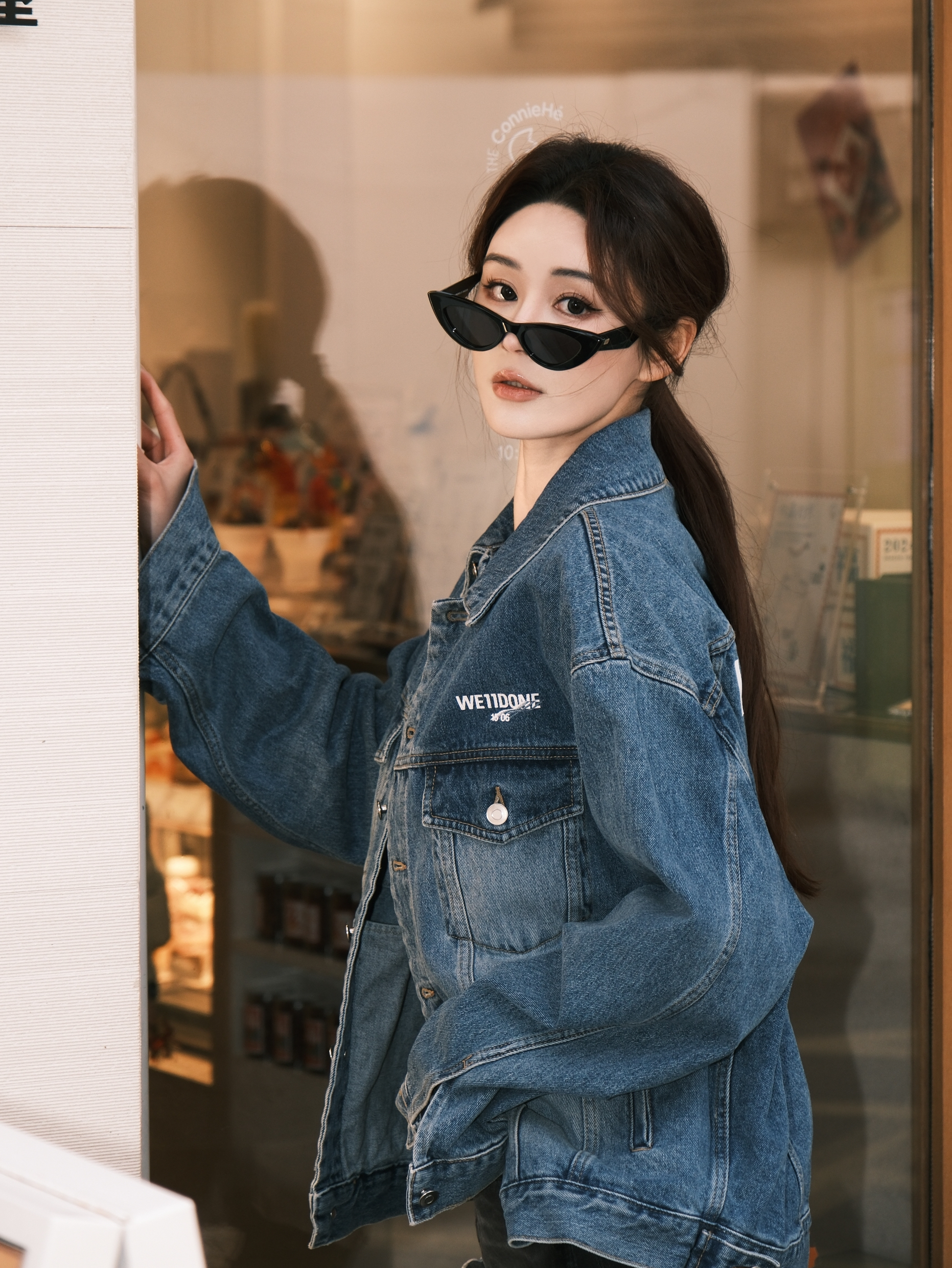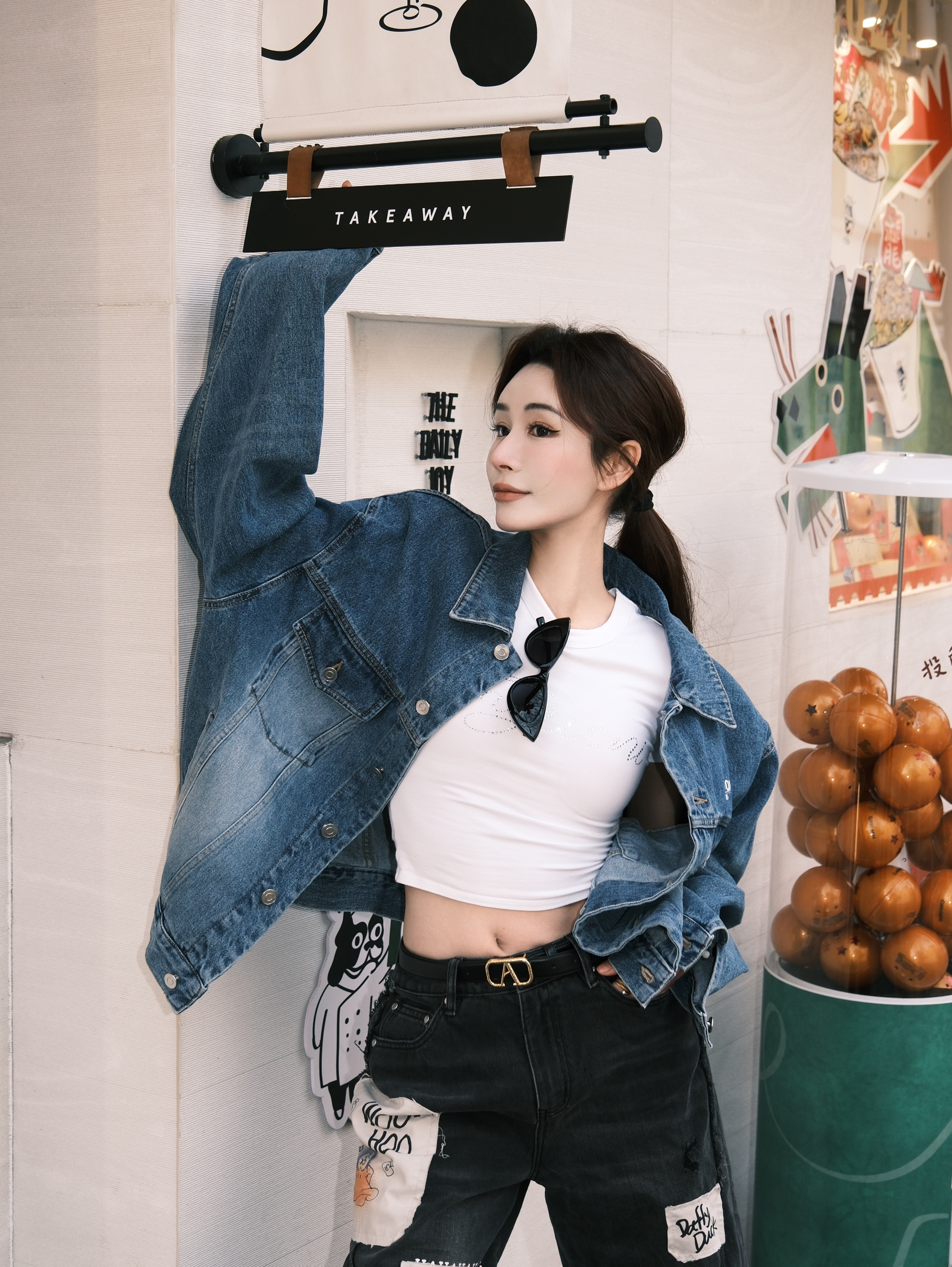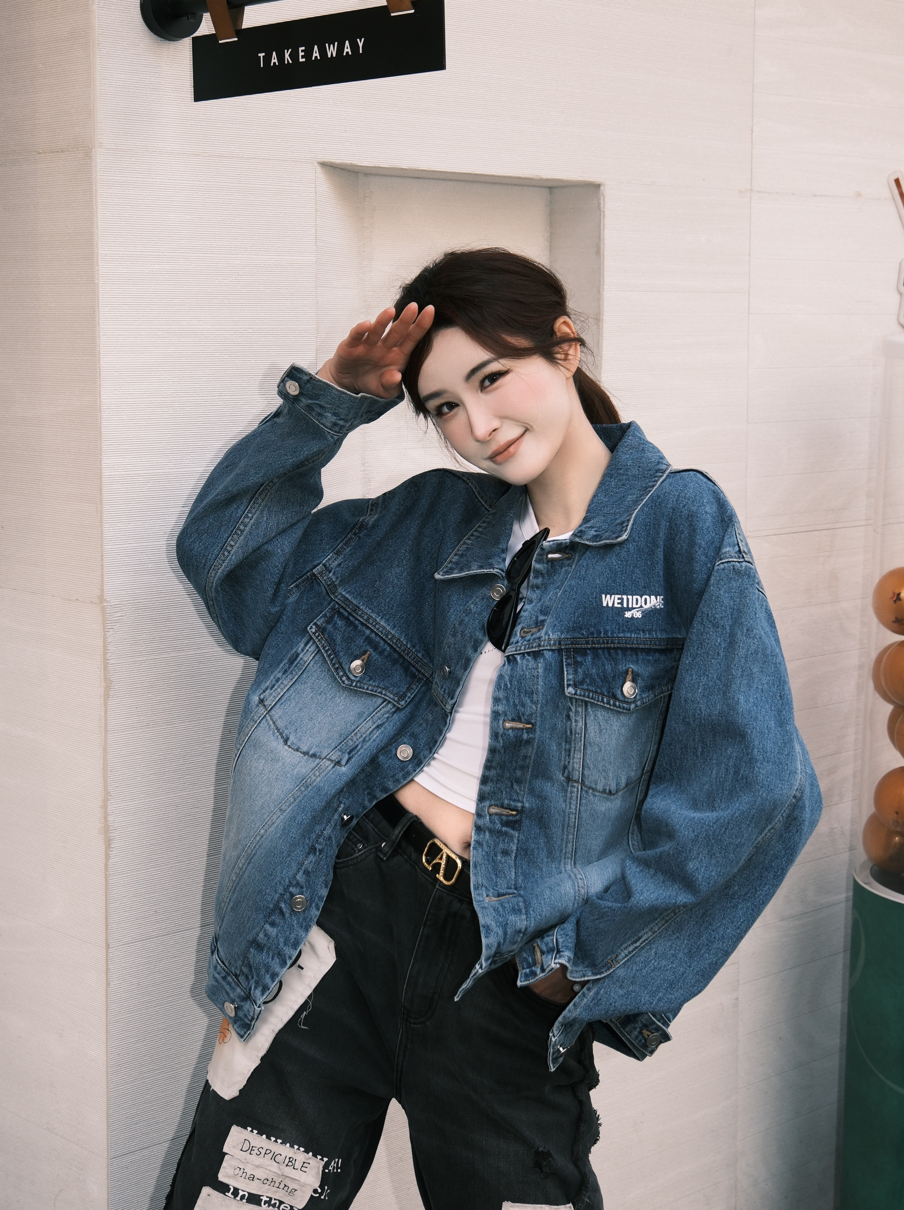 甜妹当久了总想尝试一些不一样的风格 比如说酷飒感十足的牛仔风 一件简单的蓝色牛仔外套直接让整个风格更加明显 深蓝色的配色 银色的扣子作为点缀 就是一整个松弛感爆棚 再搭配同面料的衣服 这样的一身出门上街 回头率都是100昏! 轻轻松松做一位有个性的女生 可能男生欣赏不了 但是女生一定会盯到目不转睛 过年穿这一身见朋友也很不错哦~ - 上衣:WE11DONE SS23牛仔外套