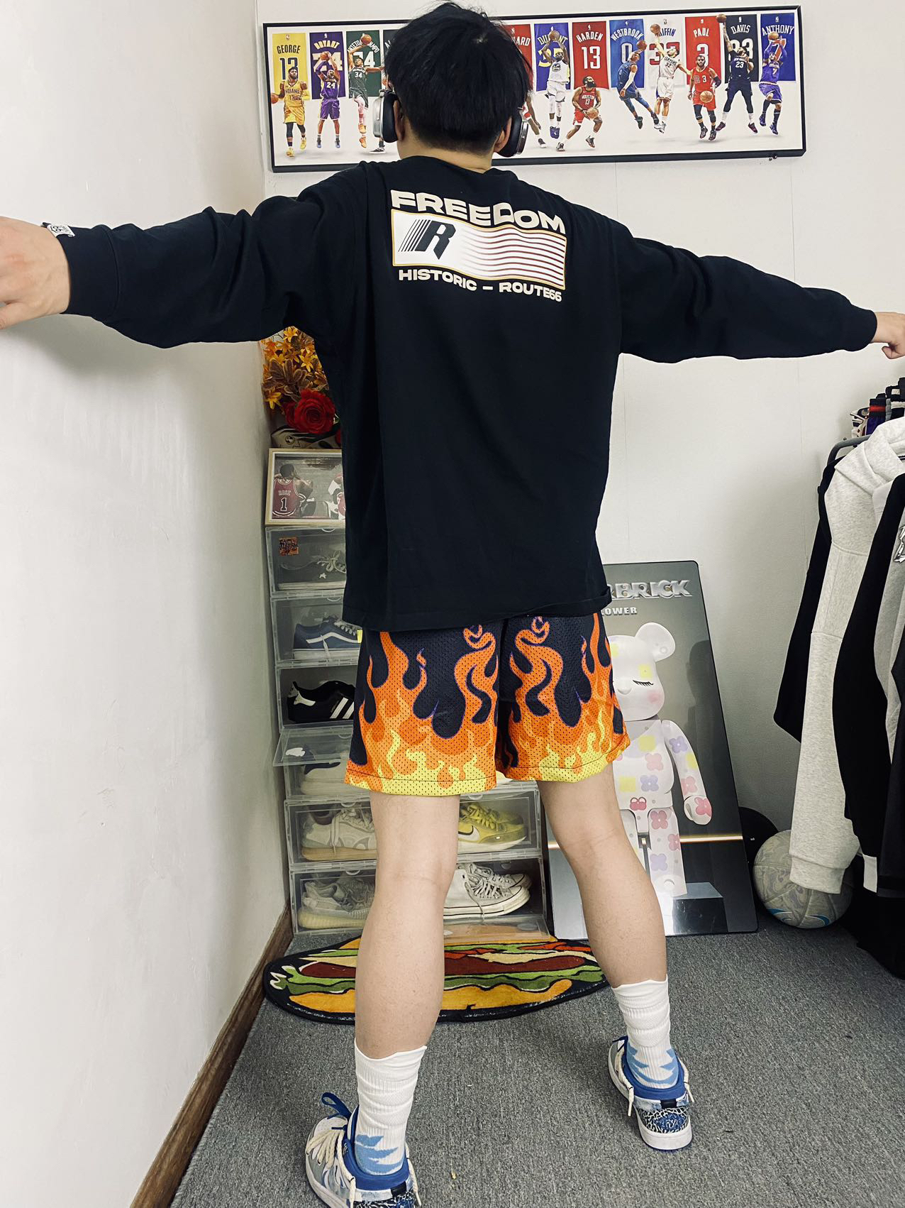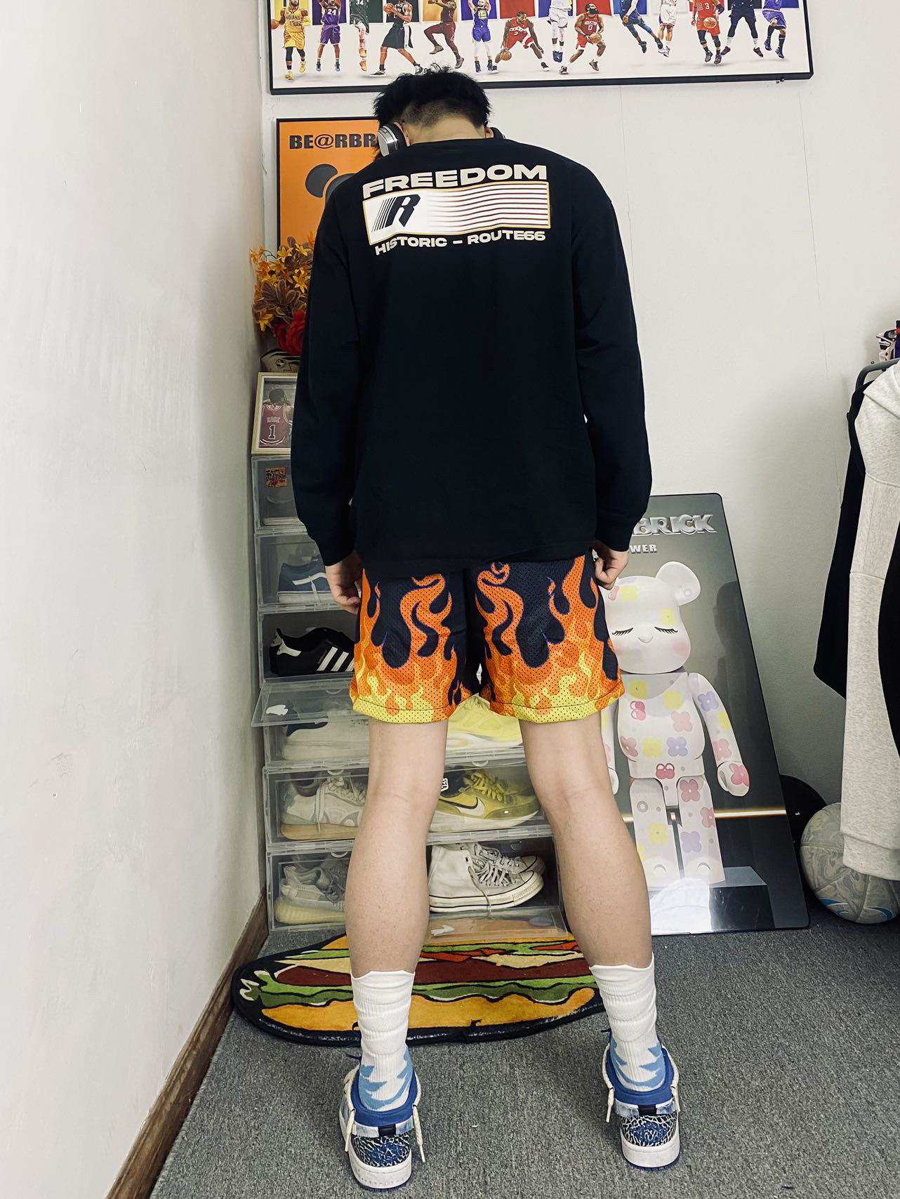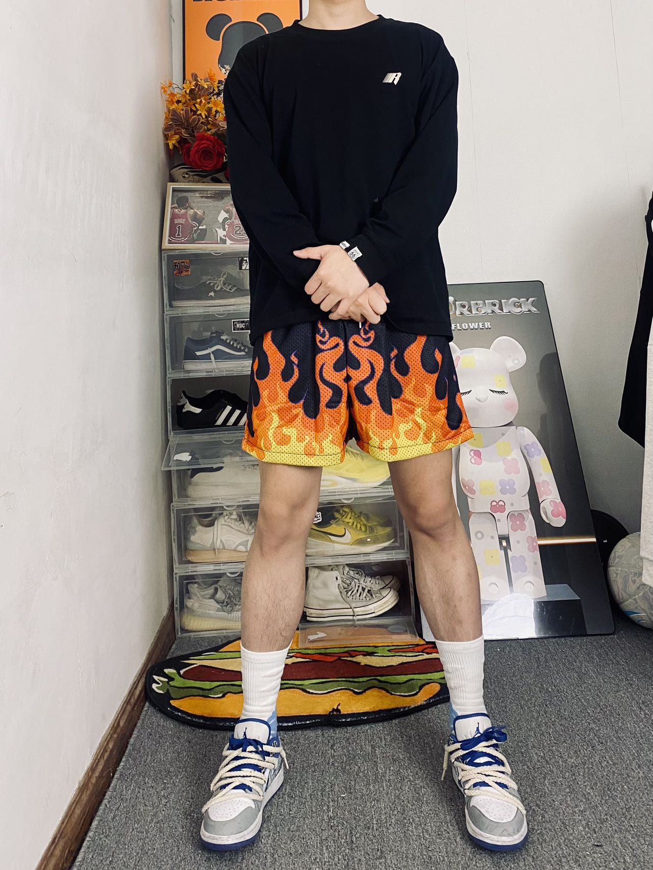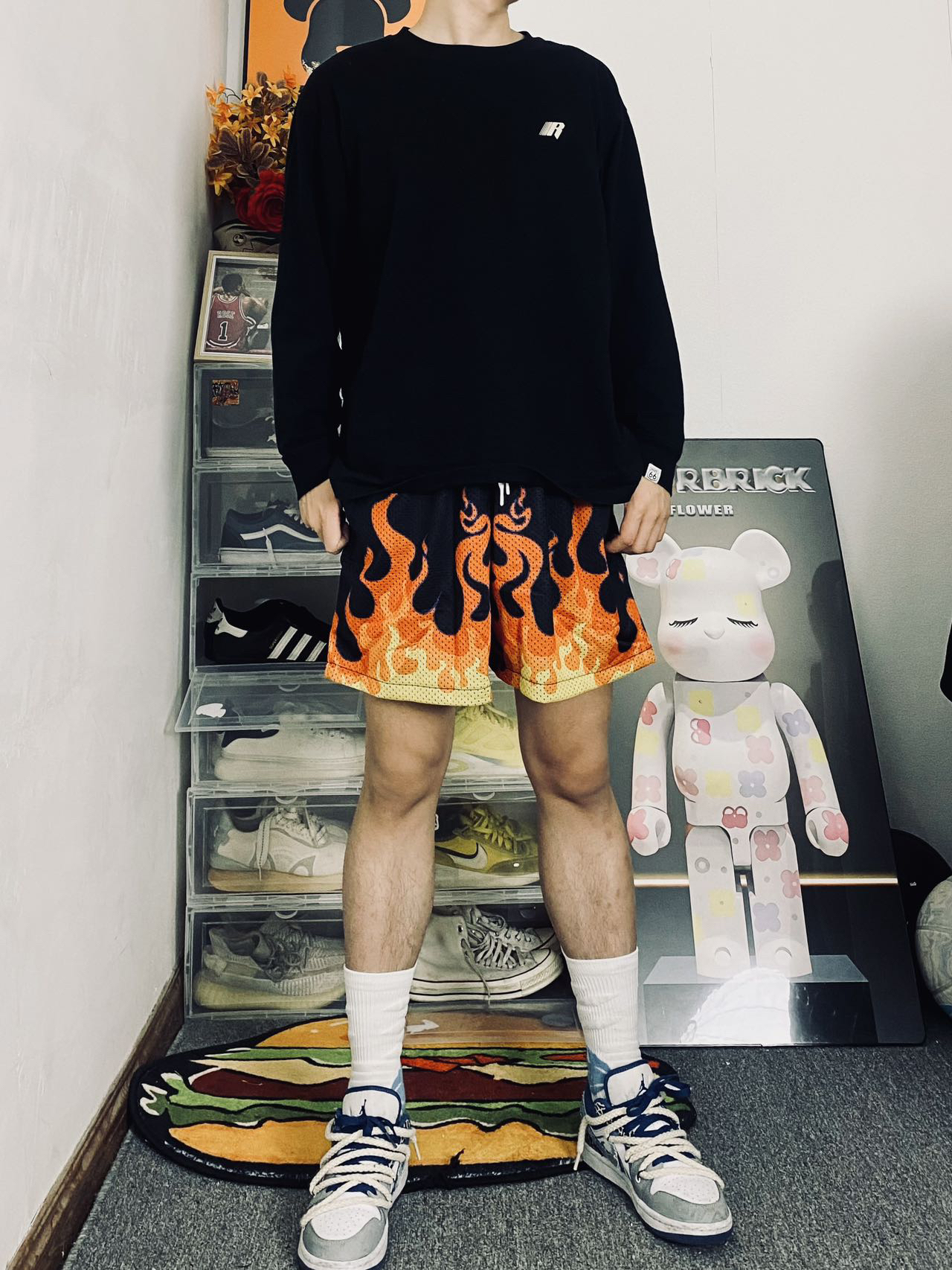🤳冰美式今日穿搭 👔衣服是一件黑色长袖衬衫 速干面料打球不粘身 宽松版型百搭🤳 — 👖裤子的话是一条slamble火焰印花短裤 透气面料加上毛巾圈裤腰整体百搭又透气 不管是跑步还是打球都是OK的🙊 — 👟aj1 定制款😁 本人身高178体重130斤 衣服裤子选择的都是xl 这是我的上身效果 大家可以参考一下