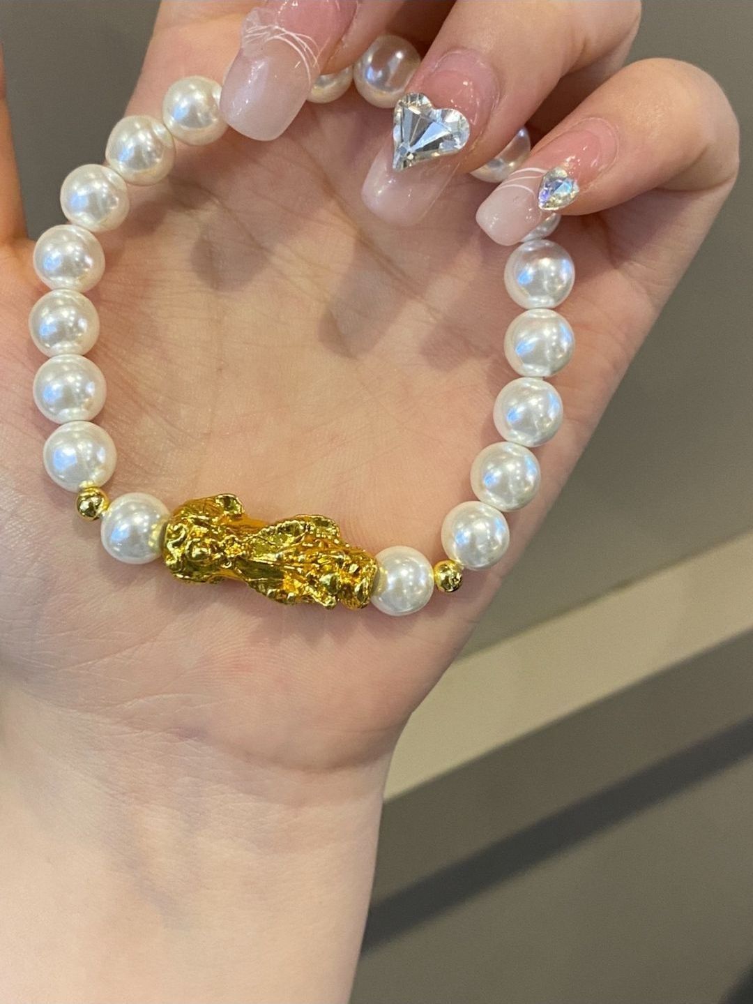 😣中国黄金 貔貅珍珠足金手串 🍿🍿🍿🍿不需要多介绍就知道这貔貅宝宝多可爱了寓意着"纳福"的吉祥物💊💊 男女都可以佩戴哦还能搭配情侣手链 手链是珍珠真的非常高级了 貔貅宝宝的搭配寓意很好🎻🎻🎻 旁边还有四个小珠子的点缀~更显精致富贵好好看,单戴也好看🚵🏻🚵🏻