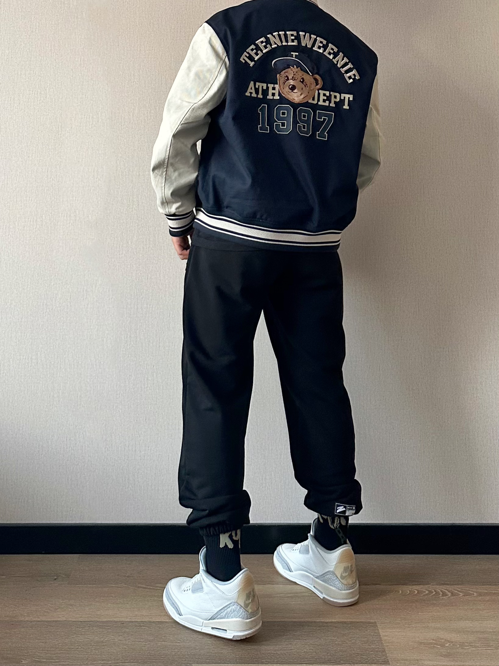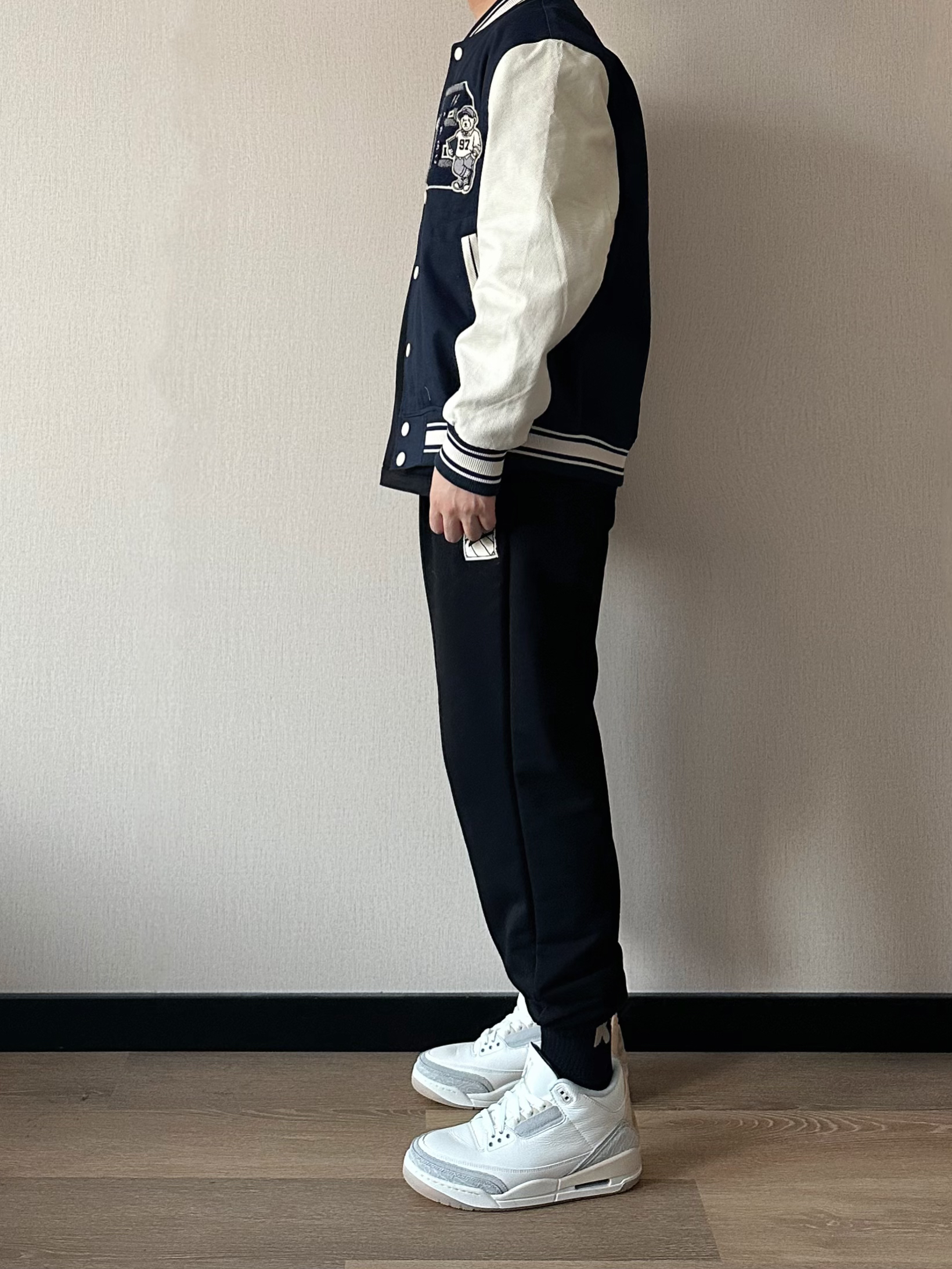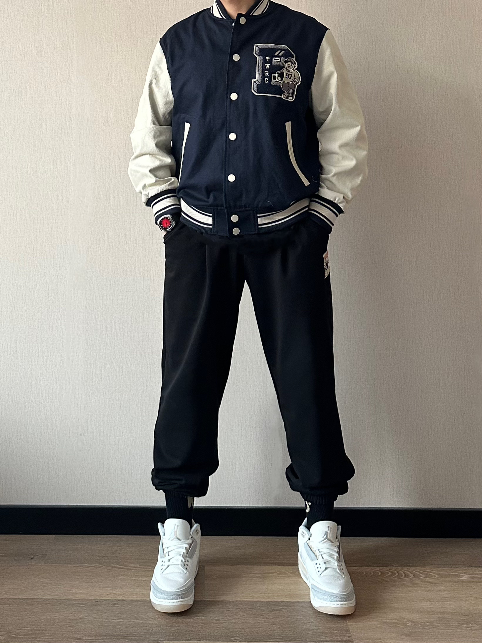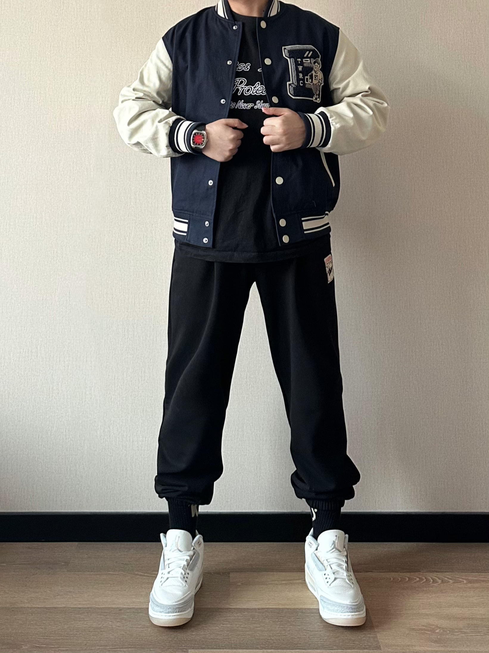 ✨外套👔选择复古刺绣小熊🐻棒球服 上身蛮显阳光☀️帅气的 刺绣工艺,看上去很精致 裤子👖选择束腿休闲裤 束腿的锥子感,再搭配AJ3 露出袜子 格外的显的腿长🤣 👔176/75 L 👖176/75 XL 非常宽松 👟正常尺码 今日搭配 偏暗一