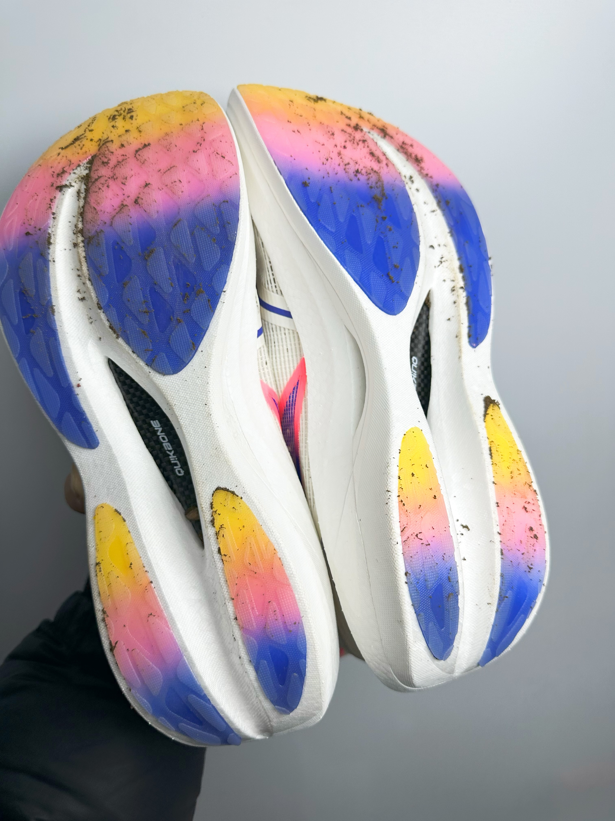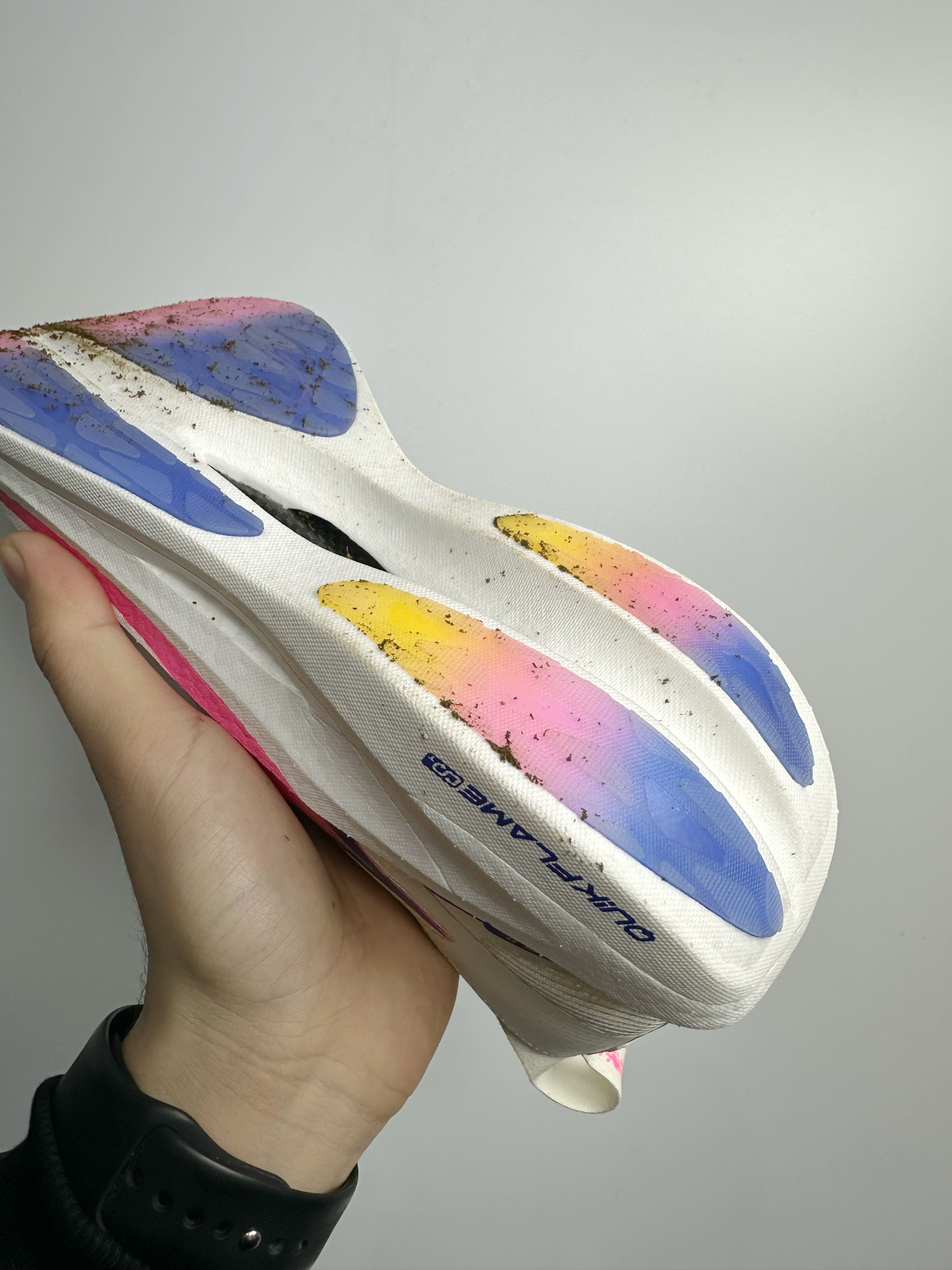 飞燃2.5代是一双低门槛碳板跑鞋,不过目前价格偏贵一些 ✅优点 性能脚感:相较于上一代2.0,鞋面从从纱面升级为了编织鞋面,个人觉得是提升了透气性和穿着舒适性。 中底延续了2代的超临界发泡的材料缓震+开窗的物理缓震,内嵌一整块全掌碳板,跑起来的推动感很强。不过个人感觉脚感是比较偏硬的,没有2代那么软。 入门门槛不高,虽然作为碳板跑鞋,但我觉得6分配都能驾驭。 颜值还是非常高的,这双是亚运会...