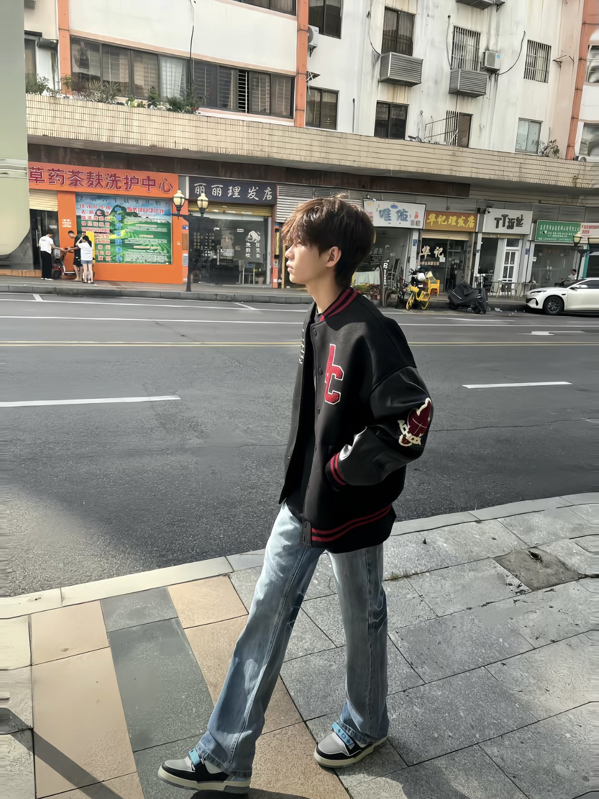 春季这款棒球服外套简直帅呆了男女同款在搭配上高街牛仔裤简直酷必了哇!!!身高|体重: 🧍♂️ 穿搭风格:中性风 👔 上衣:棒球服杏色 👖 下装:高街牛仔裤 👟 鞋子:顽刻