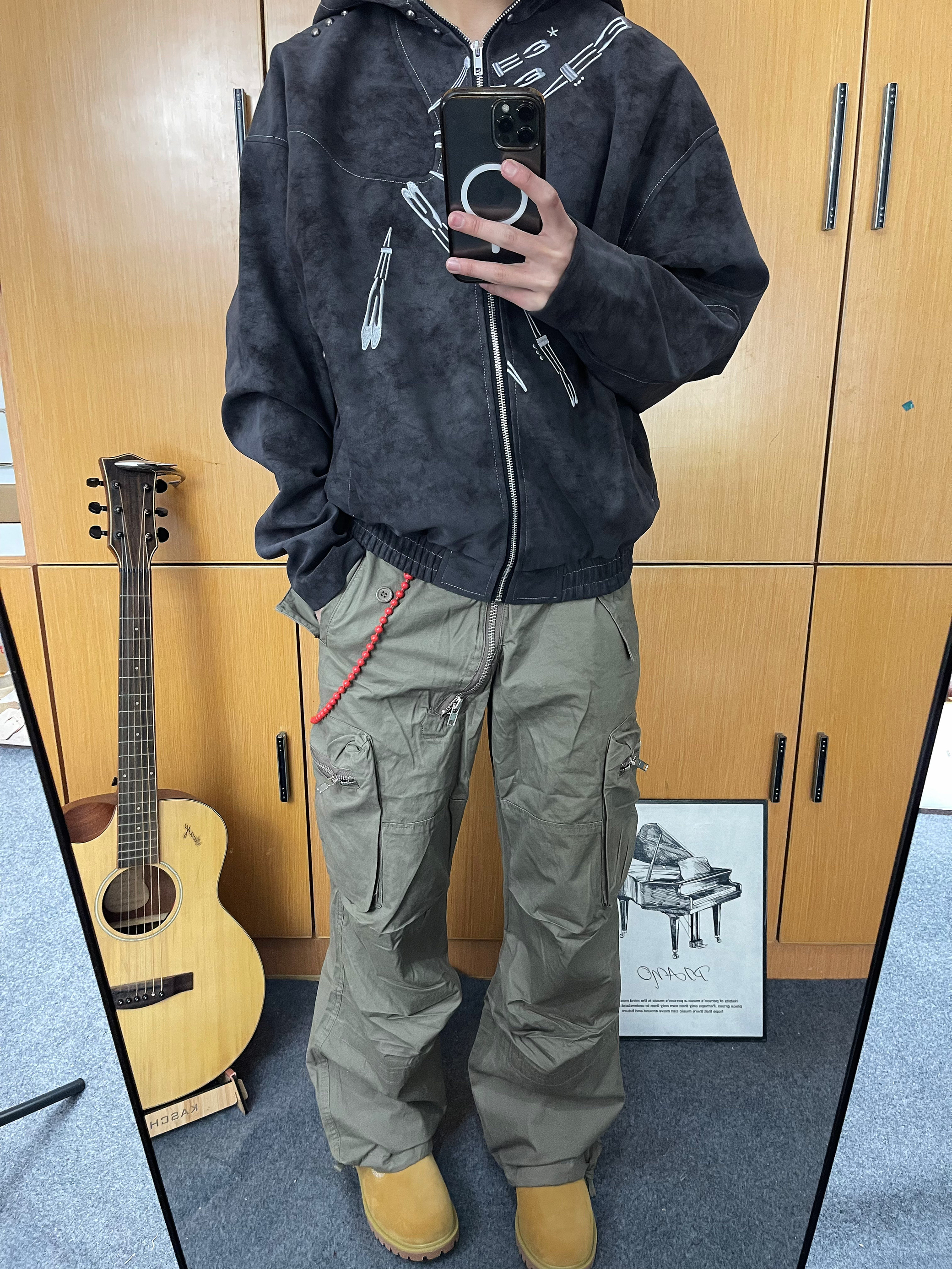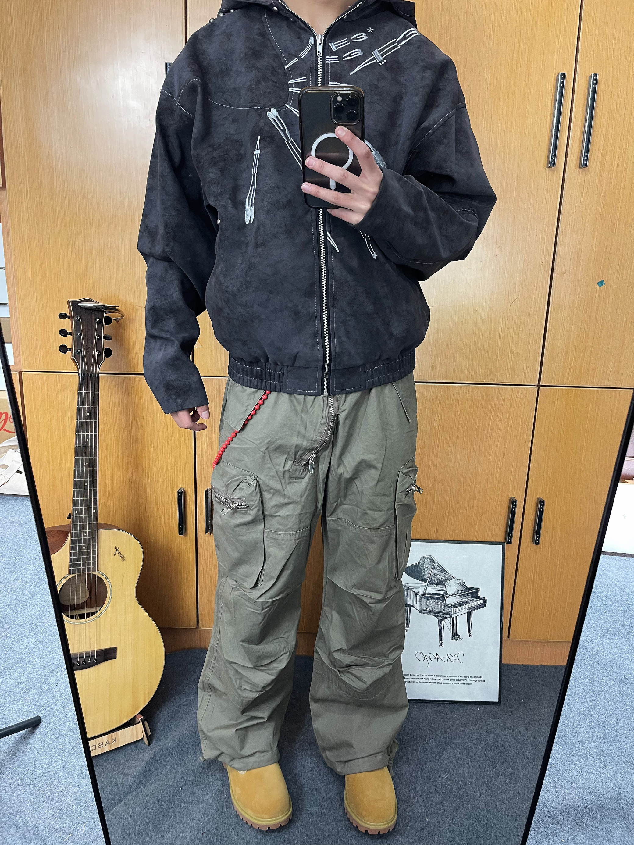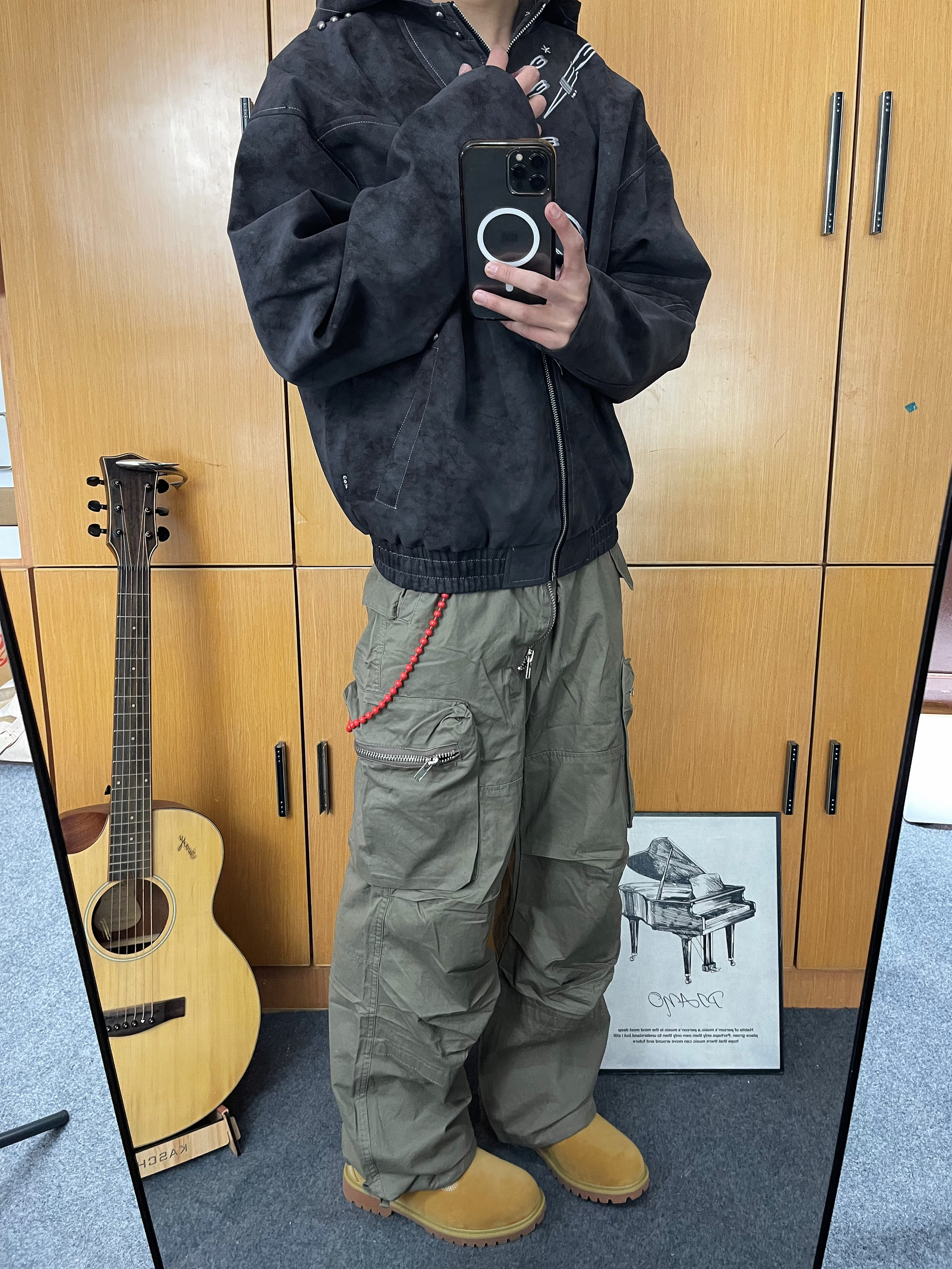 今天上身一件染皮废土风夹克 下身到一条工装裤 鞋子选择马登的大黄靴