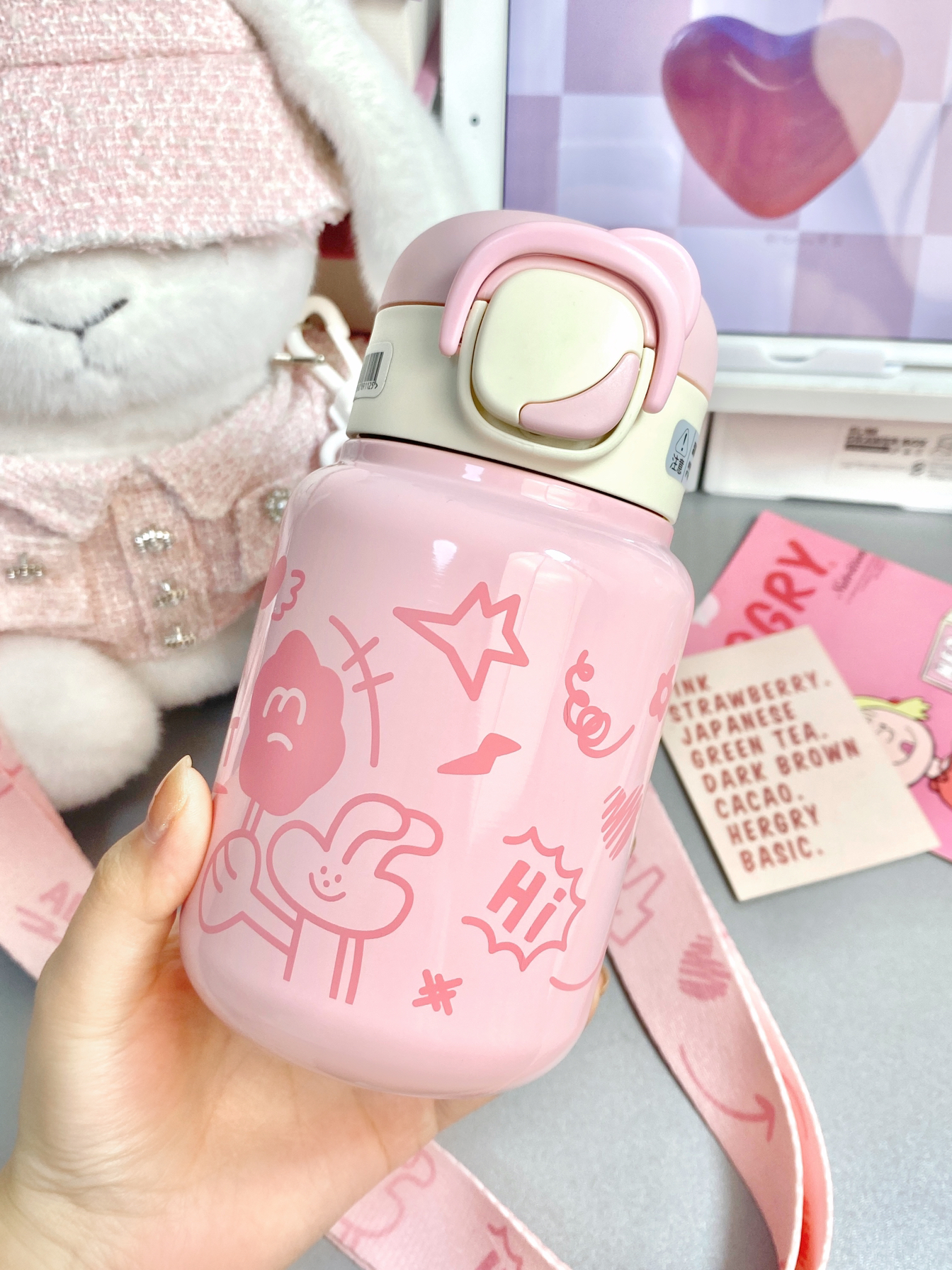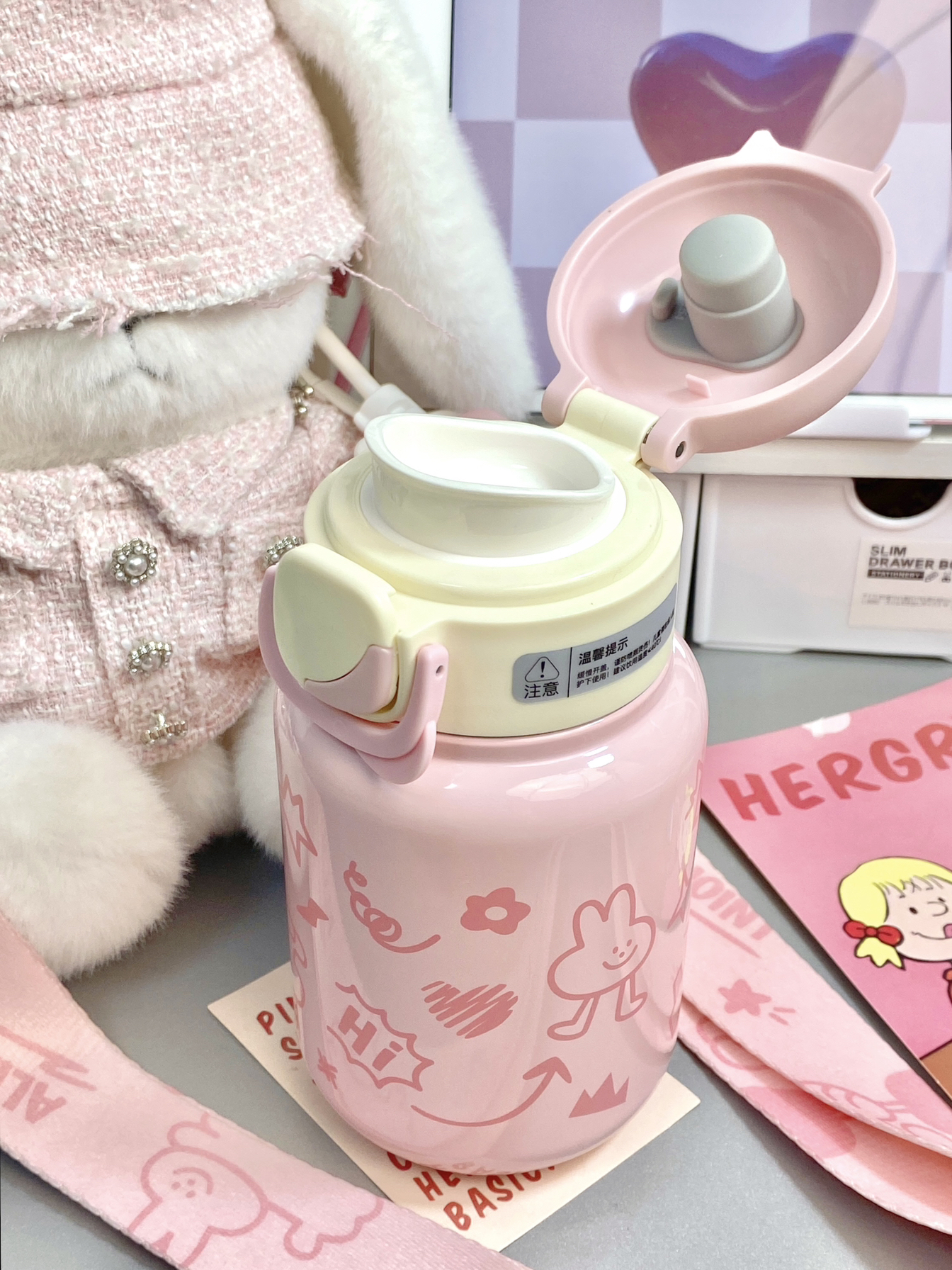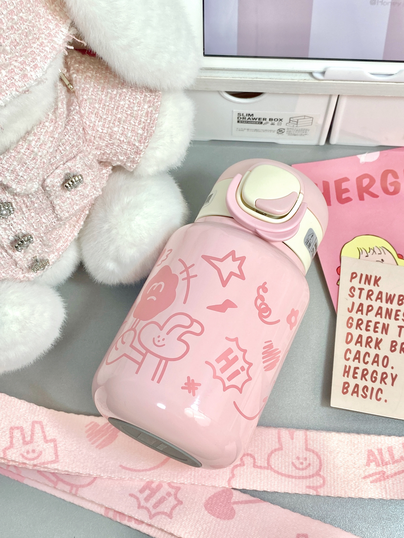 平常不爱喝水的本人 买了可爱水杯以后真的会经常喝水 粉嘟嘟的是公主用的吧~ 420ml的容量适合随身携带 而且是316不锈钢内胆 保温效果还不错 还配了小香风的兔兔玩偶和肩带 可以把水杯放进去 出门一整只背上就蛮方便哒~ 用来送女朋友送闺蜜都ok